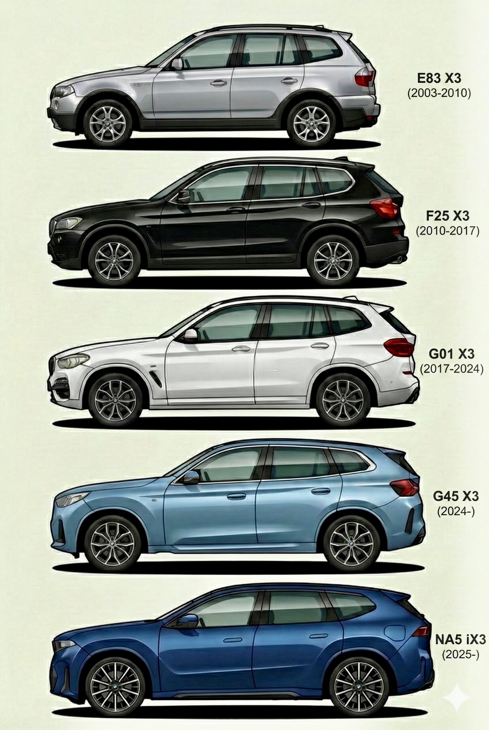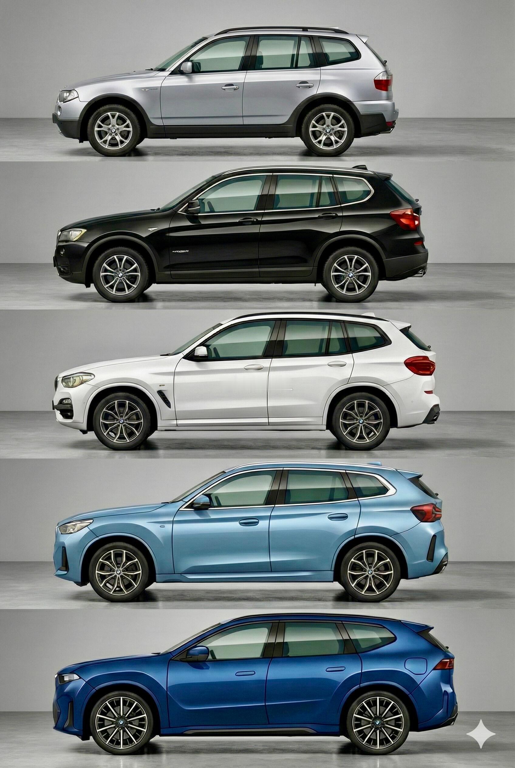 四代宝马X3对比 明显看出尺寸增长 设计演化,2003年宝马推出X3时,那时还是紧凑SUV(4565mm),但随后尺寸就猛涨,第三代X3的尺寸(4708mm)已经全面超越了初代X5(4667mm),按以前的标准是妥妥的中大型SUV,初代X3的紧凑型SUV的生态位已经由X1代替了。这种车型逐年增大的现象Autobesity,汽车肥胖症。厂家之间互相竞争,增加尺寸和配置,消费者也更有面子,但道路停车场等基本设施都是十几年前甚至几十年前的。不过说实话,宝马在变大领域算是很克制的品牌,那些美式全尺寸已经大到有点反人类了。没办法,适度的大是为了舒适,过度的大就是为了填补内心的某种缺失了。宝马x3