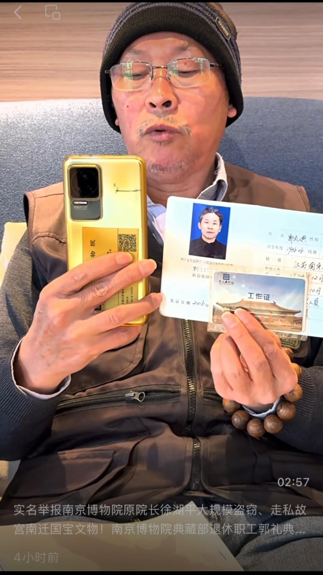南京博物院40多人联名举报南京博物院前任院长徐湖平! 南京博物院退休员工郭礼典手持工作证在视频中实名举报前院长徐湖平大规模盗窃故宫南迁文物,指控其撕毁抗战时期库房封条、伪造鉴定倒卖国宝并压制举报17年。 徐湖平被指控在1980年代任职副院长期间,擅自撕开南京朝天宫库房内封存故宫南迁文物的抗战时期封条,非法转移2211箱(约10万件)国宝。 具体操作包括伪鉴定牟利链,指使专家将真迹标为“赝品”,低价转入其主管的江苏省文物商店。 又过拍卖公司等渠道将真迹给拍卖掉,从而谋取巨额利益,为躲避制裁徐湖平还通过各种方式寻求保护。 以至于2008年有40多名人员共同签字的举报信,最终石沉大海没有下文。这一次《江南春》画卷被拍出8,800万元的天价,大家才发现这幅画作从南京博物院馆藏文物中消失了引发了全民的关注。 南京博物馆拿出来的证据也表明确实将《江南春》这幅画当做成假画从馆藏文物中剔除。拍卖公司上的《江南春》,基本上可以判定为当年庞家捐赠给南京博物院的画作,因为画作上有历代收藏人的印章,还有历代收藏人的题跋。 既然现在已经关注到了这个事情呢,不如再把这个东西给彻底查一遍,只有一查到底才能看出来到底有多少问题。大众也需要了解到更多的真相,这需要更高级别更权威的部门进行调查。 也期待这个事情经过调查之后能够水落石出,大量的文物也能被顺利追回。各位是怎么看的?欢迎评论区留言。