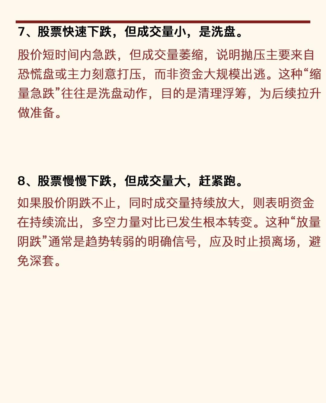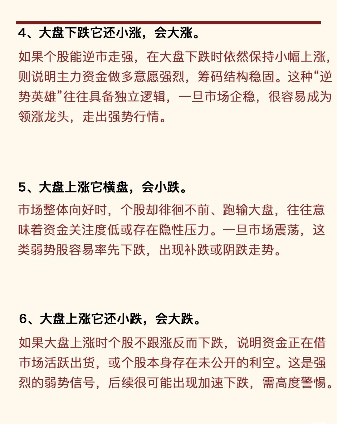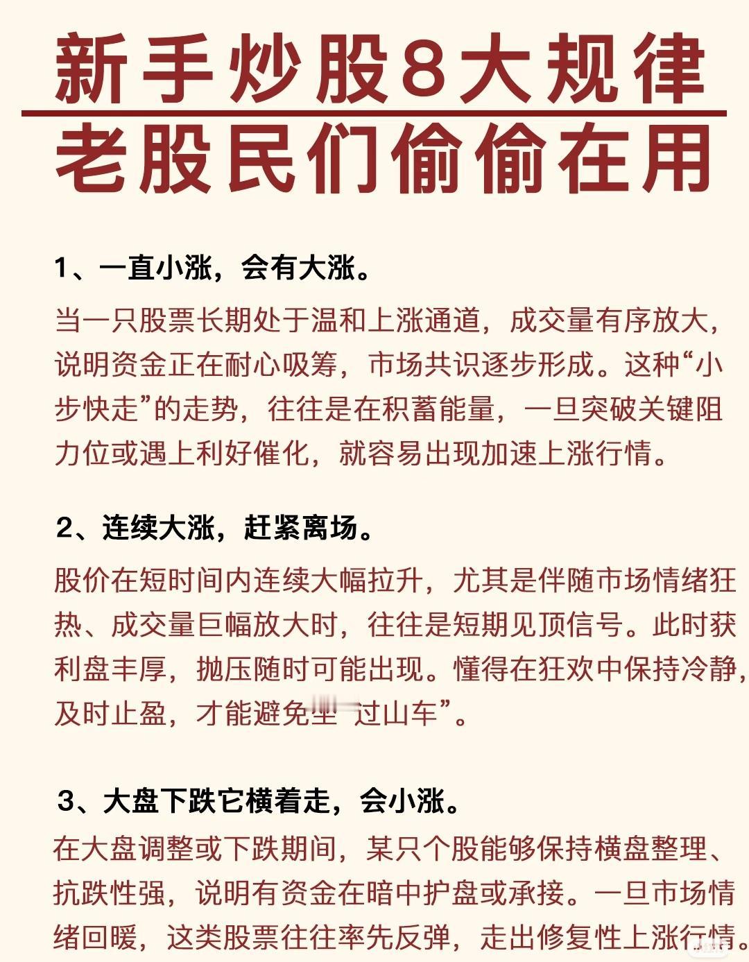 炒股8大规律,核心如下: 1. 一直小涨(量有序放大)→ 积蓄能量,易大涨; 2. 连续大涨(情绪狂热)→ 短期见顶,需离场; 3. 大盘跌它横盘→ 抗跌有资金承接,回暖易小涨; 4. 大盘跌它小涨→ 主力做多意愿强,易大涨; 5. 大盘涨它横盘→ 资金关注低/有隐压,易小跌; 6. 大盘涨它小跌→ 借势出货/有利空,易大跌; 7. 快速下跌但量小→ 缩量急跌是洗盘(清浮筹); 8. 慢慢下跌但量大→ 放量阴跌是转弱信号,赶紧跑。