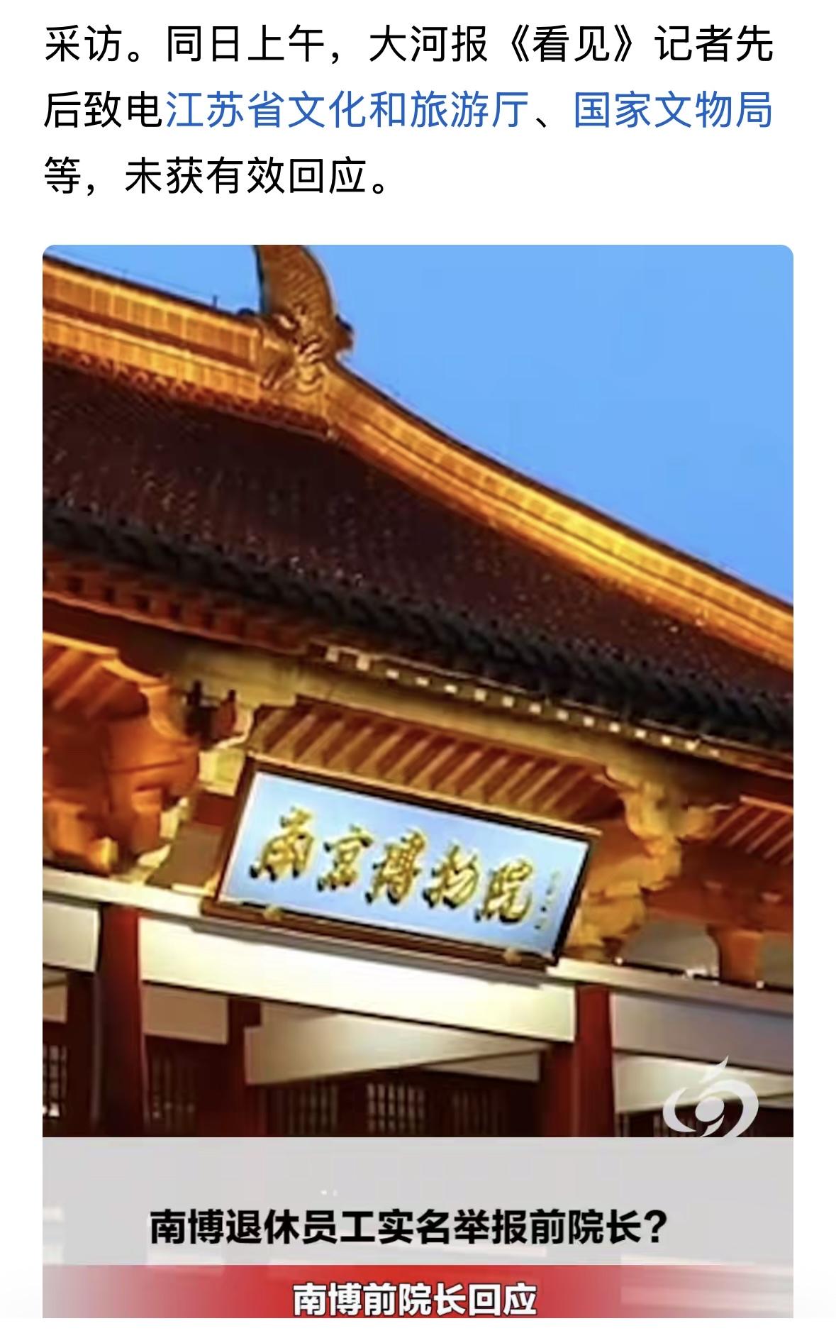 这事,把江苏省相关部门搞晕头了,因为地涉及到了省里的老同志,涉及到本系统的老同志,甚至也可能与自己有关联。22日,南京博物院前院长徐湖平就上述被举报事宜向大河报《看见》记者表示,会在合适的时机发声回应此事,“等上级调查结果”。