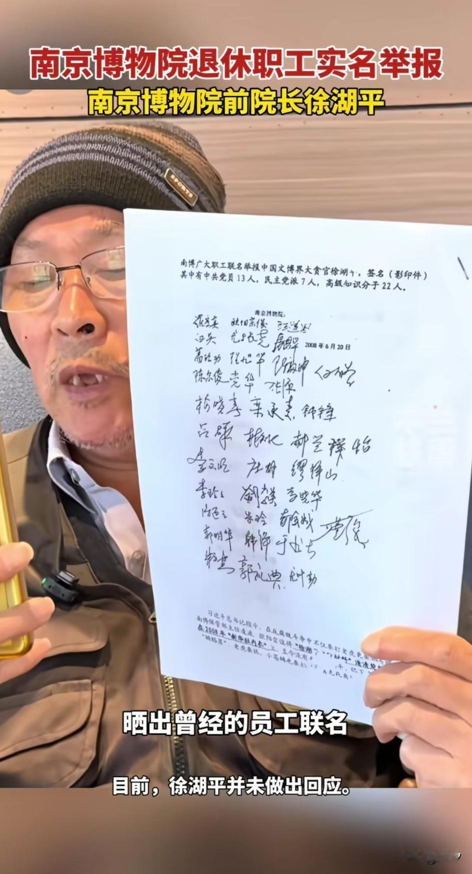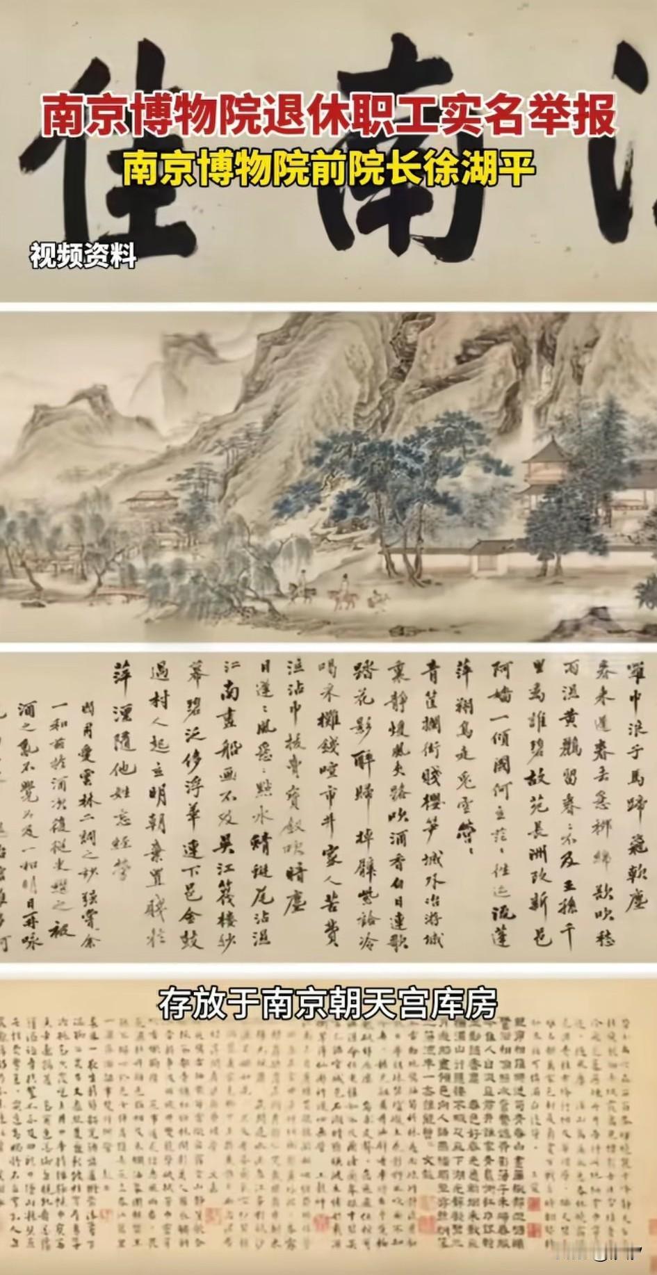 看到南京博物院退休职工, 实名举报南京博物院前院长徐湖平盗窃故宫南迁文物,他介绍故宫南迁文物总共有2211箱,有10余万件文物放在南京朝天宫库房,大爷正是朝天宫库房的老职工,徐湖平私自将封条扯开, 从中洗出了大量文物, 然后指使文物鉴定专家将珍贵文物鉴定为赝品,然后再通过签字走流程, 低价转卖给了他主管的江苏省文物商店,然后再转手倒卖给他的儿子在上海开的文物拍卖公司,然后通过文物拍卖公司卖给法国人,商人和各地的文物贩子,然后从中谋取暴利, 如果这位老先生说的是真的, 那这位南京博物院的前院长真的是民族的罪人,为了自己的私欲, 居然可以利用权力胡作非为, 将中国珍贵的故宫文物倒卖成金钱, 满足自己一家的私欲, 真的是太坏了, 希望有关部门严厉查处, 即便是退休的干部也不能放过, 有网友表示一旦爆出来之后, 系统会自动为你匹配对应的对手, 还真是一点没错! 南京博物院明代画作这事可能牵出了惊天大秘密, 大家对于南京博物院老职工举报前院长徐湖平倒卖文物这事怎么看? 南京博物院 徐湖平 南京博物院 南京博物馆拍卖 江苏国宝 故宫博物院打假 徐展藏品