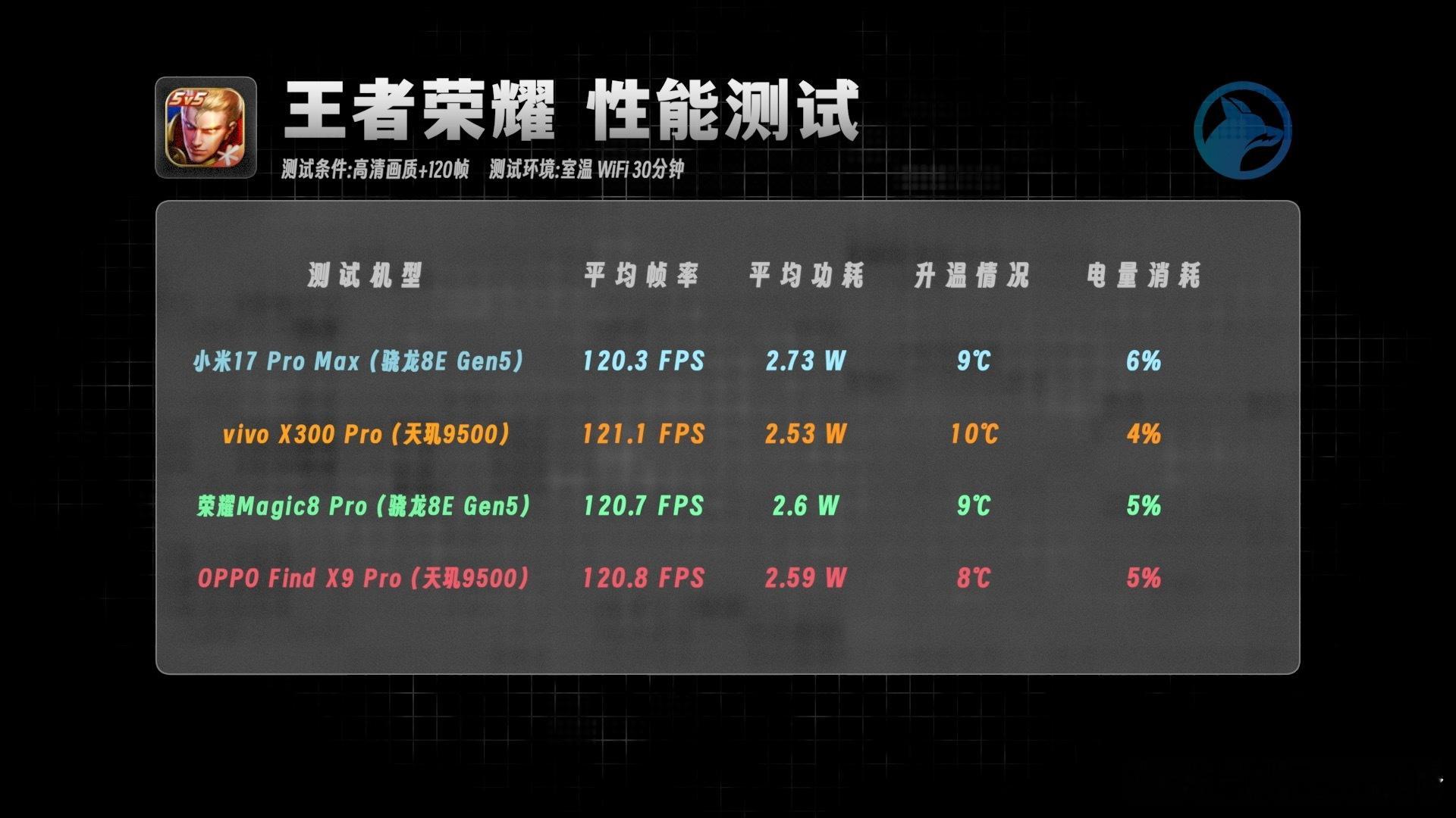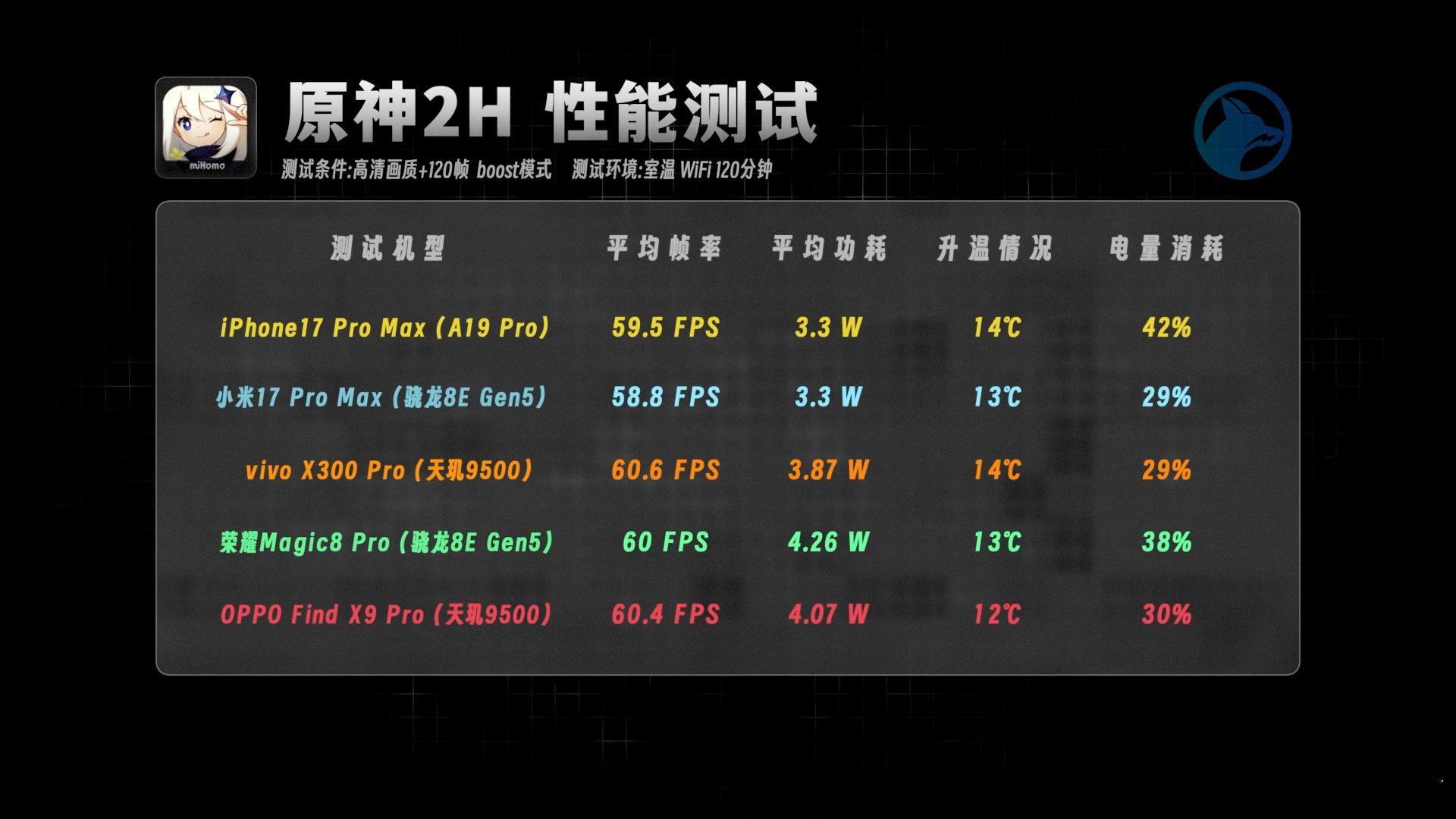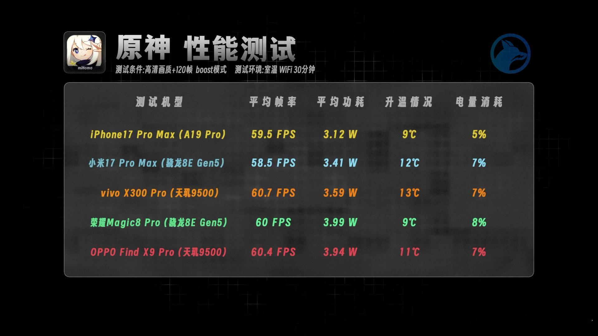 果米OV耀,五款Pro游戏实测。【王者】(图1)由于iPhone测试原因,只对比OV米耀四款机型,且四款机型都有不同程度拔高帧率上限的情况。在帧率拉不开太大差距的情况下,两款天玑9500的功耗要略低于8E5,vivo功耗和耗电最低,但发热相对高一点。整体玩起来的体验,差别不大。【原神】半小时(图2)平均帧率vivo最高,荣耀飙到了近4W,但是温控不错。iPhone则是温控和耗电表现最好的。这里要说一下,温度高并不代表释放强,发热是因为电能转化成了热能,而用在性能上的功耗可能反而更少。两小时原神(图3),平均帧率变化不大,但是高通和天玑的调校就不同了。vivo帧率高,但升温也高。荣耀依旧最高,而iPhone耐不住两小时的持续输出,升温14度和vivo一样,也是有点烫手了,而且耗电更是有42%。在中低负载场景,依旧是天玑的主场,用较低的功耗可以有几乎相同的体验,给我的感觉就是稳。相比之下,8E5给人的感觉是上限高,虽然流畅度没问题,功耗会稍高。对于绝大多数人来说,日常用旗舰处理器其实没太大区别。
