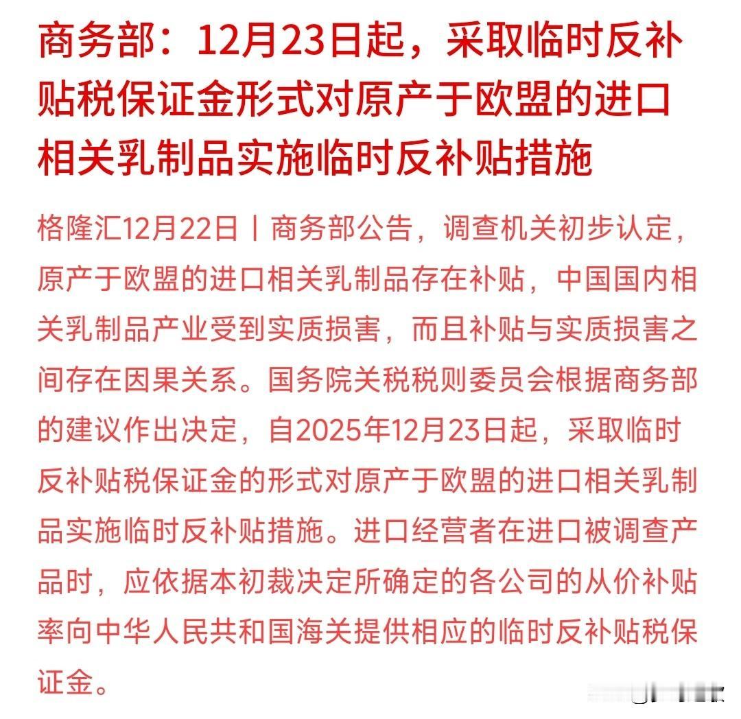 A股收盘后,乳制品迎来重大利好,明天乳制品板块稳了 从23日起,中国对欧洲的乳制品实施临时反补贴措施,简单就是说欧盟的乳制品因为欧盟懂王补贴,进入中国的乳制品相对便宜,对中国的乳制品行业进行冲击。 中国对欧盟的乳制品进行反补贴措施就是临时让欧盟企业交临时保证金,调查时间最长4个月,然后裁定是否收税。 这样的反补贴措施会拉高欧盟出口到中国的乳制品的成本,增加中国乳制品在价格上面的优势。 中国从欧盟进口超过30%以上的乳制品,也就是说未来很长一段时间这部分市场会被国内企业抢占一部分。