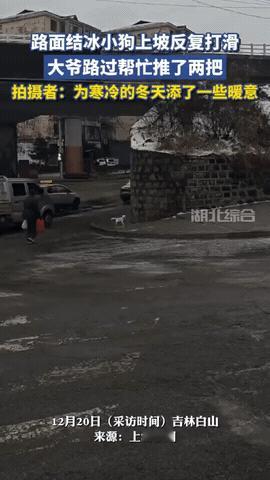 笑不活了!12月21日报道,吉林白山一小狗爬坡,遇到路面结冰,四只爪子直打滑,爬两步出溜一步,半天没上去,一位遛弯儿的大爷看见了,走过去就在小狗后头轻轻推了一把,心想这下总该上去了吧?[黑线] 吉林临江的初冬街头,路面覆着一层透明的薄冰,光洁得能映出模糊的影,这是前一夜降雨后气温骤降形成的特殊冰面抖音,一只黄色的小狗在缓坡上奋力攀爬,爪子刚接触冰面便不受控制地打滑,身体后倾,前腿徒劳地在空中划动,它尝试了数次,每次前进半步,随即又滑回原点。 一位身着深色棉衣的老大爷路过,停了下来,他并未立即上前,而是站在坡底看了一会儿,等小狗又一次努力向上,后腿蹬直即将失力的刹那。 他才伸出戴着手套的手,稳稳托住小狗的屁股,向前送了一把,可惜冰太滑,这种俗称 “地穿甲” 的冰面摩擦力比普通积雪低 60%,小狗没找到着力点,侧着身子又溜下来一小段距离。 老大爷没离开,他双手背在身后,微微弯着腰,目光跟着那抹黄色的小身影,小狗歇了几秒,转身又开始尝试,这一次,它的前爪在冰面上刨动得更急,却仍在原地空转,就在小狗力气将尽,身体开始微微后仰的瞬间。 老大爷恰好向前一步,手掌精准地抵住它的后躯,顺着它向上的势头,给予了持续而平稳的一推力,小狗借力猛蹬,几下就蹿上了坡顶,头也不回地跑开了。 临江受其影响出现降雨,20 日气温显著下降,累计降温幅度达 6~12℃,雨水迅速冻结形成 “地穿甲”,这种冰面光滑坚硬如铁甲,格外难走镜头里,老大爷的动作自然连贯,仿佛只是做完一件微不足道的小事,拍拍手便转身离开了。 没有多余的言语,没有刻意停留,看见需要搭把手的,不论是人还是小动物,那份实在的劲儿就透出来了,这种特质当然不为地域所独有,它更像一种共通的善意语言,在生活的许多角落默默书写。 回看这个简单的举动,值得品味的恰恰是那份分寸感,老大爷没有在小狗第一次挣扎时就介入,也没有因为第一次助推未果而放弃或强硬地大包大揽。 他观察了小狗的节奏,在最需要补充一点外力就能突破临界点的时刻,提供了那 “恰到好处” 的一把。这种帮助,建立在对受助者处境的细微体察之上。 它并非总以轰轰烈烈的形式出现,而更多在于时机与方式的精准,就像扶起一辆即将倒下的自行车,在别人双手提满重物时帮忙掀一下门帘,或者仅仅是在他人尴尬无措时,递去一个解围的眼神,这些介入轻微而克制,却因为契合了对方真实的需求点,而显得格外有力。 善良或许很简单,无非就是看见苦难时,愿意多停留一会儿,再多伸一次手。 “这才是咱们东北老爷们儿,话不多,办事儿实在,我爷当年也这样,帮人从来不带吭声的。” “推第一下没上去,大爷还知道等一等,看准了再推第二下,这才是真帮忙,不是瞎添乱。” “小狗最后那小眼神,像在说谢谢似的,虽然不会说话,但啥都明白了,万物有灵。” “头天雨夹雪第二天就上冻,这路面是‘地穿甲’,最滑了,别说狗了,人走都费劲,大爷是懂行的,知道得用巧劲。” “现在有些人为点流量啥都干,跟这老大爷一比,高下立判,这种随手的好心,最暖人心窝子。” “别说,这事儿挺有寓意。有时候咱们自己遇到‘爬不上去的坡’,缺的就是这样一把恰到好处的力。” “这视频看得人心里热乎。大冷天的,这一个小小的举动,比啥大道理都管用。” “建议给大爷发个‘冬日暖男’奖!这种正能量就该多传传。” 你是否也曾被陌生人的小小举动温暖过? 信源:湖北综合