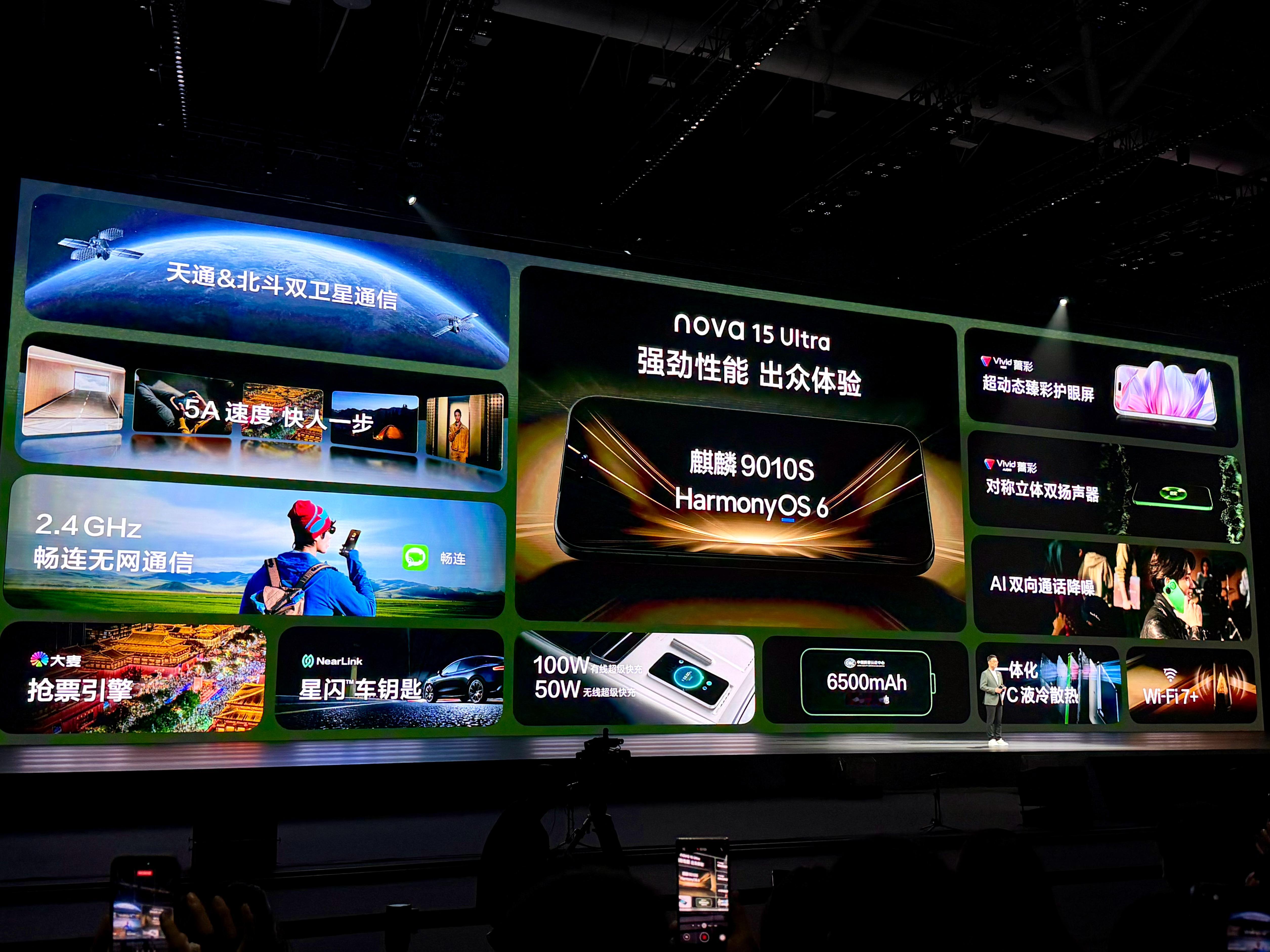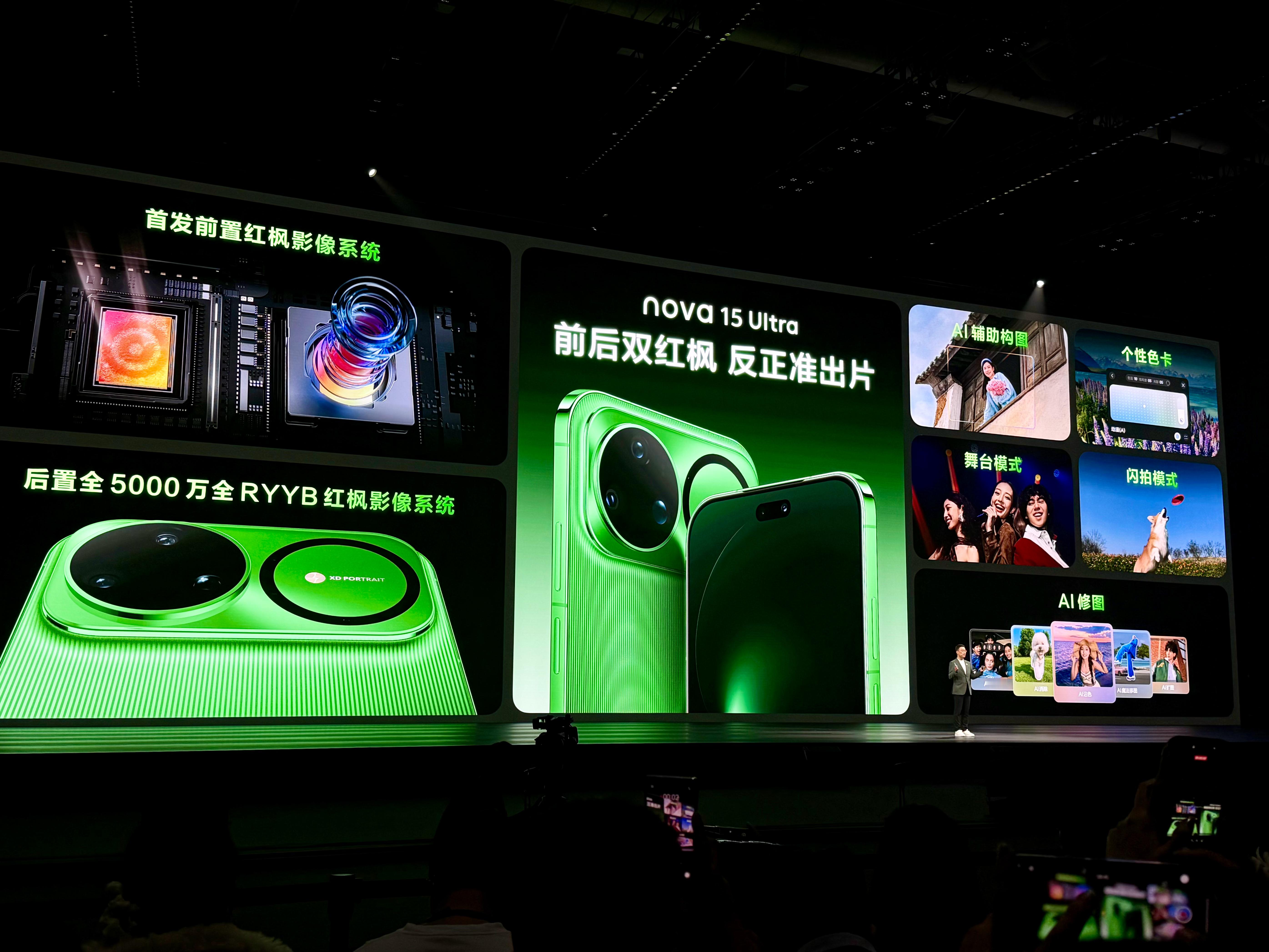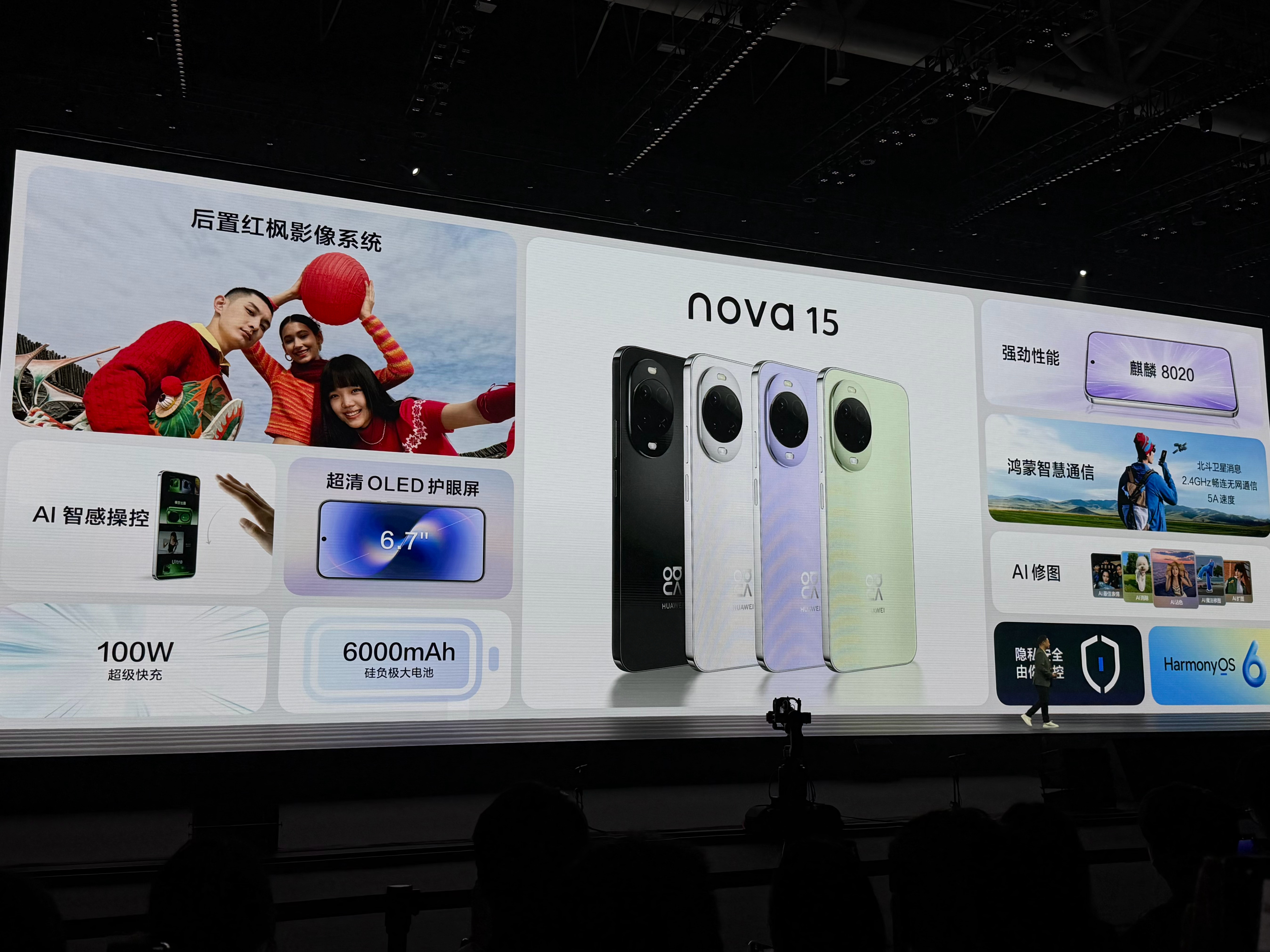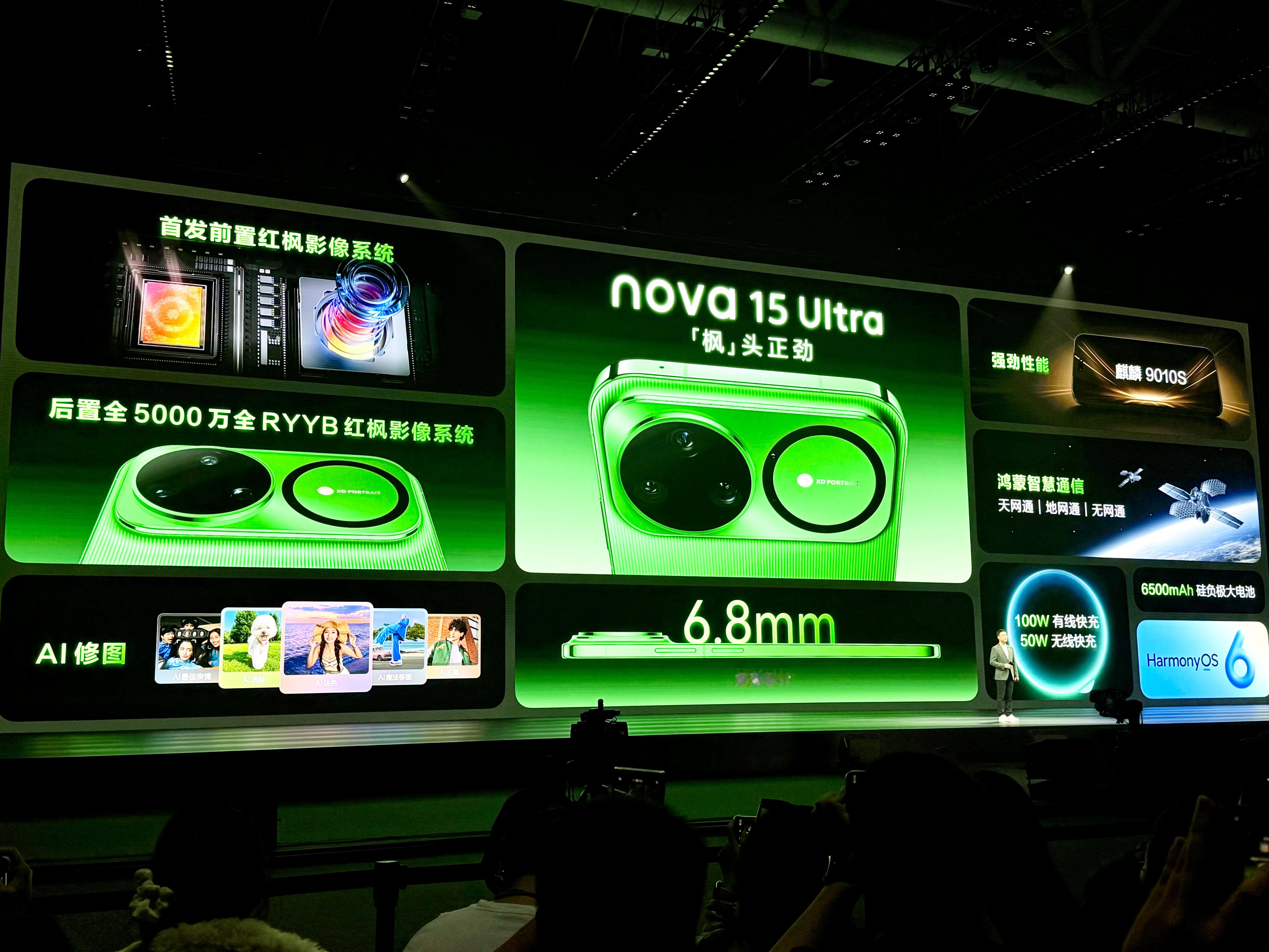 华为nova 15系列正式发布,全面焕新的nova15系列仅2699元起!nova15搭载麒麟9系旗舰芯片 nova 15 Ultra和nova 15 Pro搭载旗舰同款麒麟9010S芯片,nova 15搭载麒麟8020芯片。全新横向立体双环设计,行业首发前后双红枫影像;航空级金属中框,大幅强化了手机的耐用性;nova 15 Ultra以6.8mm的超薄机身成为nova15Ultra史上最薄!nova15首发搭载前置红枫镜头首发搭载业界唯一前置红枫镜头,以及首发前置像素级光谱感知算法;后置上nova 15 Ultra首次升级4个5000万全RYYB红枫影像系统,包括可变光圈防抖镜头、潜望长焦镜头和超广角微距镜头,实现前后双红枫,反正准出片!nova 15 256GB 2699元,512GB 2999元;nova 15 Pro 256GB 3499元,256GB昆仑玻璃 3599元,512GB 昆仑玻璃 3899元;nova 15 Ultra 256GB昆仑玻璃 4199元,512GB昆仑玻璃 4499元,1TB玄武钢化昆仑玻璃 4999元!华为nova15正式发布