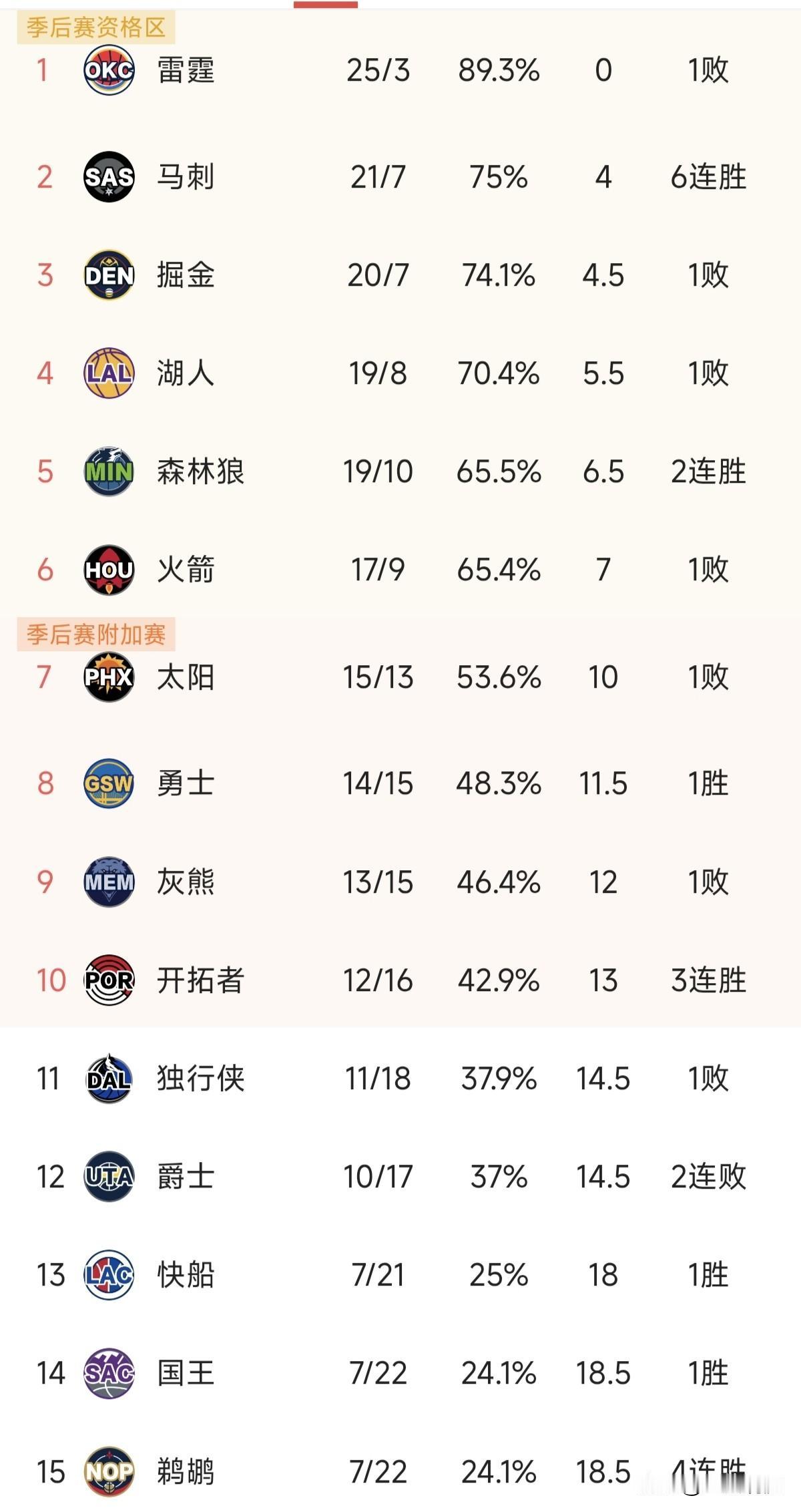 刚才把我整得不自信了,四连胜的鹈鹕现在排名西部倒数第一,有意思的是目前联盟最长连胜记录是排名第二的马刺有六连胜,鹈鹕四连胜是现在第二长。 排名西部第十的开拓者现在三连胜,和倒数第一鹈鹕相差5.5个胜场,火箭输给国王说明了什么?大哥杜兰特想拉二弟一把别让球队垫底吧! 火箭今天输球后已经掉到西部第六了,不过后面有机会,因为湖人伤病和赛程很难坐稳第四,所以能不能抓住机会就看大家各显神通了。