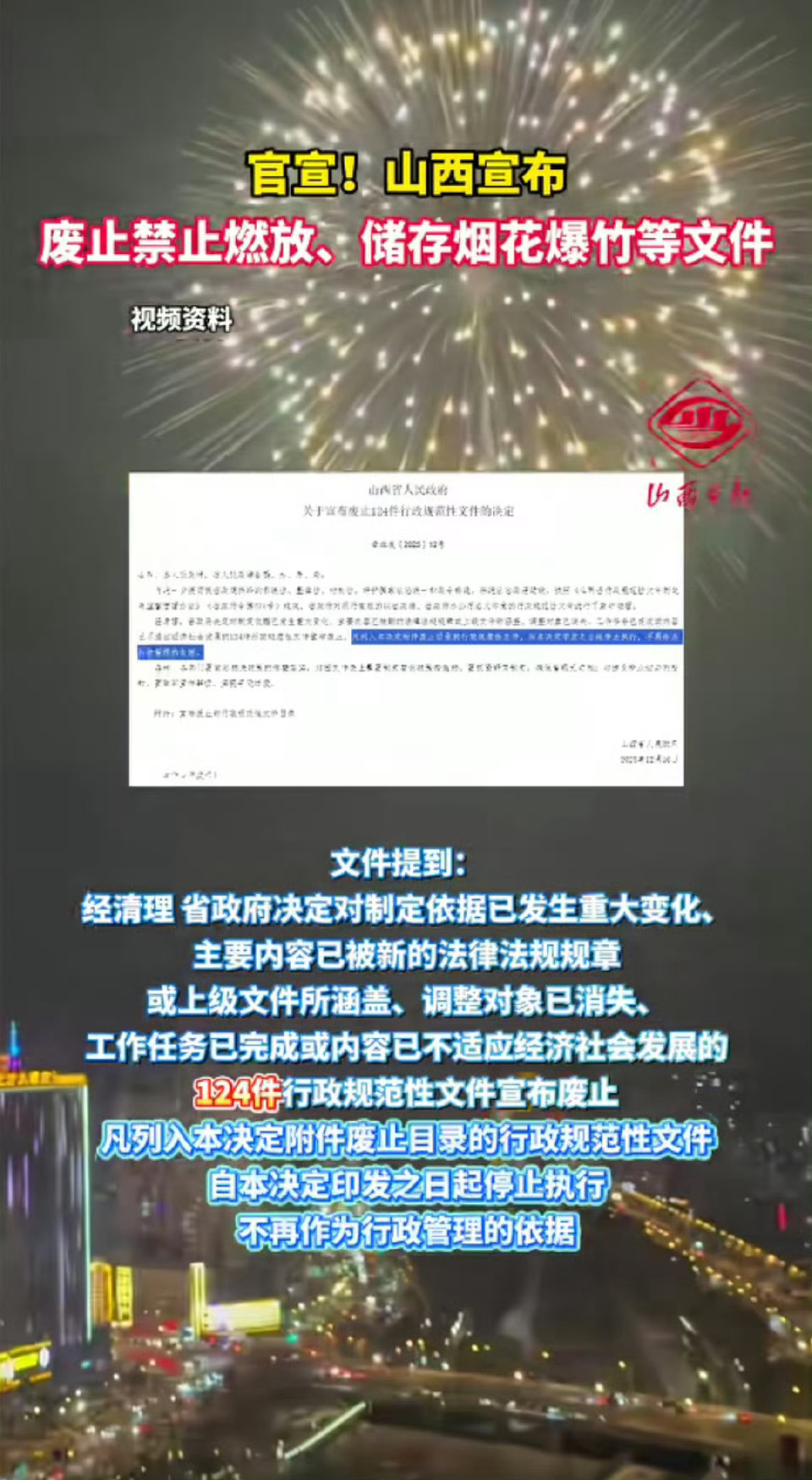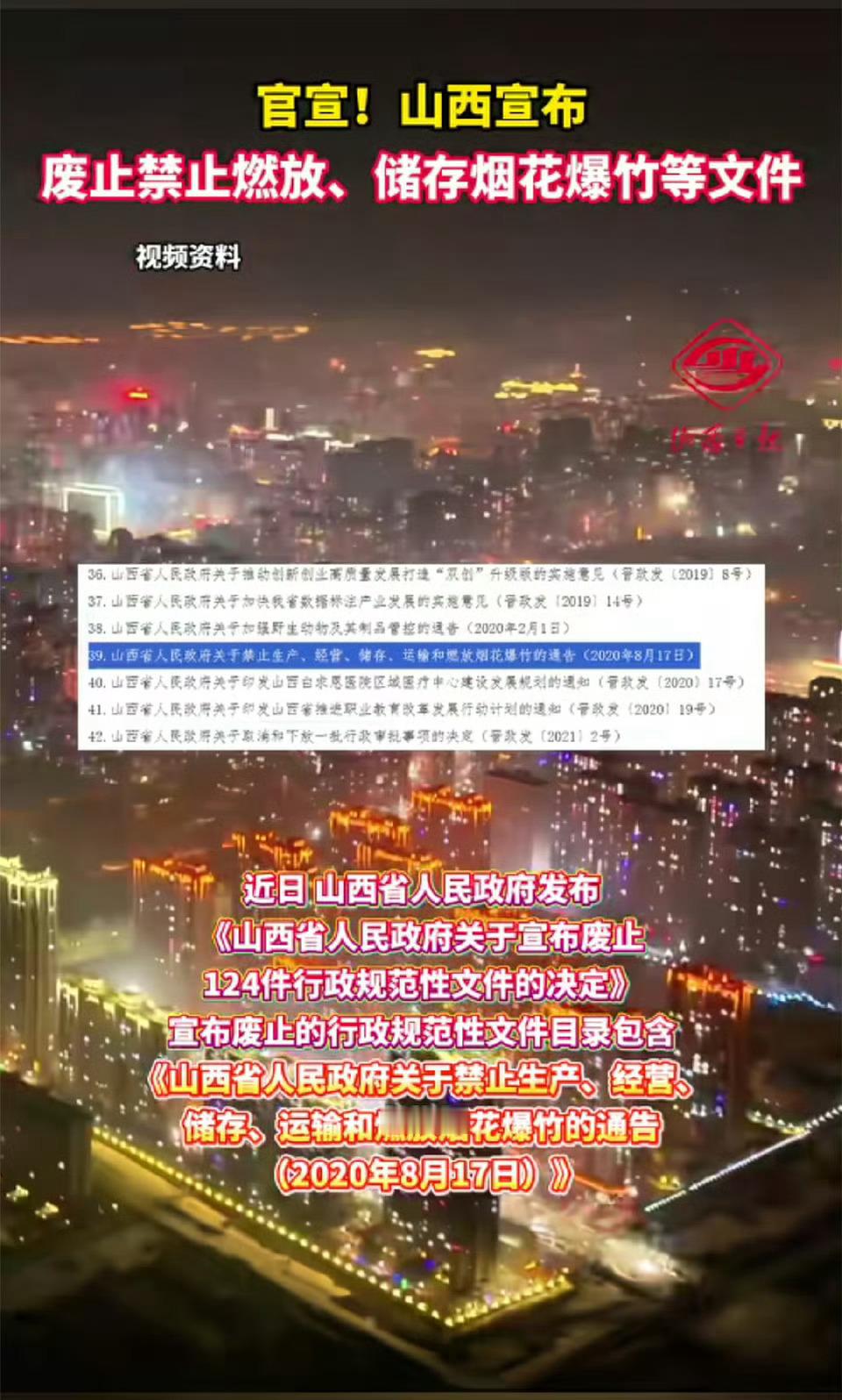 希望能有更多的城市能恢复年味!山西官宣废止烟花爆竹禁令烟花解禁年味更浓么近日,山西省人民政府发布《山西省人民政府关于宣布废止124件行政规范性文件的决定》,宣布废止的行政规范文件目录包含《山西省人民政府关于禁止生产、经营、储存、运输和燃放烟花爆竹的通告(2020年8月17日)》。