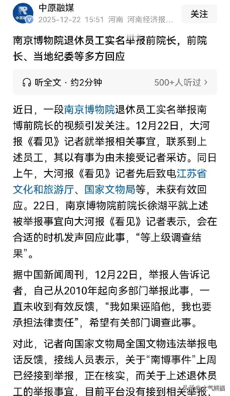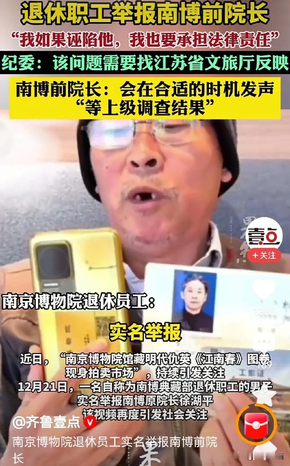 看来大家还是太乐观了 关于南京博物院退休员工实名举报前院长一事,各方最新的回应都很谨慎。 大河报记者致电江苏省纪检监察机关,得到的答复是需要找江苏省文旅厅反映。 记者给江苏省文旅厅打电话,结果是一直无人接听。 向国家文物局电话咨询,表示南博事件正在核实,但是退休员工的举报,目前没有接到投诉。 南京博物院名誉院长的原话就是:“这个事情我没什么可说的,抱歉。” 好家伙,记者打了一圈电话,没有得到一个肯定的答复,要不就是没人接电话,要不就是推到别的部门,要不就是没有什么可说的,好像大家都形成了默契。 原本以为有46人联名举报,事情可能会进展的更快一些,但从现在的各部门回复来看,大家还是得耐心等一等啊。