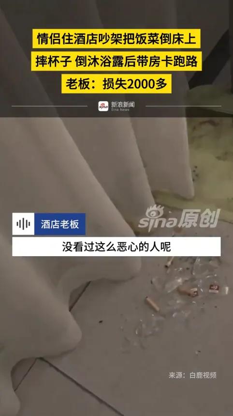 12月17日,湖南长沙一对情侣入住酒店后,深夜悄然离开且未归还房卡。超时未退房后,工作人员查房发现客房被严重糟蹋:床上倒满饭菜、杯子被摔碎、洗护用品全被倒出,损失超2000元。酒店联系二人无果,已留存证据准备报警,引发网友热议谴责。 网友评论: - 这素质也太低了吧!把酒店房间当垃圾场,糟蹋成这样,必须照价赔偿还要追责! - 交那点押金就敢这么造?明显是早有预谋的吧,不然怎么会连夜悄咪咪跑路。 - 保洁阿姨得多崩溃啊,清理那些饭菜残渣和碎玻璃,又脏又危险,心疼工作人员。 - 真的离谱,就算有啥不顺心的事,也不能拿公共财物撒气啊,这操作真的没眼看。 - 酒店也是,押金收太少了,遇到这种没素质的客人,根本不够抵扣损失,长教训了。