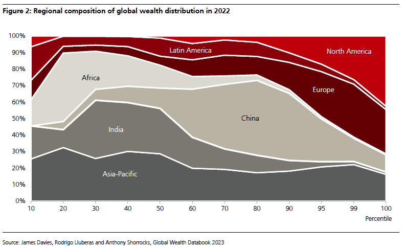 各国财富分布图,2018年美国“斩杀线“就出现了,2006年还没有图一是2022年的图,我以前介绍过。横轴和纵轴都是百分比,是说一国或者一个地区,在全球的财富排名的某个位次,各国占的比例。例如最富的接近100%排名的人,美国人占比最多,欧洲第二多,亚太(除中国大陆)第三多,中国第四,其它地区几乎没有了。最近流行说美国的“斩杀线”,就是说财富(血条)跌到多少以下去了,就会被社会一套连招弄死。昨查了,美国人只要无家可归变流浪汉,平均寿命就会减少30-35岁。在图一也能看出来,美国人在全球财富20-40%的区间几乎没有人。就是说,如果个人财富快跌到全球排名40%以后,就很可能出危机了,迅速沦落到最后的0-20%去。然后收入再出问题,就得流浪了,真的会被斩杀了。图一里,中国在60%-95%的财富排名区间,都是人数最多的,这就是中国在全球代表性的财富形象。也有部分人只排30%-60%,中国算是偏穷的。还有极少数几乎没资产的。图二是2006年的图,可以看出中国几乎没啥很富的人,还不如拉美富人多,但也不是太穷。和2022年的图对比,能看出不小的变化。2022年中国和印度出现了明显的区别,印度的肚子和中国的肚子错位更为明显。中国全球排前的明显增加,排后的明显减少。而美国2006年排名全球很后的人很少,2022年明显增加。图三是2018年的图,感觉和2022年差不多。