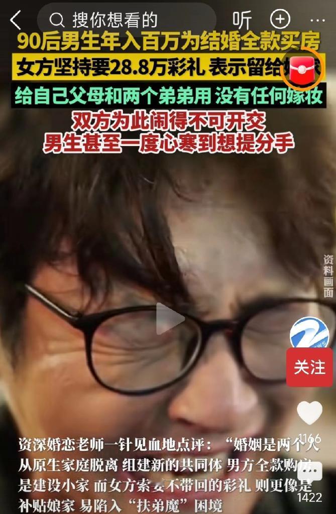 又是个彩礼崩溃的! 90后男子,年入百万,130万买房,未婚妻要28万彩礼,给弟弟用,一分嫁妆都没有! 男子非常崩溃! 甚至想要提出分手了! 这起彩礼争议事件在社交平台曝光后,迅速引发广泛讨论。 有人理解男子的崩溃,认为女方彩礼要求不合情理;也有人站在女方角度,觉得彩礼是当地习俗,应予以尊重。 争议的核心,早已超出彩礼数额本身,而是折射出当下婚恋关系中,个体诉求、家庭责任与社会习俗之间的复杂博弈。 从事件细节来看,男子的经济条件并不算差。 作为90后,年入百万的收入水平远超同龄人,130万全款买房的举动,也能看出他对这段婚姻的诚意与规划。 在他的预期里,买房已经是对婚姻的重要投入,后续彩礼应在合理范围内,用于两人婚后生活的铺垫。 而未婚妻提出的28万彩礼,不仅数额不低,用途更是直接指向“给弟弟用”,且无任何嫁妆配套,这彻底打破了他的心理预期。 对他而言,这已不是单纯的彩礼问题,而是女方家庭将婚姻与原生家庭责任捆绑,让他难以接受。 女方的彩礼要求,并非毫无背景支撑。 据了解,女方来自传统观念较强的农村地区,“彩礼补贴弟弟”的做法在当地并非个例。 在部分地区的传统认知中,嫁女儿收取高额彩礼,是为儿子后续结婚积累资金,这种“重男轻女”的残余思想,至今仍影响着不少家庭的婚恋决策。 女方或许也有自己的无奈,一边是原生家庭的压力,一边是即将步入的婚姻,在两者之间难以平衡,最终选择了向原生家庭倾斜。 但这种将婚姻当作“扶持原生家庭工具”的做法,显然与现代婚恋观存在严重冲突。 现代婚恋关系的核心是平等与共赢,双方应基于相互尊重的前提,共同规划未来生活。 而女方将彩礼明确用于弟弟,本质上是把个人婚姻当成了原生家庭的“输血通道”,忽视了男方的合理诉求,也忽视了婚姻关系的独立性。 这种不平等的付出预期,必然会引发婚恋双方的矛盾,甚至导致关系破裂。 事件发酵过程中,不少网友分享了自己身边的彩礼争议案例。 有的家庭因彩礼数额谈不拢,多年感情戛然而止;有的新人即便勉强达成一致,婚后也因彩礼问题心存芥蒂,影响家庭和睦。 这些案例都说明,彩礼习俗若不能与时俱进,很容易成为婚恋关系的“绊脚石”。 随着社会经济的发展,年轻人的婚恋观已经发生深刻变化,越来越多的人开始追求“轻彩礼、重感情”的婚姻模式。 他们更看重双方的性格契合、价值观一致,而非物质条件的堆砌。 女方家庭的传统观念与男方的现代婚恋观之间的碰撞,正是这起事件的矛盾根源。 除了传统习俗的影响,原生家庭对婚恋关系的过度介入,也是引发争议的重要原因。 信源:男子上书举报28万彩礼登上热搜,下头的逻辑叫人无言,当地回应-科普岁月