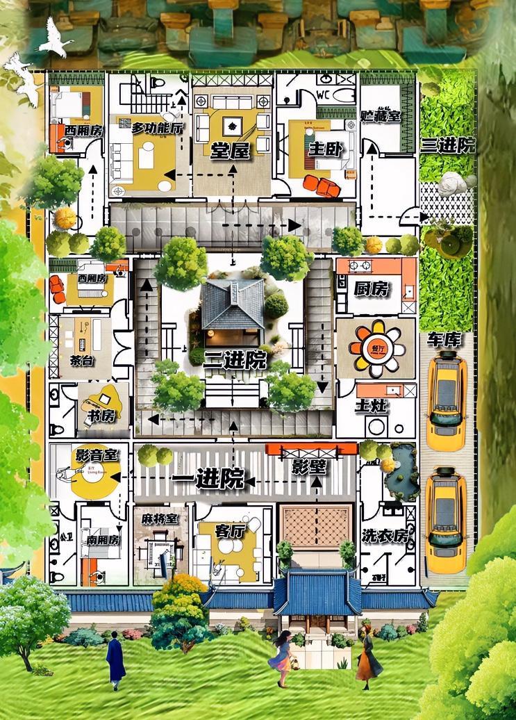 你看,合院太招摇,暴露毛病多,348㎡是会让你打退堂鼓的自建房! 三进院,格局没遗憾,动线也完美,就布局很无奈! 大白话,前院的洗衣房,不讲究。后院的厕所,不够用。侧院的车库,与厨房做邻居! 不是说自建房,一张底牌也没有,最拿得出手还是布局,相当于一间大平层,整出三套房,各有所长,别笑话哦! 前院大一居,室内主打的艺术是各种玩耍,麻将和娱乐,两不误,洗衣房属于加塞进来,影响情绪价值! 后院也有大一居,书房和茶茗台,与风108㎡中庭,意境匹配度98 %,花庭不寂寞,书香、茶香和花香,交织相得益彰! 重点表彰一下餐厨一体化,三联横厅,上中厨,下土灶,居中八仙桌,城里人可能觉得不精致,放农村就是土味情话,最发光的布局! 方位讲究的很正能量! 另外收纳,太少,是三进院统一的疼点,几百平米大院,五组衣柜,难道村里的姑娘,不喜欢打扮自己嘛? 三进院的车库很气派,长啊,能栽花种草,但是第二台车却生无可恋,前有车拉的挡道,后有花怕压坏灵根! 唱出了,筒子楼车库的不靠谱! 合院讲理,布局不够好,自此 ,合院,大平层,自建房界,多了一套套,有毛病的四合院,真心话,村里头传说 ,地气接的太水啦!