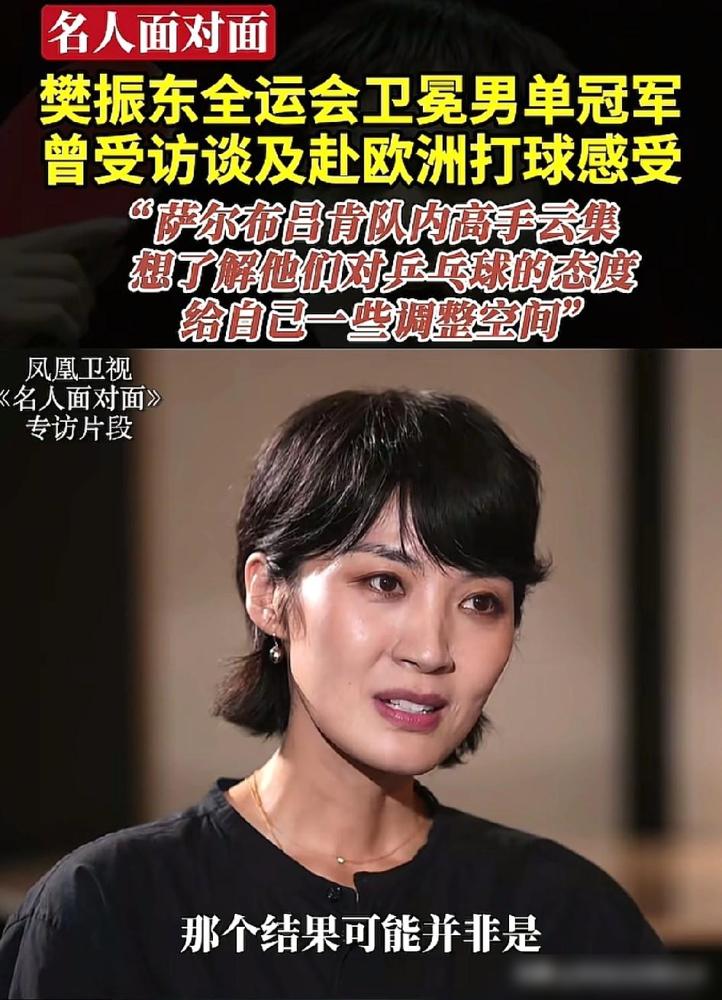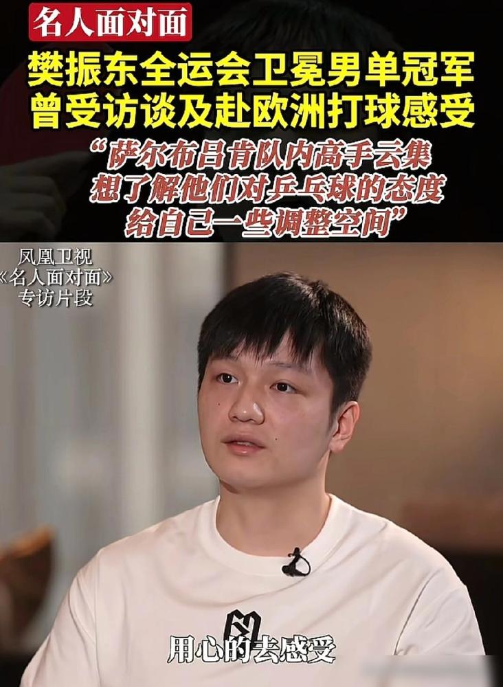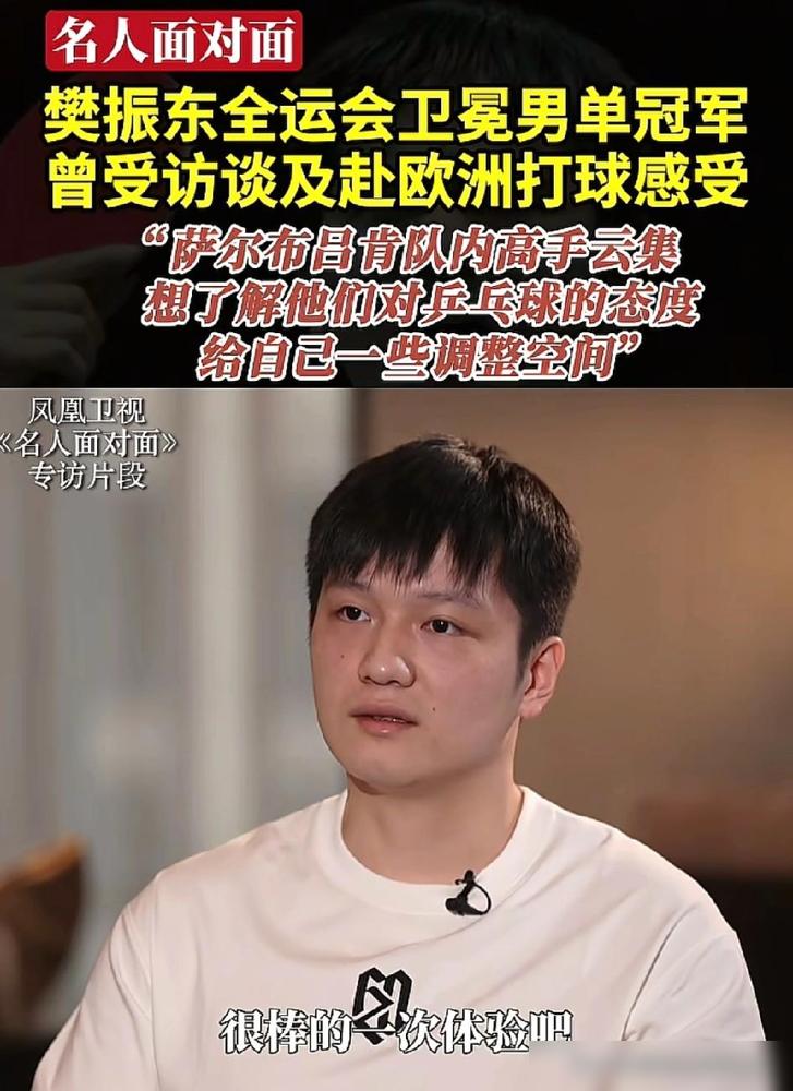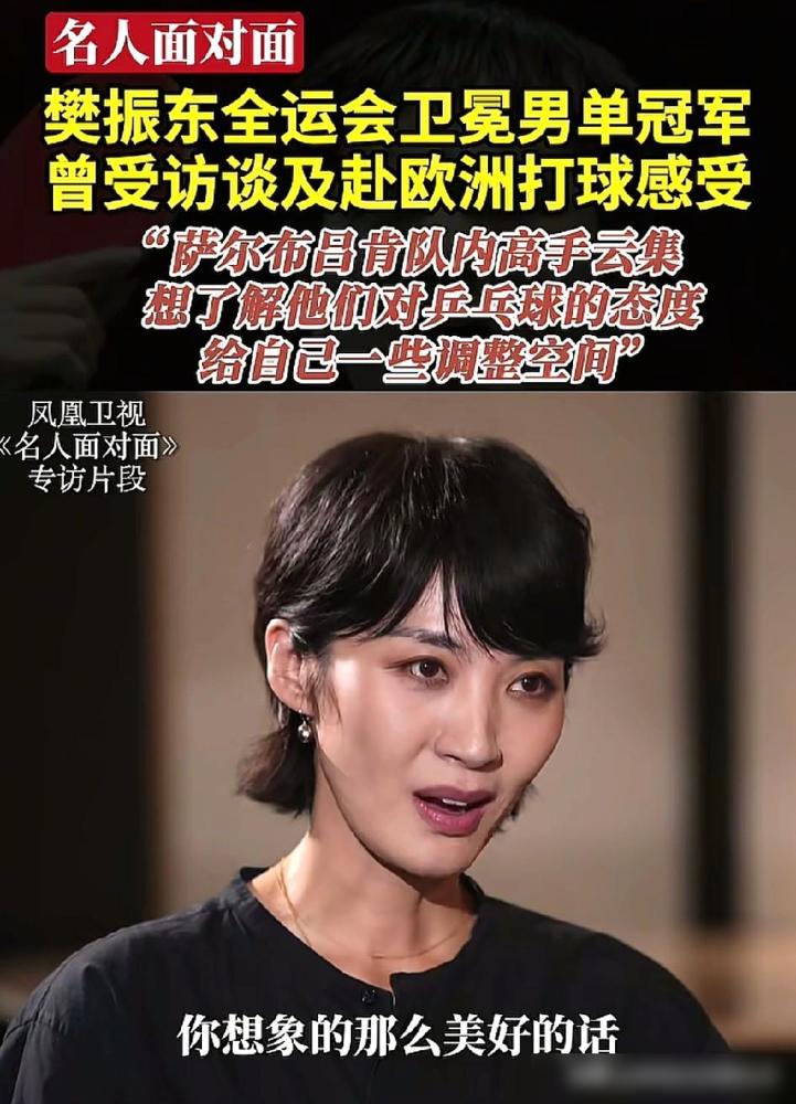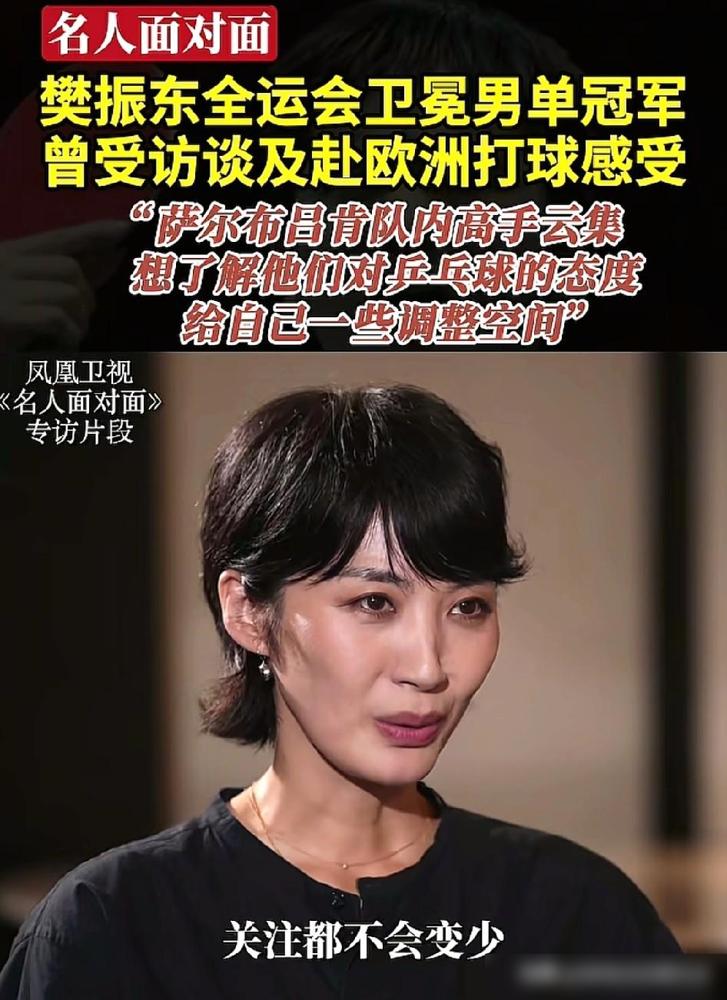 樊振东松口了。凤凰卫视二次专访樊振东。当主持人问他:“其实,无论你走到哪里,关注度都不会变少,那个结果可能并非是你想象的那么美好,你会失望吗?” 其实就是东哥最近在镜头前聊了聊他现在的状态。面对这种几乎如影随形的关注度,以及未来可能并不完美的走向,他表现出了少见的坦然。 他说没人能保证以后一定会好,但至少能客观地去感受一下,也是很棒的体验。听完这段话我真觉得,他现在这种心态已经到了另一个大气层了,不再是那种被胜负欲裹挟的紧绷感。 这种“松弛感”给我的感觉不是要躺平,而是一种真正看透了之后的通透。 但现实往往有点讽刺。他在德国联赛那边,虽然对手俱乐部里不乏邱党、卡尔伯格、户上隼辅这些国际排名前十、前二十的高手,结果这几位居然几乎都完美避开了他。 我猜这些名将心里也打小算盘,估计是觉得现在的樊振东碰不得,谁也不想在这个时候去当那个“垫脚石”。 导致东哥在赛场上遇到的反而都是些“野路子”球员,打法生疏得很。这种局面其实挺让人哭笑不得的,高手集体“隐身”,留下一群怪球手让他去磨。 说实话,打这种野路子选手说不定比打名将还累,但换个角度想,这不正好契合他说的“客观感受”吗?不管对手是谁,去体验那种不确定性。 感觉他现在已经不需要再用某场具体的胜利去证明什么了,能按自己的节奏去生活、去打球,这本身就是一种赢。