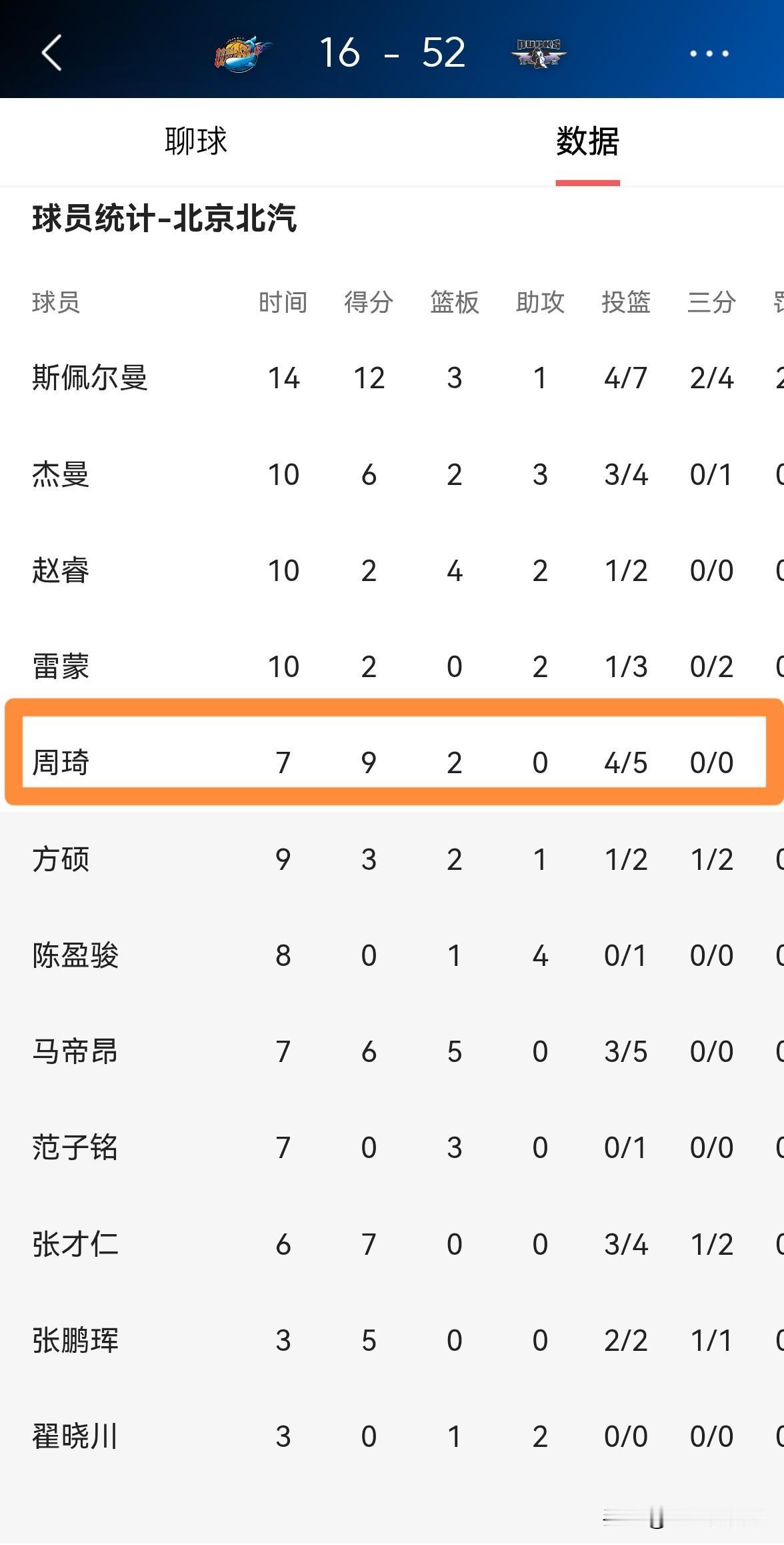 北京北汽超级中锋周琦真是高效的离谱!在今天北京北汽客场挑战四川丰谷酒业的上半场比赛中,周琦仅仅首发出战7分钟,投篮5中4,其中罚球1中1得到9分2篮板1抢断,他的场上正负值为+15,带领球队以52:16领先对手结束了前两节的比赛。 不出意外的话,以目前双方的分差来看,周琦很有可能直接两节比赛打卡下班了。
