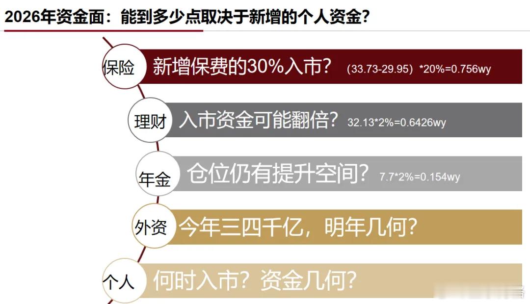 周末博格去上海参加了雪球嘉年华,现场聆听了各位专家的分享,收获特别大。尤其是国泰梁杏总的分享,让我对 “2026 年可能有多少资金加仓 A 股?” 这个问题,有了更清晰的判断。咱们可以按不同资金来源拆开来看看(按博格理解阐述):(1)保险资金:这是近几年 A 股的主力入市资金之一。保险公司每年收到保费后(尤其是年初),会拿出一部分资金配置股市。不同公司的最高入市比例不同,综合来看不超过 30%,这里按 20% 保守估算,明年保险资金预计能带来 7500 亿元新增入市资金;(2)理财资金:这类资金的入市比例相对较低,参考过往情况,同样保守按 2% 估算,预计能有 6400 亿元新增资金入市;(3)年金:入市比例也不高,还是按 2% 保守算,估计能贡献 1500 亿元新增资金;(4)外资:规模很难精准预估 —— 今年前三季度外资加仓了 3000-4000 亿元,但明年的情况存在不确定性,所以这部分暂时不纳入统计;(5)个人投资者:今年个人投资者的入市规模其实很少,明年是否会出现 “存款搬家”,目前也很难判断。所以,我们先只统计前面 (1)-(3) 类资金 —— 即便按最保守的估算,2026年 A 股也能迎来合计约 1.5 万亿元的新增入市资金。最近不少外资投行都看好中国市场,不排除会有更多外资进场,但这部分存在不确定性,暂时不做额外预估。由此来看,明年 A 股能走多远,关键其实要看是否会出现个人投资者的 “存款搬家”。因为目前居民存款规模已达 160 万亿元,哪怕只有 2% 从存款转移到 A 股,也能给市场带来 3.2 万亿元的新增资金。当然,大规模的存款搬家并不容易 —— 理论上,按照风险偏好,居民不会直接把存款拿去买股票,更多还是会通过保险、理财等产品间接入市。但即便只是小规模的存款搬家,无论通过哪种渠道,都会给市场带来不小的影响。希望明年市场能有可持续的赚钱效应,吸引更多资金通过各种渠道入市~A股年底怎么买基金
