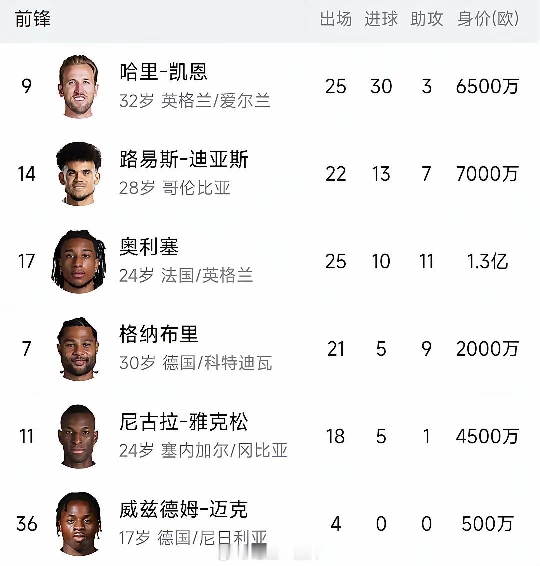 拜仁就想说一句话,英超来的前锋真好用!凯恩是热刺9500万卖的。迪亚斯是利物浦7500万卖的。奥利塞是水晶宫5300万卖的。现在热刺,利物浦,水晶宫都后悔了。英超球队成就了拜仁慕尼黑在德甲统治,只差夺得欧冠冠军,那么三叉戟将在队史留名。英超球星真好用,拜仁亲自验证!!
