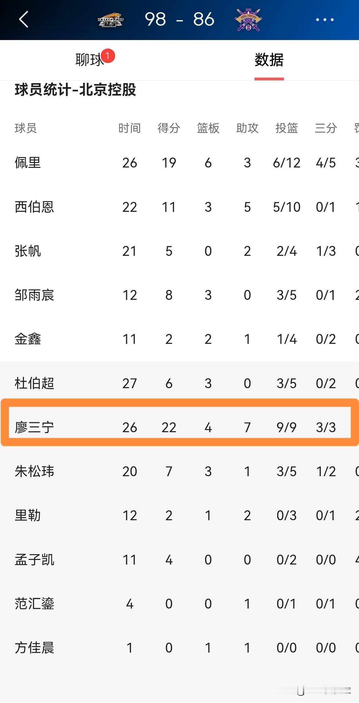 北京控股明星后卫廖三宁真是弹无虚发!虽然今天北京控股在客场以86:98输给了辽宁本钢,但是廖三宁的进攻效率高的离谱。 全场比赛下来,廖三宁替补出战26分钟,投篮9中9,其中三分球3中3、罚球1中1极其高效的砍下22分4篮板7助攻1盖帽。 坦白说,如果廖三宁能够转会到辽宁本钢,从而补强辽宁本钢的控卫实力,那么辽宁本钢将会一跃成为当今CBA实力最强的球队之一。