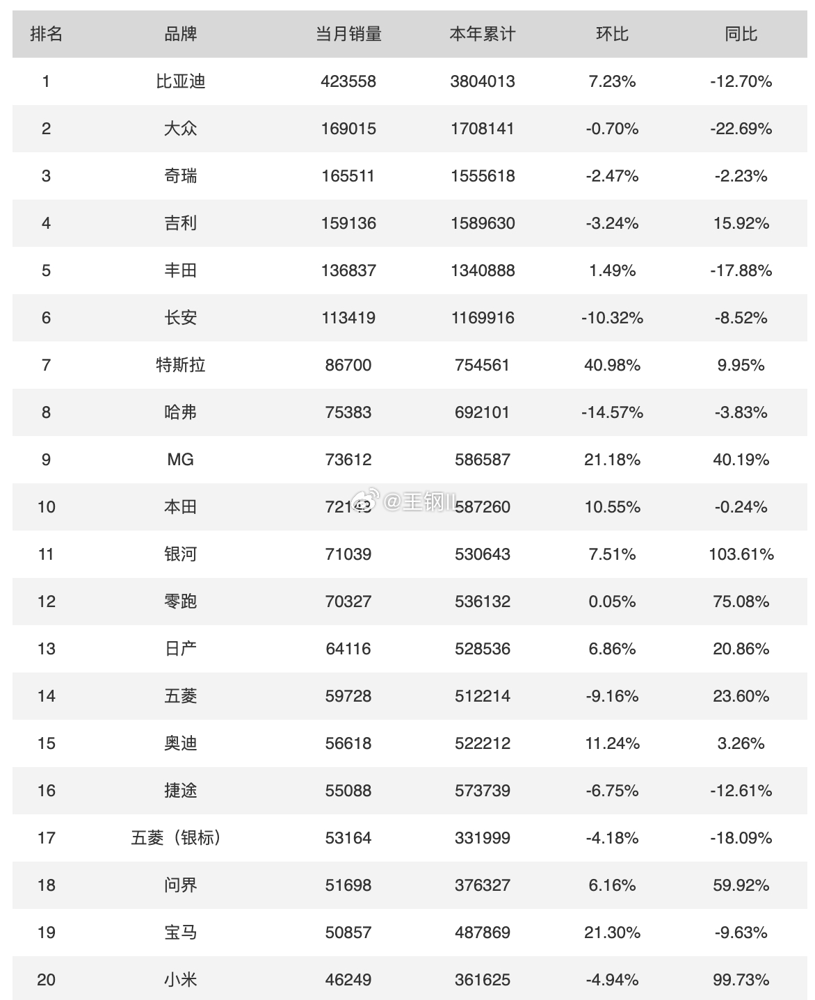 2025年11月所有汽车品牌销量排行榜中,比亚迪销量为423558辆, 位居第一,较去年同期下降12.70%。 大众以169015辆的销量位居第二,较去年同期下降22.69%,本年累计销量达1708141辆。11月奇瑞销量165511辆,排名第三,较去年同期下降2.23%,本年累计销量达1555618辆。