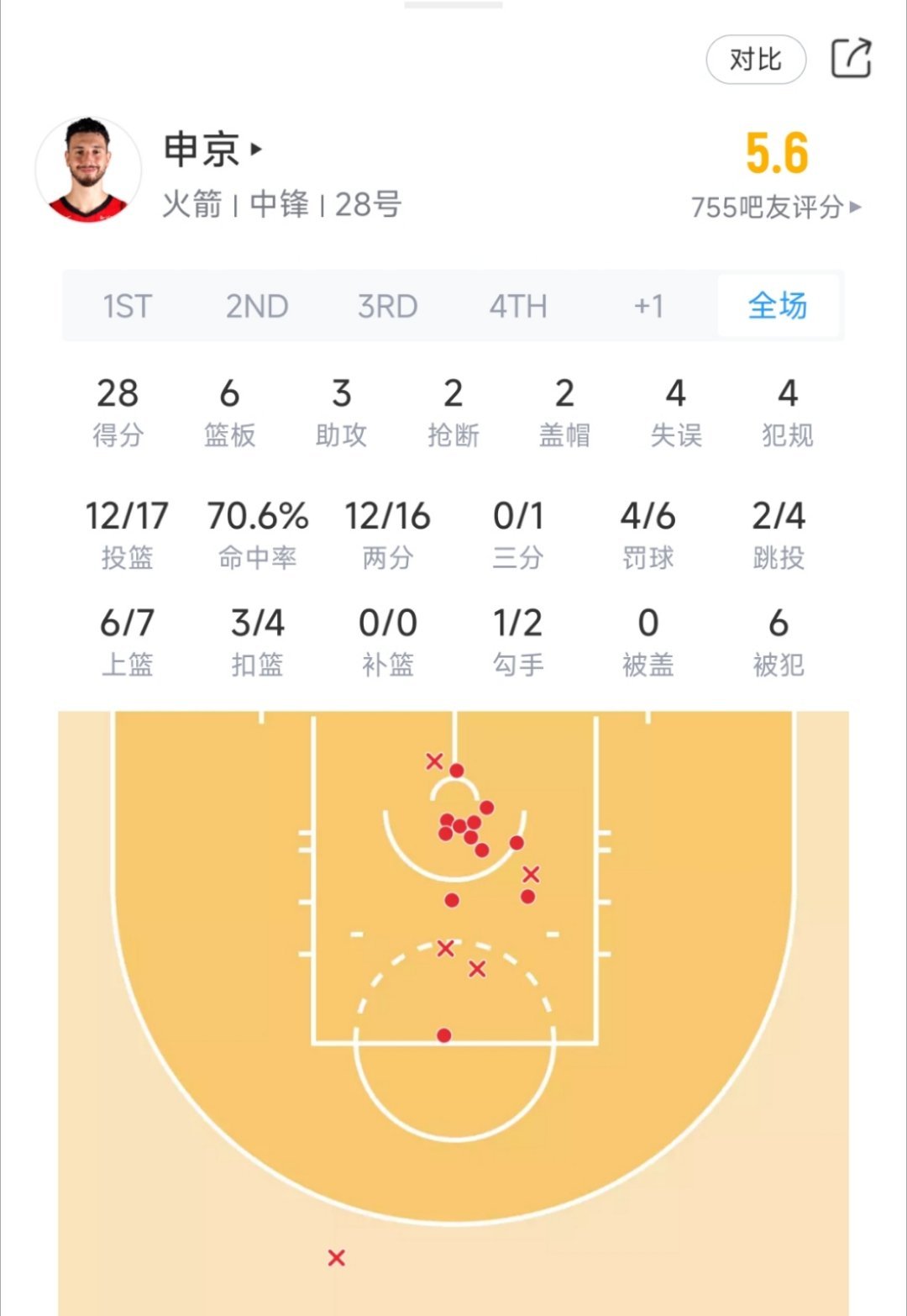 申京今日对阵国王表现:加时赛发挥一般!出战41分钟,投篮17中12,三分球1中0,罚球6中4,拿到28分6篮板3助攻2抢断2盖帽4次失误!火箭vs国王