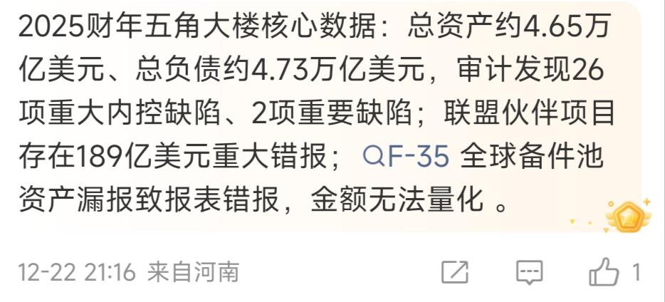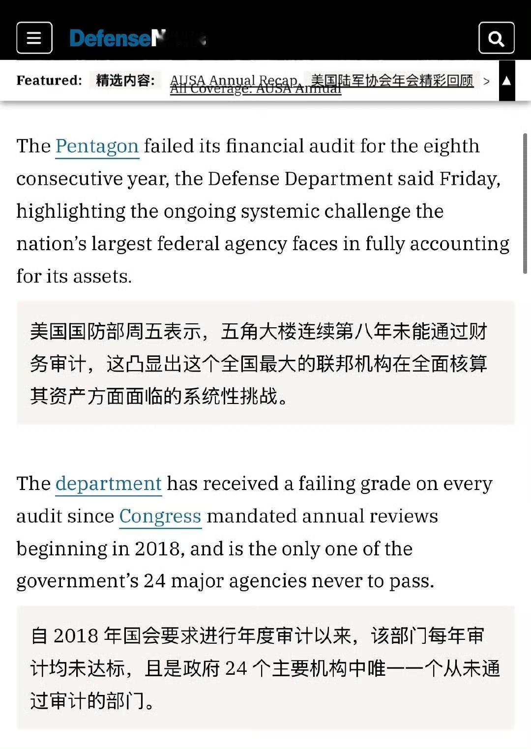 “犯了点小错,人之常情嘛。” “75000磅叫小错?那什么叫大错?” “让人发现了,就叫大错。” 贪了不是问题,被查出来才是。 美国国防部上周星期五表示,五角大楼连续第八年未能通过财务审计。 这事完全能甩锅啊,第一次审核就是一个糊涂账,后面怎么审都审不清楚了。 这事儿,谁都查不了,谁查谁死。你特郎普、海排长、GODE来了又怎样,还不也一样。 上次不是有个审计小组去阿富汗查,结果还没到,飞机就失事了。 其实根本不需要查,查到了就有贪污犯;不查,美国就没有贪污,多好的名声。