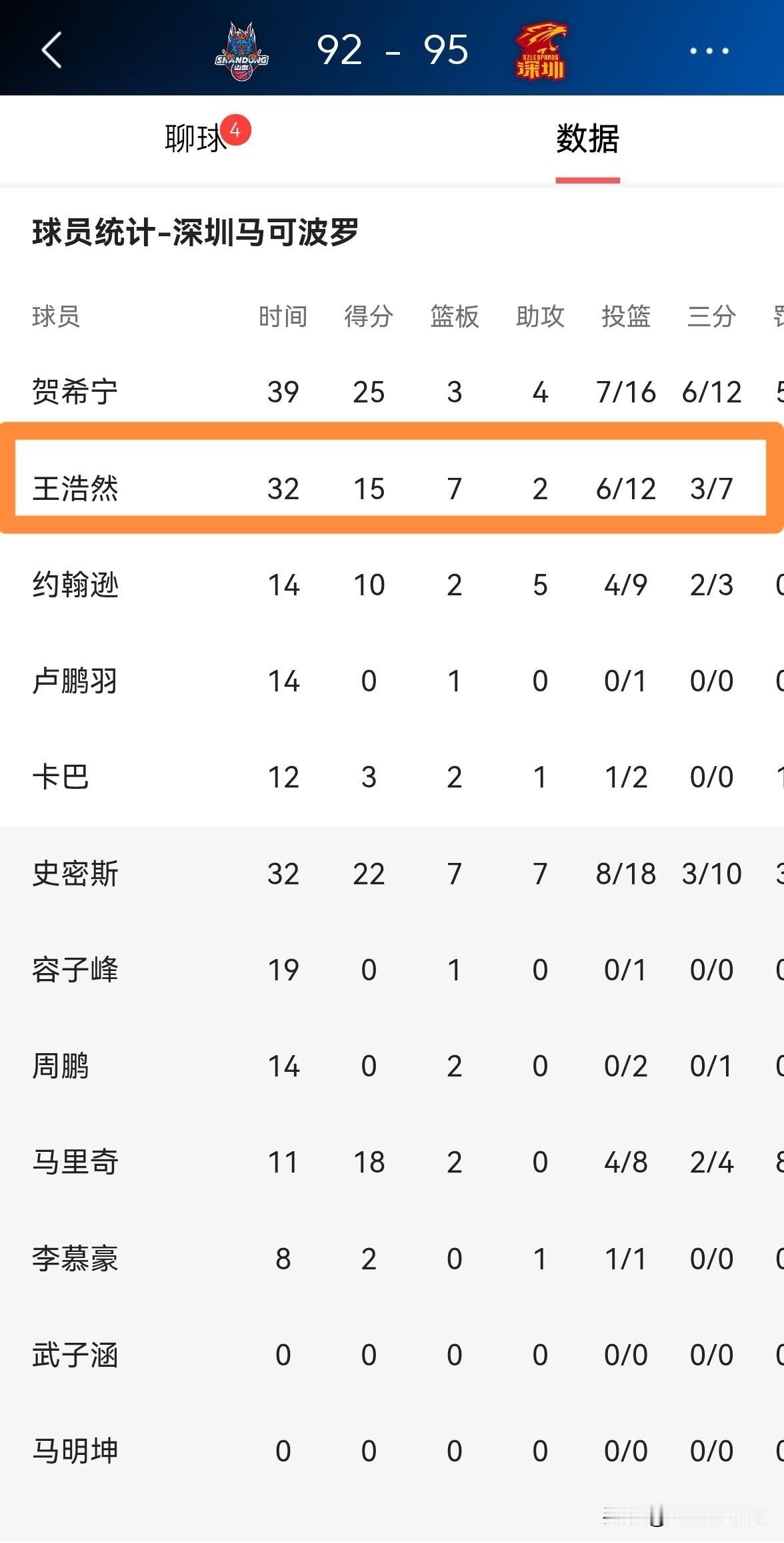 深圳马可波罗新星王浩然真是太霸气了!在今天深圳马可波罗客场以95:92险胜山东高速的比赛中,王浩然在比赛的最后时刻投进了一记让人叹为观止的三分绝杀。 全场比赛下来,王浩然首发出战32分钟,投篮12中6,其中三分球7中3得到15分7篮板2助攻2抢断1盖帽。 坦白说,以王浩然目前的成长速度来看,我觉得不出三年他一定会成为中国男篮的中流砥柱。