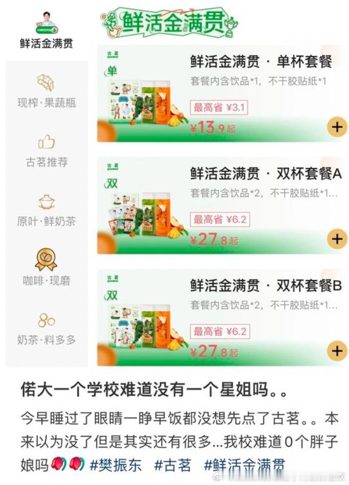 偌大的学校难道没有一个星姐吗。。今早睡过了眼睛一睁早饭都没想先点了古茗。。本来以为没了但是其实还有很多..我校难道0个胖子娘吗