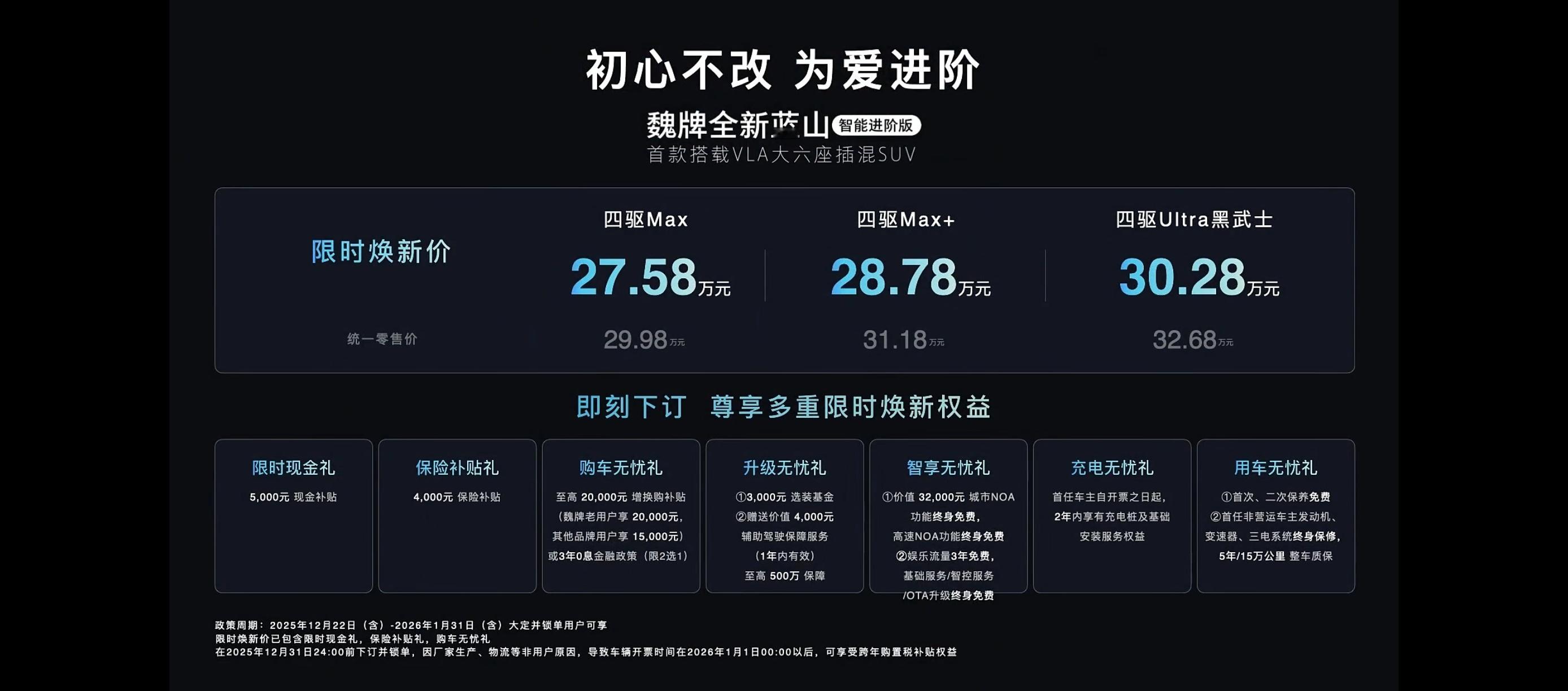 作为魏总站台最多的品牌,9年魏牌扛起了安全的重任,魏老板亲自抓,将安全贯彻到底,从被动安全到主动安全,实现了全面构建。魏建军赌上姓氏造车后悔了吗 姓氏命名,代表了理念的全面贯彻和精神的全面传承,既承载了创始人的荣耀,也需要肩负更多担当。站在长期主义,考量安全坚守,魏牌全新蓝山智能进阶版,再次将安全标准迈了一大步, 蓝山VLA大模型上车首秀 在人人谈便捷,只注重向前奔跑的时代,魏牌选择,全面守护和防护。防御为先的驾驶策略,不盲目激进,而是全盘预判,分析潜在风险守护安全驾驶,深入场景理解风险和意图,帮我们进行预判,同时魏牌的语音控车交互,也更贴心,一句开慢一点就可以让车速降下来,让我们在使用辅助驾驶功能的时候更加有数,用自然简单的指令控制车辆,随时将安心带在身边。所以相比于冒进的新势力,长城更稳妥,更贴心,因为害怕所以有顾虑,因为担心安全,所以全面贯彻守护,聚焦防御性驾驶功能,减少看起来很牛但实际上缺少价值的功能,实打实的做到好用放心用。毕竟长城所覆盖的人群,不仅是尝鲜人群,还需要肩负普及的重任,数十年造车底蕴更懂哪些有所为,有所不为。同时Hi4性能版依然是全新蓝山智能进阶版关键的核心优势,能够应对复杂路况带来稳稳的性能输出,更是有着超省的能耗表现。至于智能进阶可不止是辅助驾驶能力的升级,还做到了智能的协同,毕竟光有硬实力只是基本,还需要充分调度,长城有豪华底盘的功底,更有全新的电子化标准,实现了高能进阶的好表现。空间表现熟悉蓝山的朋友都懂,6座大布局,三排更周到,还有着丰富的储物空间,更是带来了冰箱,彩电,大沙发,满足了家庭用户的所需和所要。因为安全锁定魏牌全新蓝山智能进阶版,又因为贴心功能认同魏牌全新蓝山智能进阶版,最关键的是在使用中,蓝山真的能带来放心、省心的交互,满足好开好坐,充分调用VLA+Hi4智能四驱电混技术,实现智能思考和稳稳的执行,让车坚守安全守护的同时,更懂我们的需要。2025即将进入尾声,选择魏牌全新蓝山智能进阶版正当时,过年开车回家省心更省事,防护性驾驶长途不慌,1343km综合续航里程一箱油到底,还有VLA的语音控车的便捷操作,限时焕新价27.58-30.28万元,2026新年开启新的智能生活。