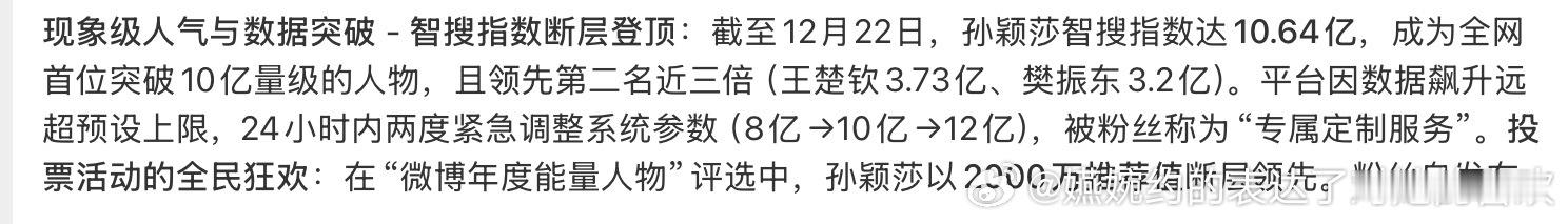 “孙颖莎智搜指数达10.64亿,成为全网首位突破10亿量级的人物,且领先第二名近三倍。平台因数据飙升远超预设上限,24小时内两度紧急调整系统参数(8亿>10亿>12亿)。”微博智搜说的对孙颖莎