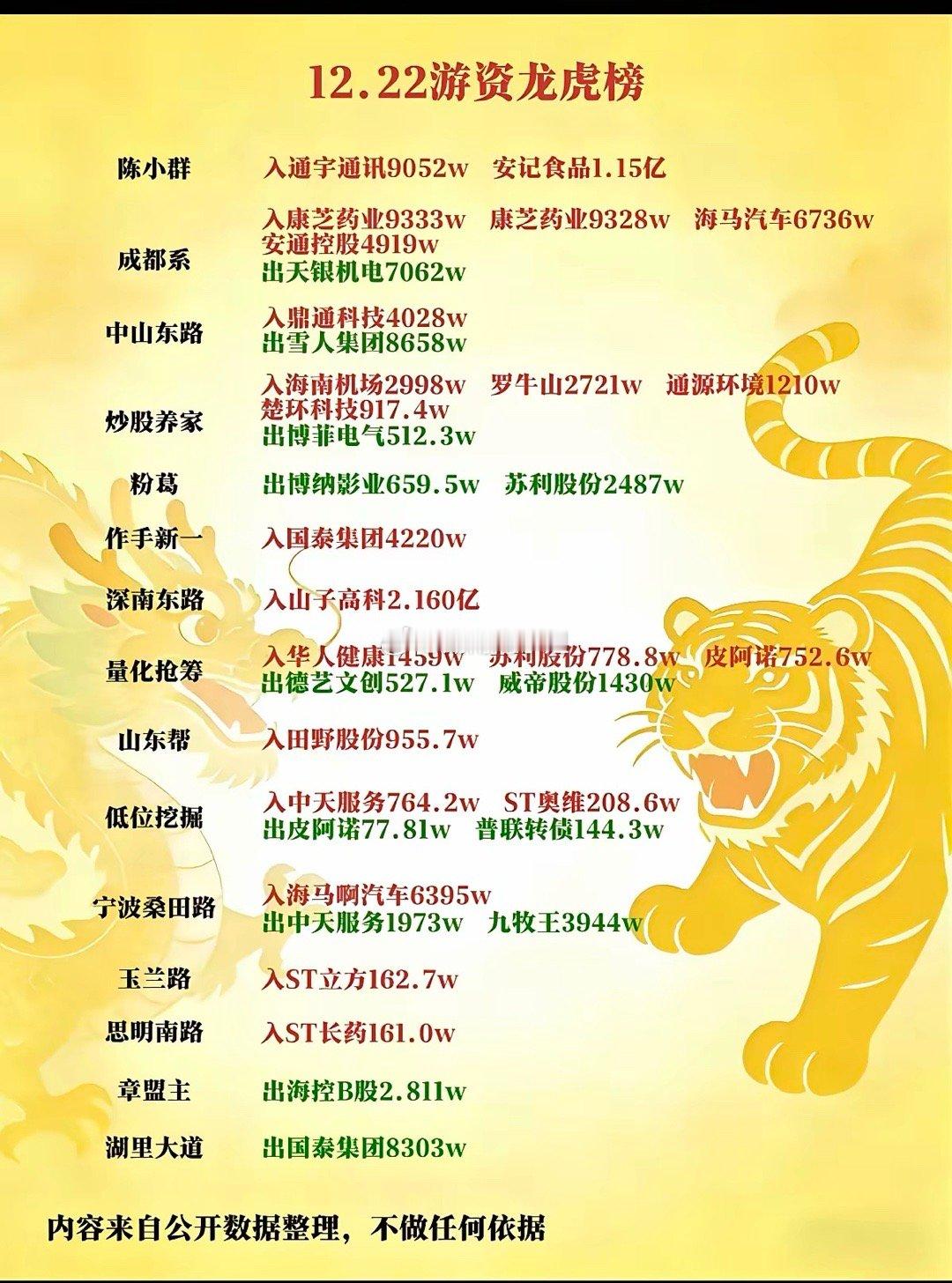 12.22周一 游资抢筹焦点,龙虎榜!总舵主陈小群:入通宇通讯,安记食品中上东路:入鼎通科技炒股养家:抢筹 海南机场,罗牛山宁波桑田路:入 海马汽车
