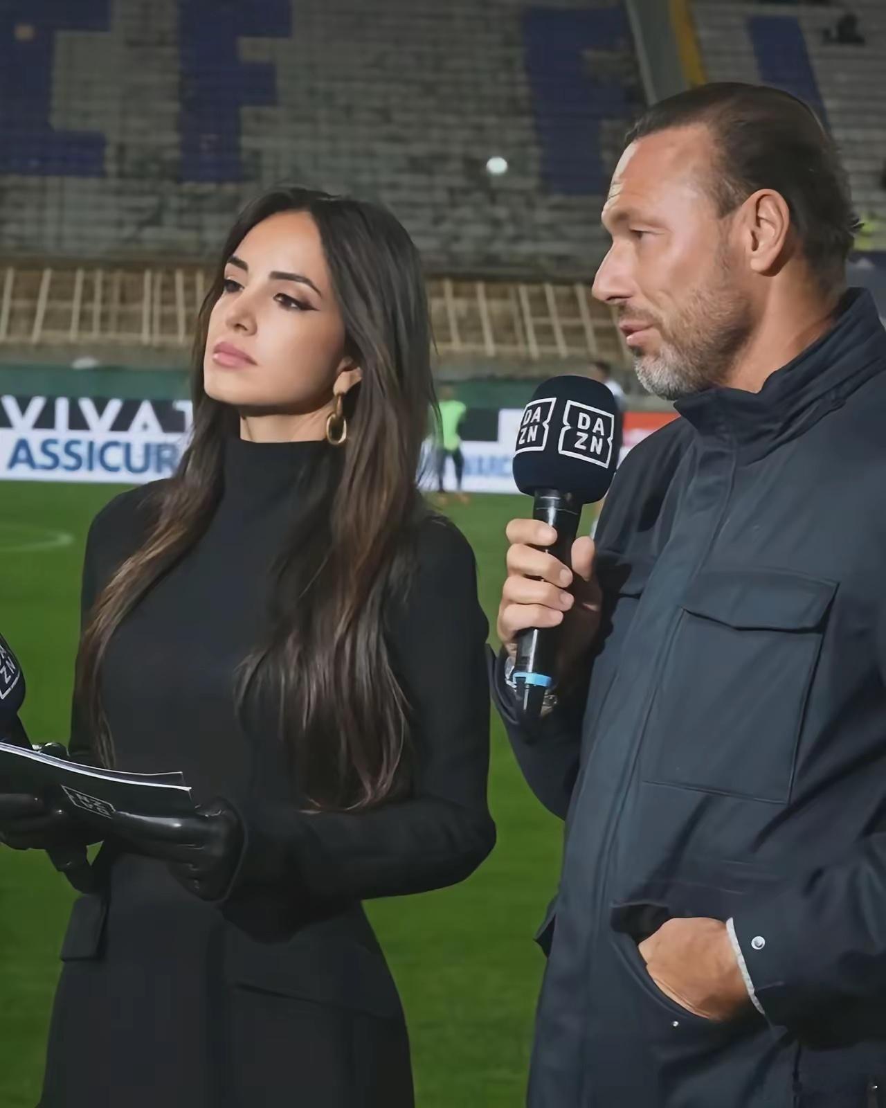 你信不信,有一位主持人厉害到什么程度?比赛还没开打,摄像机只是随手扫了一圈,结果弹幕瞬间沸腾——不是因为球员热身有多猛,而是因为她那一身黑又出现了。吉乌西·梅洛尼,靠黑衣黑裙黑丝黑高跟,把场边走成T台。她一入镜,连比赛都要让半秒。有没有感觉,和c罗女友有的一拼
