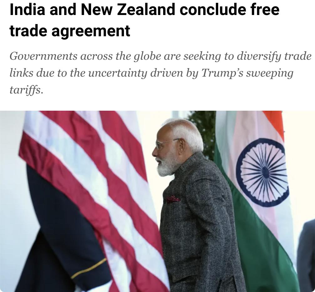 外媒:印度和新西兰达成自由贸易协定,预计2026年第一季度正式签署。 该协定将使印度对新西兰所有商品出口免关税,新西兰约70%的出口商品将分阶段获得印度市场准入,覆盖95%的出口额。新西兰将扩大对印的乳制品、水果、羊毛和葡萄酒出口,印度的纺织品、工程产品、皮革和海产品等将受益于零关税进入新西兰市场。 新西兰还承诺未来15年在印度投资200亿美元,印度专业人士也将更容易进入新西兰就业市场。该协定旨在应对美国关税政策带来的贸易不确定性,推动两国经济多元化发展。