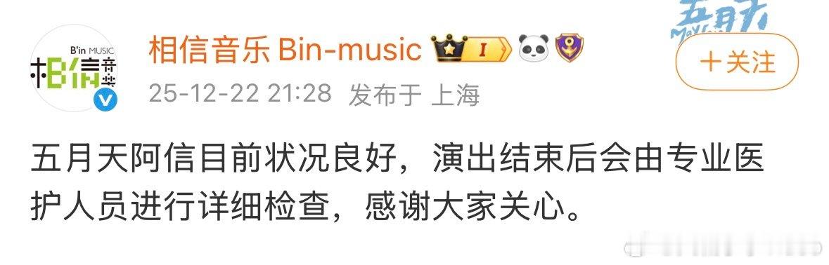 【阿信方报平安】阿信状况良好 12月22日,就阿信摔下舞台,发文: 五月天阿信目前状况良好,演出结束后会由专业医护人员进行详细检查,感谢大家关心。