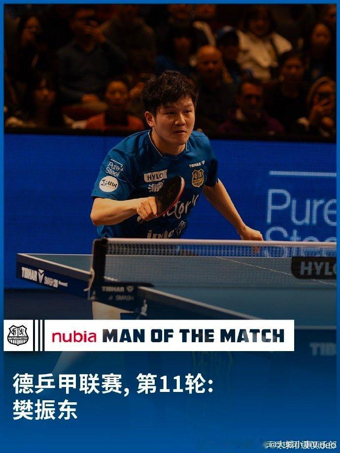 【樊振东当选德甲11轮最佳球员】12月22日,公布球迷投票结果,“在TTBL第11轮对阵杜塞尔多夫的比赛中,以 90% 的得票率当选 nubia 本场最佳球员(Man of the Match)!??感谢所有参与投票的球迷,也祝贺樊振东!? ”