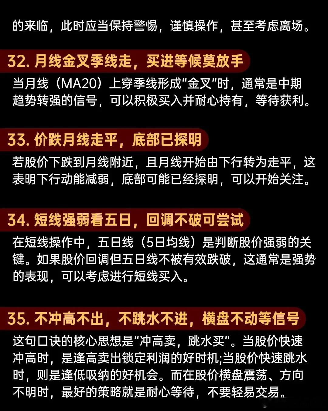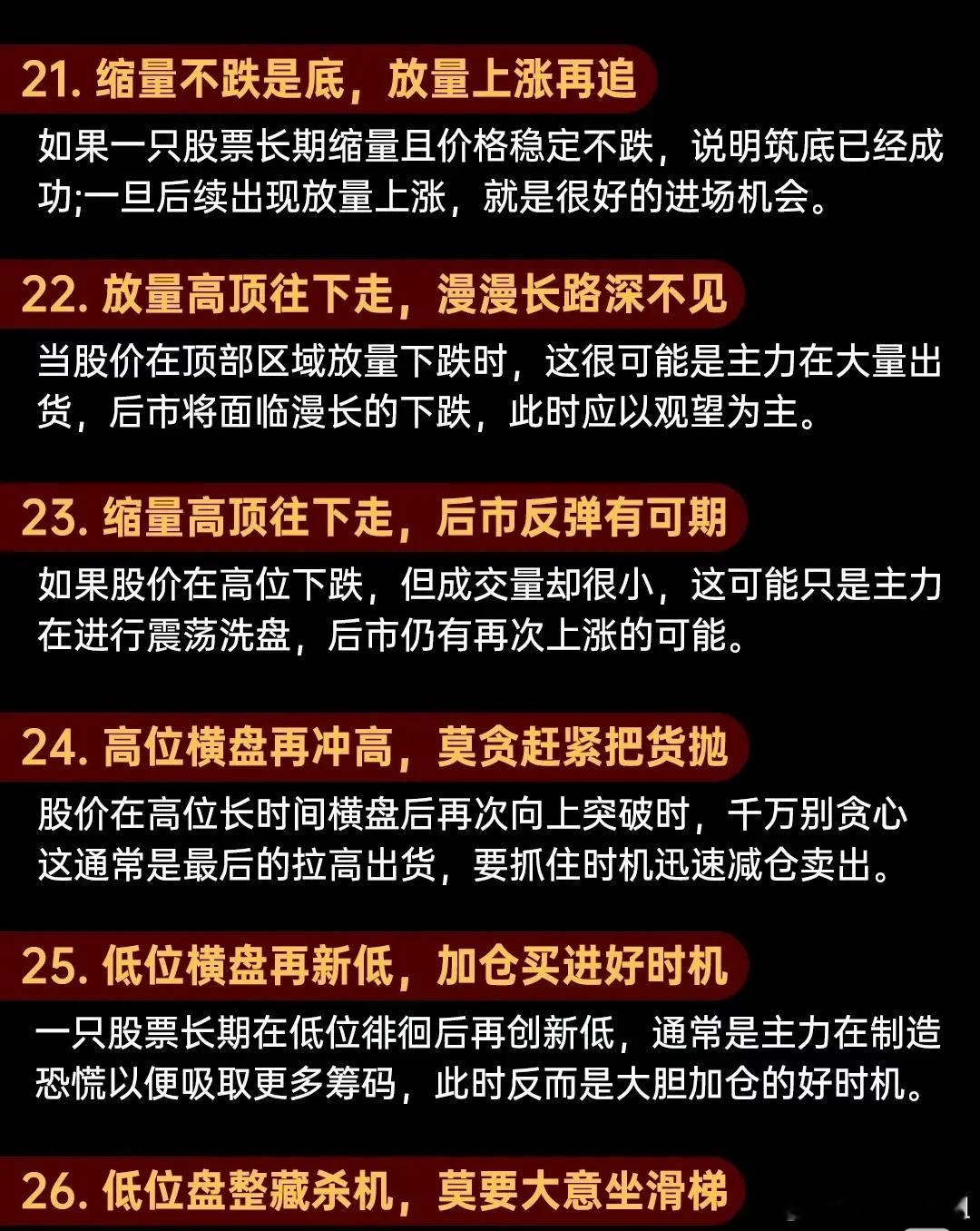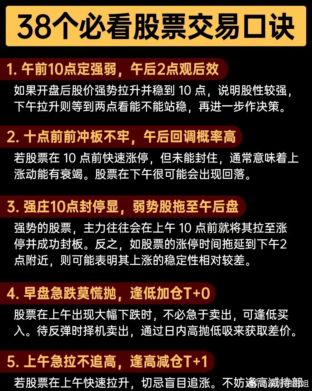 38条股票交易核心口诀与技巧,围绕买卖时机、风险识别、趋势判断展开,可概括为:1. 时机判断:早盘10点定强弱(强庄10点前封停)、午后2点看后效;早盘急跌不抛(可T+0)、急拉不追高(宜T+1);午后飙升减仓、骤跌待次日;尾盘急杀多为洗盘(次日或高开),临近收盘涨停次日易低开。2. 量价与形态:急跌无量多为洗盘,缓跌放量/放量不涨是出货;缩量不跌是底、放量上涨再追;放量不涨是顶、缩量不跌是底;横盘/探坑买入,鼎沸处卖出;不冲高不出、不跳水不进,横盘等信号。3. 趋势与均线:年线抬头回踩可买、向下勿接;季线踩位做波段、下破有风险;月线金叉季线转强,价跌月线走平探底;短线看5日线(回调不破可试);线上阴线买、线下阳线卖,买阴卖阳。4. 风险提示:换手率3%左右常态,超5%不追、超30%当心;正股不涨权证涨是诱多;高位横盘再冲高是出货,低位横盘防假底;巨量阳线尾盘离场。整体聚焦低吸高抛、顺势而为、规避风险,帮投资者把握买卖点、识别主力意图。