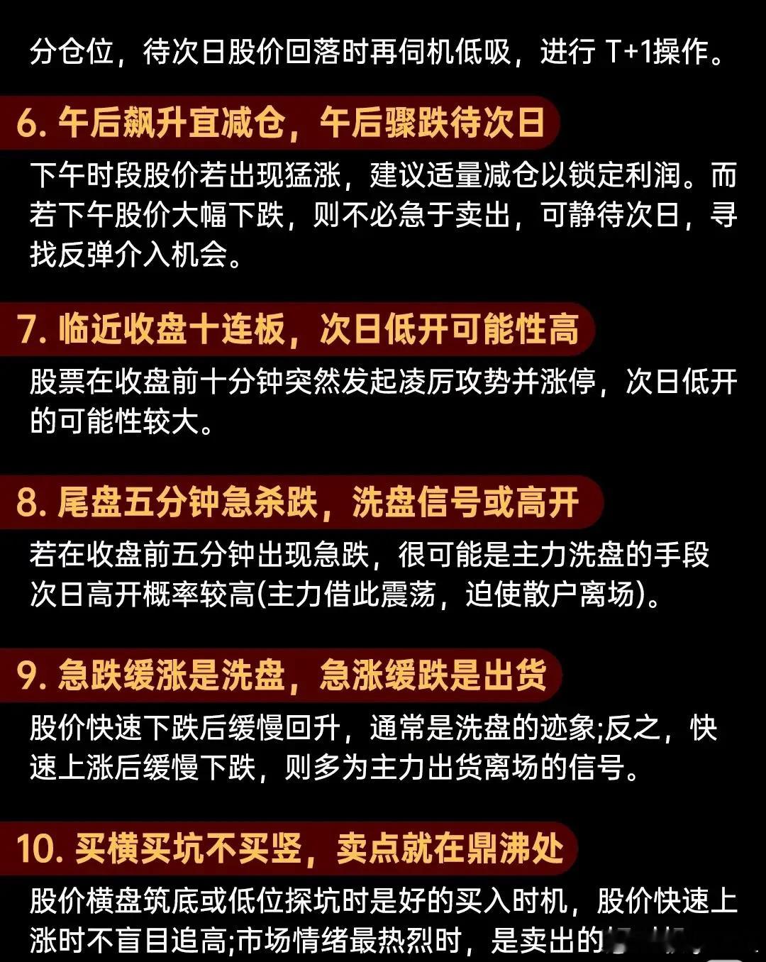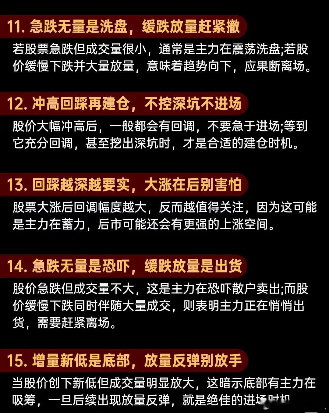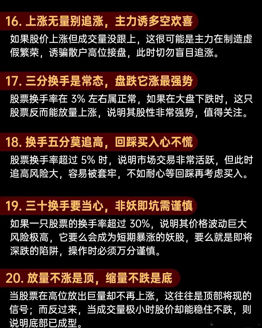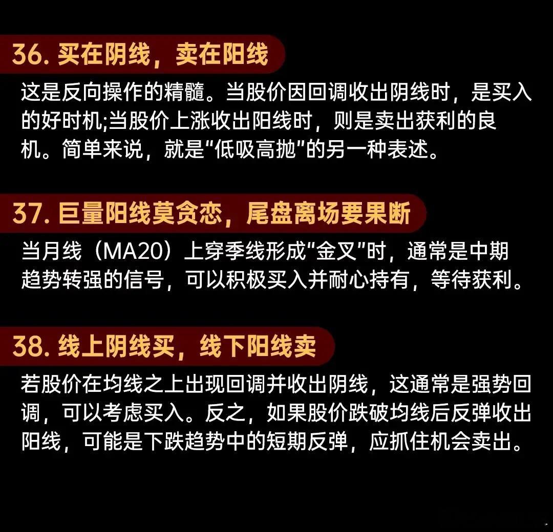 38条股票交易核心口诀与技巧,围绕买卖时机、风险识别、趋势判断展开,可概括为:1. 时机判断:早盘10点定强弱(强庄10点前封停)、午后2点看后效;早盘急跌不抛(可T+0)、急拉不追高(宜T+1);午后飙升减仓、骤跌待次日;尾盘急杀多为洗盘(次日或高开),临近收盘涨停次日易低开。2. 量价与形态:急跌无量多为洗盘,缓跌放量/放量不涨是出货;缩量不跌是底、放量上涨再追;放量不涨是顶、缩量不跌是底;横盘/探坑买入,鼎沸处卖出;不冲高不出、不跳水不进,横盘等信号。3. 趋势与均线:年线抬头回踩可买、向下勿接;季线踩位做波段、下破有风险;月线金叉季线转强,价跌月线走平探底;短线看5日线(回调不破可试);线上阴线买、线下阳线卖,买阴卖阳。4. 风险提示:换手率3%左右常态,超5%不追、超30%当心;正股不涨权证涨是诱多;高位横盘再冲高是出货,低位横盘防假底;巨量阳线尾盘离场。整体聚焦低吸高抛、顺势而为、规避风险,帮投资者把握买卖点、识别主力意图。