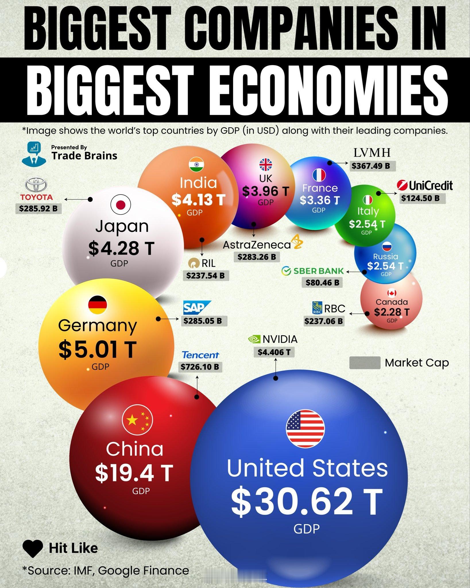 【最大经济体中最大的公司】 以下是按 GDP(美元)排名的世界顶级国家以及推动其经济发展的领先企业的概况。本图片显示了全球GDP(美元)排名前列的国家及其领先企业。常涤非超话老常政经数据可视化