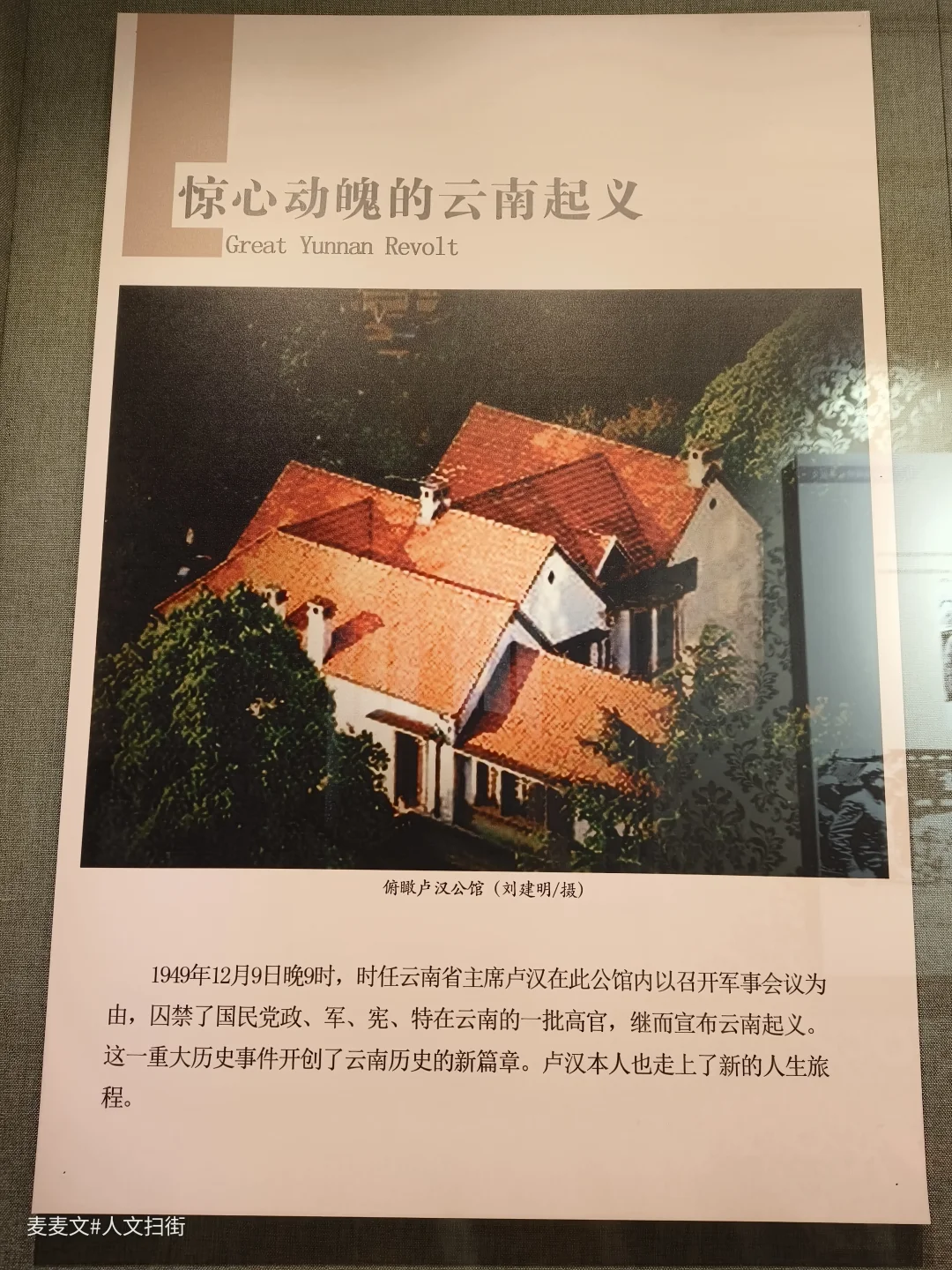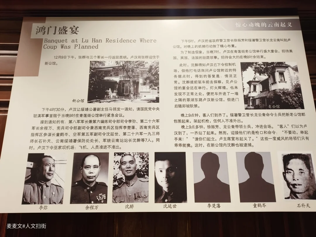 云南起义纪念馆,利用昆明卢汉公馆建成的纪念馆。卢汉公馆见证了云南和平起义的全过程,具有重要历史价值。云南起义纪念馆一层为卢汉客厅、卢汉会议室以及标准展厅等,二层为卢汉办公室、卢汉卧室、卢汉夫人卧室以及书房等。