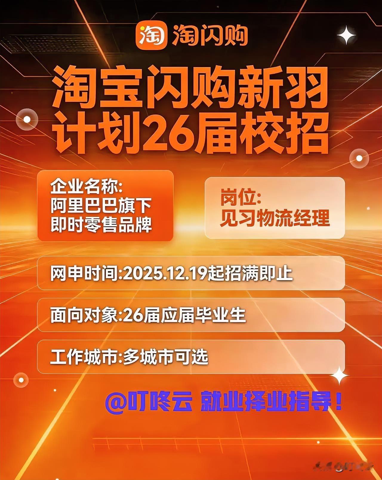 淘宝闪购新羽计划26届校招正式启动!2025.12.19开始网申,工作城市全国多地可以选择!速速登录官网查询招聘岗位要求,极速报名投递简历![点亮平安灯][点亮平安灯][烟花][烟花]快来围观揭秘详细内容。欢迎关注@叮咚云 ,将优先为粉丝提供职业规划指导![点亮平安灯][点亮平安灯][来看我][来看我][比心][比心] 免责声明:图片来自网络,仅供参考!