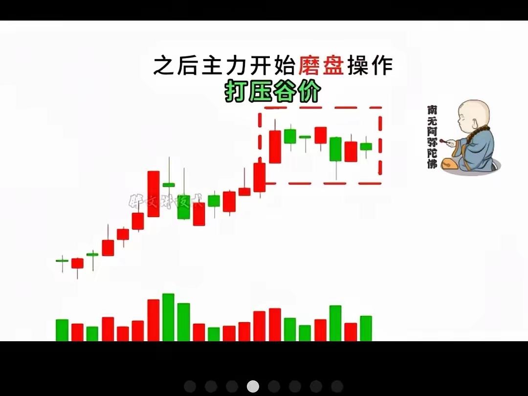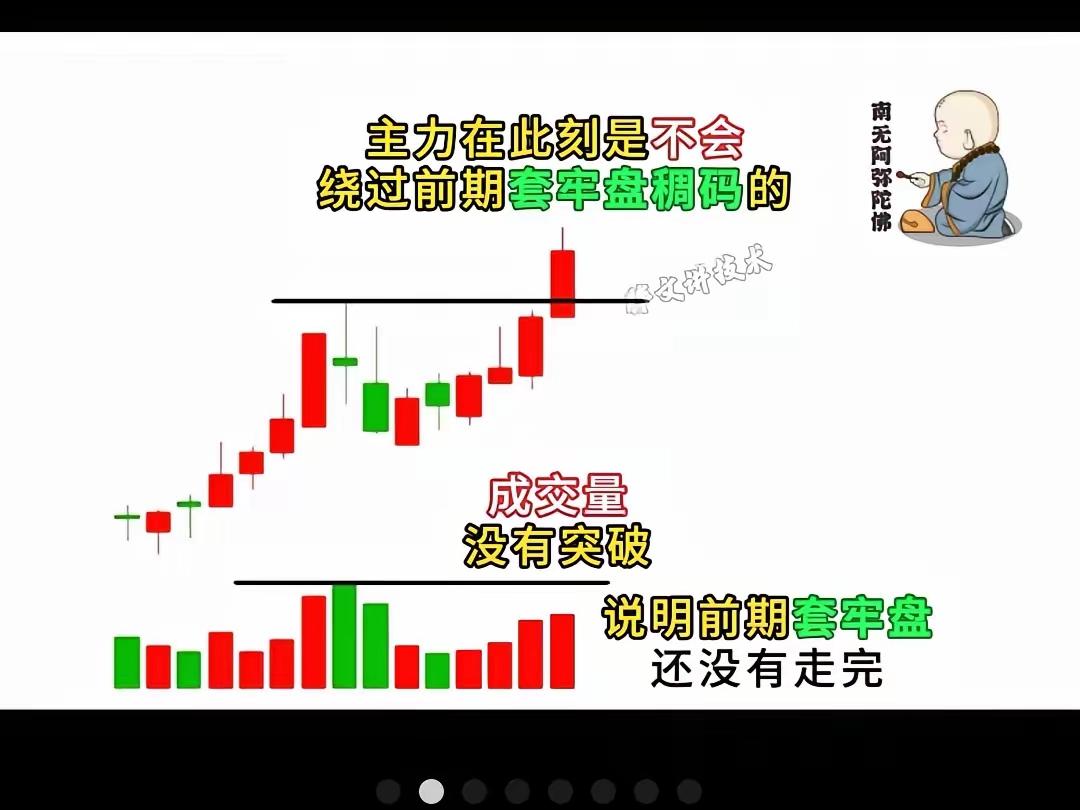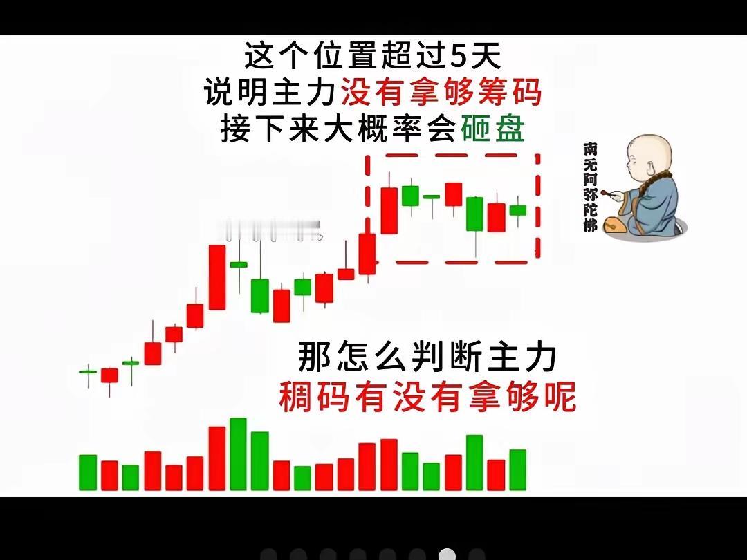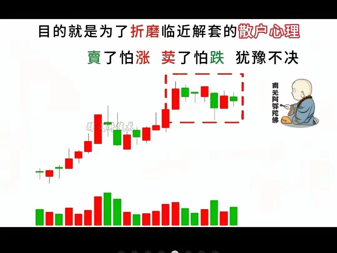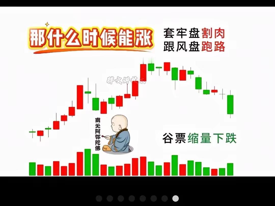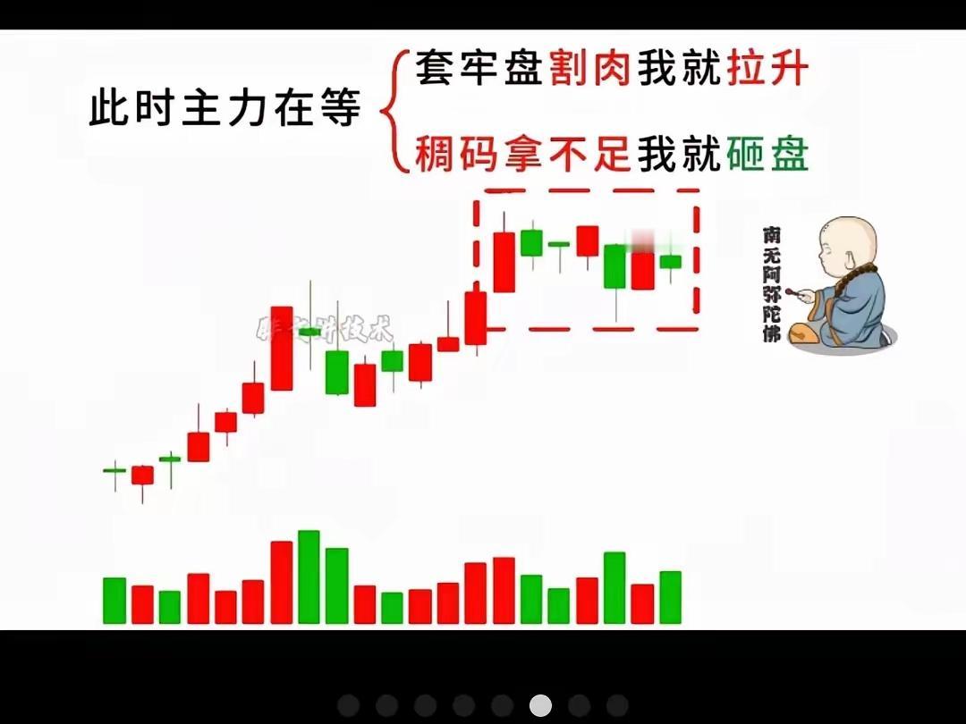 股票市场中主力与套牢盘的博弈逻辑及操作策略: 首先指出股价突破(谷价突破)只是信号,需结合成交量是否突破前高判断有效性;若成交量未突破,说明前期套牢盘尚未消化,主力不会绕过套牢盘筹码,此时建议以观望为主。随后提到主力会通过“磨盘操作打压谷价”,目的是折磨临近解套散户——“卖了怕涨、卖了怕跌”的犹豫心态。 进一步揭示主力策略:等待套牢盘割肉后拉升,若筹码拿不足就砸盘;并给出判断主力筹码是否拿够的方法——某位置超过5天未满足,说明筹码不足,接下来大概率砸盘。最后解答“什么时候能涨”的问题,明确需等待“套牢盘割肉、跟风盘跑路”,而当前处于“股票缩量下跌”状态。 整体通过技术分析(K线、成交量)与主力行为解读,串联起从突破信号验证到主力洗盘、筹码博弈再到上涨条件的完整逻辑链,全程以“南无阿弥陀佛”的卡通和尚点缀,风格简洁直白。