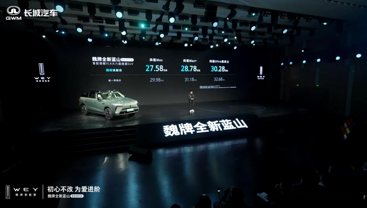 魏牌全新蓝山智能进阶版的限时焕新价格来了,起售27.58万元,一共有三个版本可选。这台车的产品力还是很强的,辅助驾驶方面全系标配了VLA大模型,这次还安排上了辅助驾驶小蓝灯,还有全新电容方向盘标配Thor U(700TOPS)芯片。性能方面则是搭载了Hi4智能四驱电混技术,安全方面也非常让人放心。值得一提的是,VLA+Hi4这对黄金搭档,在超车、雨天湿滑路面等场景下,有着非常不错的表现。话说,你觉得新车价格如何?蓝山VLA大模型上车首秀魏建军赌上姓氏造车后悔了吗