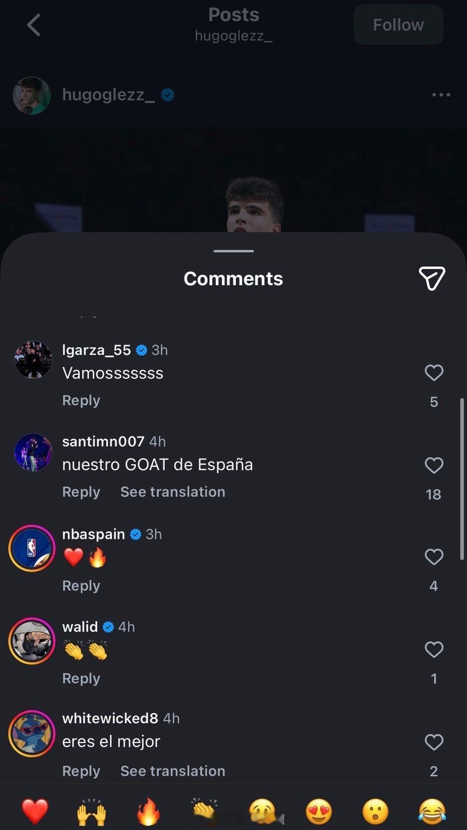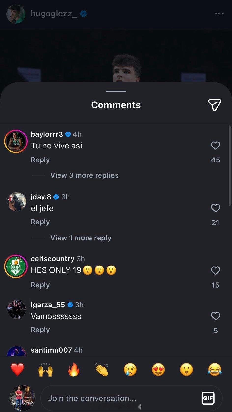 队友们在雨果-冈萨雷斯的最新IG评论区秀了几句西班牙语😂约什-米诺特:“老大。”(El jefe)卢卡-加尔扎:“冲啊——”(Vamossss)贝勒-沙伊尔曼:“你可不是这么过日子的。”(Tu no vive asi,这是说唱歌手 Bad Bunny 的歌词,常被用来玩梗调侃)