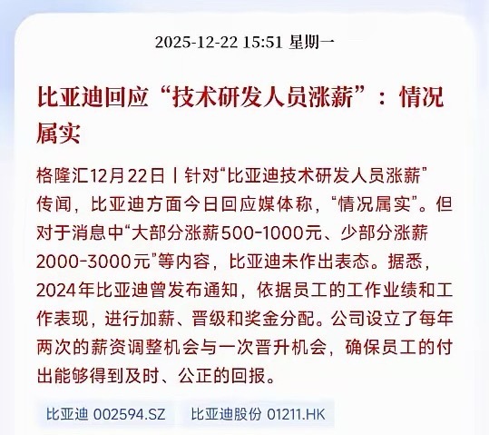 比亚迪真的是良心企业,全民降薪的情况下比亚迪居然涨薪今年的环境所有人都知道找个工作多么的不容易,还有很多企业直接降薪或者企业倒闭的,更多的人是被优化。在这种情况下,比亚迪居然宣布涨薪,平均在1000元左右,这可真是不一样。现在不管是在大厂工作还是在国企,今年不被优化就已经是很好的工作了,能够涨薪的企业真的很少,能够涨薪的大厂就更少了。比亚迪此举给那些裁员或者降薪的企业做了个表率,能够涨薪的企业才是好企业,这才是支持消费的重要一环。