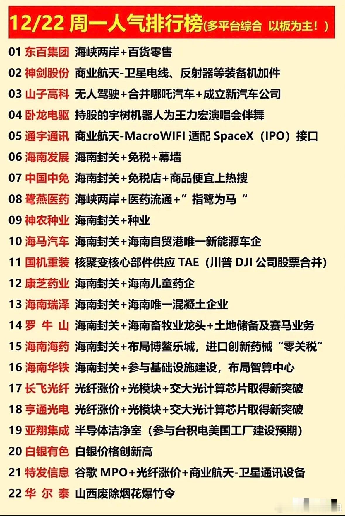 12/22周一的多平台综合人气榜梳理分析!咱们以涨停板为核心参考,个股热点集中在海南封关、商业航天、海峡两岸三大主线,同时叠加无人驾驶、光纤涨价、核聚变等细分题材,政策驱动与产业趋势结合的特征显著,事件性炒作也成为部分个股的人气催化点。个股分析1. 东百集团:依托海峡两岸+百货零售题材上榜,是海峡两岸经贸联动的核心标的之一,零售业务的线下场景属性与区域政策形成共振,成为该题材的人气代表。2. 神剑股份:卡位商业航天赛道,主营卫星电线、反射器等装备机加件,是航天装备制造环节的细分标的,受益于商业航天产业的发展提速,赛道成长性为核心看点。3. 山子高科:绑定无人驾驶+哪吒汽车合并、新汽车公司成立题材,汽车产业整合与智能驾驶技术落地形成双重驱动,产业动态成为短期人气催化。4. 卧龙电驱:因持股的宇树机器人为王力宏演唱会伴舞出圈,属事件性炒作,机器人应用的话题性取代基本面,成为短期人气拉升的核心因素。5. 通宇通讯:聚焦商业航天的MacroWIFI技术,适配SpaceX(IPO)接口,是商业航天通信环节的标的,技术适配头部企业的属性提升了题材稀缺性。6. 海南发展:叠加海南封关+免税+幕墙业务,海南封关政策为核心驱动,免税消费与幕墙基建的双重属性,贴合自贸港建设的消费和基建双需求。7. 中国中免:凭借海南封关+免税店+商品便宜上热搜的题材,作为免税行业龙头,海南免税消费的热度直接推高其市场关注度,品牌优势凸显。8. 鹭燕医药:紧扣海峡两岸+医药物流题材,还叠加“指鹭为马”的话题性,区域医药流通的业务属性与海峡两岸经贸联动形成独特的题材结合点。9. 神农种业:背靠海南封关+种业题材,海南自贸港的农业政策红利与种业国产替代逻辑共振,是农业细分领域的政策驱动型标的。10. 海马汽车:主打海南封关+海南自贸港唯一新能源车企标签,地域属性的稀缺性显著,新能源汽车产业与海南政策形成双重利好支撑。11. 国机重装:布局核聚变核心部件供应,还关联TAE、川普DJI公司股票合并题材,核聚变赛道的技术壁垒成为其核心题材支撑,赛道成长性突出。12. 康芝药业:叠加海南封关+海南儿童药企属性,海南地域政策红利下,儿童医药的细分赛道优势让其成为海南医药题材的特色标的。13. 海南瑞泽:依托海南封关+海南唯一混凝土企业的稀缺性,是海南基建建材环节的核心标的,自贸港建设的基建需求为其题材赋能。14. 罗牛山:聚焦海南封关+海南畜牧业龙头,还叠加土地储备及赛马业务,农业龙头属性与特色文旅题材结合,题材维度更为多元。15. 海南海药:绑定海南封关+博鳌乐城布局、进口创新药械“零关税”,医药械进口的政策红利与海南医疗产业布局形成共振,政策受益性明确。16. 海南华铁:依托海南封关+基础设施建设、智算中心布局,海南基建升级与数字经济(智算)的结合,成为自贸港建设的双主线标的。17. 长飞光纤:受益于光纤涨价+光模块+交大光计算芯片新突破,光纤通信的价格周期回升与光芯片技术突破,形成产业和技术的双重催化。18. 亨通光电:叠加光纤涨价+光模块+交大光计算芯片新突破,与长飞光纤同属光纤通信赛道,技术突破与产品涨价的共振效应推高人气。19. 亚翔集成:主营半导体洁净室,有参与台积电美国工厂建设的预期,半导体基建的海外订单预期,成为其短期人气的核心驱动点。20. 白银有色:因白银价格创新高上榜,贵金属价格的周期波动直接催化题材热度,属于大宗商品价格驱动的短期交易性标的。21. 特发信息:绑定谷歌MPO+光纤涨价+商业航天-卫星通讯设备,光纤涨价与商业航天通信的双重题材,叠加海外技术合作预期,看点多元。22. 华尔泰:因山西废除烟花爆竹令上榜,事件性政策调整成为短期题材催化,烟花爆竹相关化工业务受益于政策放开的预期,属事件驱动型标的。总结今日人气榜体现出市场短期热点围绕政策驱动(海南封关、海峡两岸)和产业趋势(商业航天、光纤/半导体)展开,事件性炒作仅为补充;个股人气的核心支撑来自政策落地预期、产业赛道成长性,以及地域/细分领域的稀缺性,题材轮动也以这两大维度为核心锚点。本文涉及资讯、数据等内容来自网络公共信息,仅供参考,不构成投资建议!