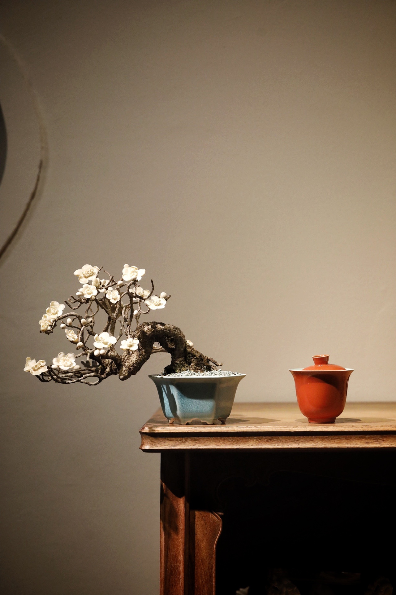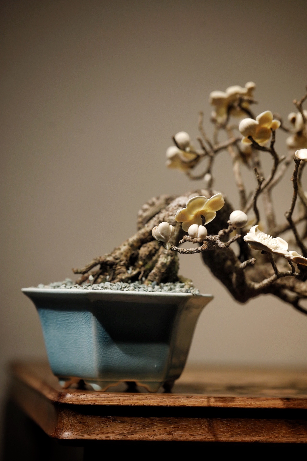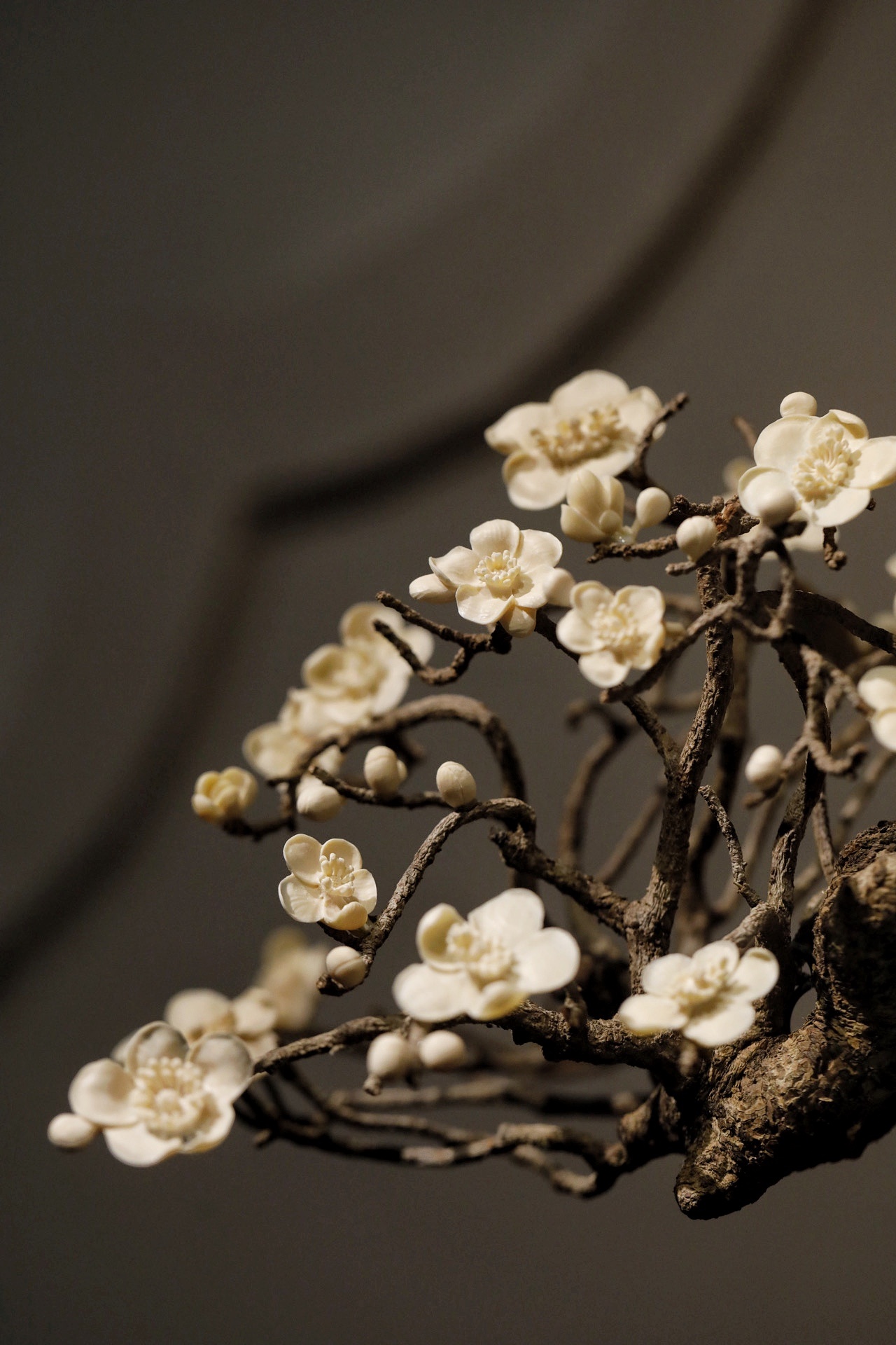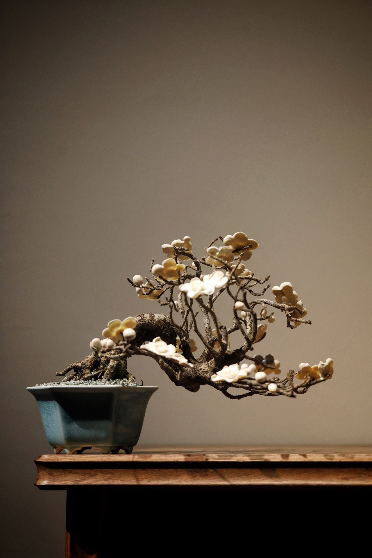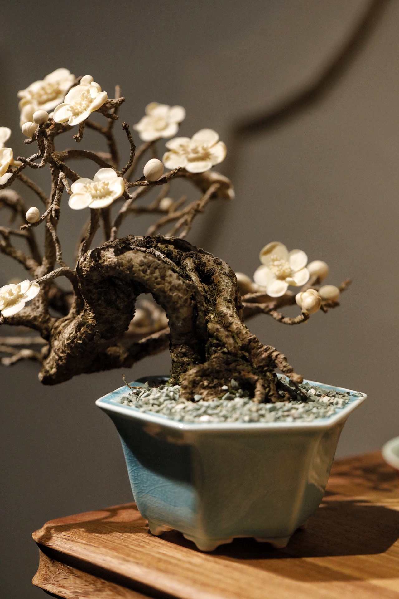 枯木×猛犸|“咏梅”盆景取枯木之虬枝为骨,嵌猛犸之质塑梅魂,老干蜿蜒苍劲,梅朵冰洁玲珑,一花一萼雕琢入微,枯木的沧桑与猛犸料的温润相映成趣,案头置此,尽得“疏影横斜”的梅韵雅意。26×21×20cm