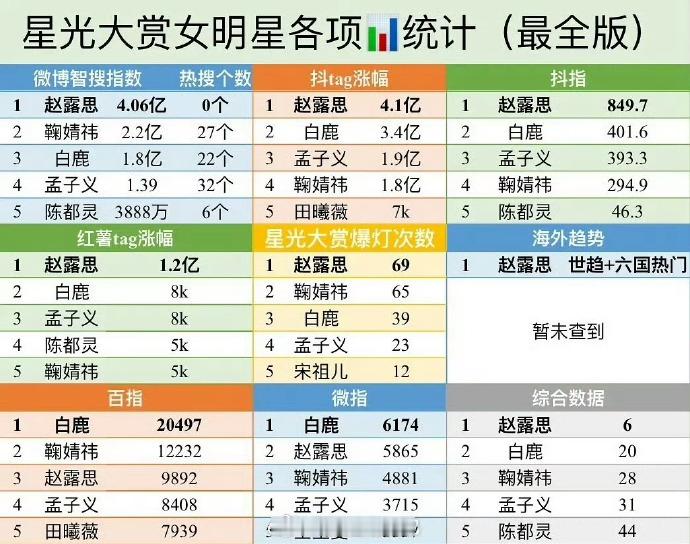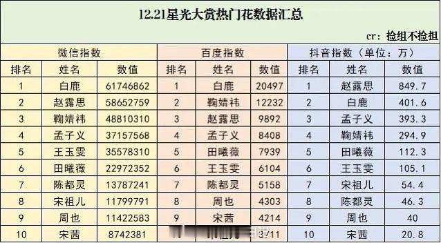 星光大赏数据 昨天星光大赏红毯数据女星前三:赵露思,白鹿,鞠婧祎男星前三:丁禹兮,刘宇宁,王安宇?王安宇的数据我看不懂,氪金排名很后,昨天各种梗也没怎么看见王安宇的身影呀,莫名那三个指数数据很高