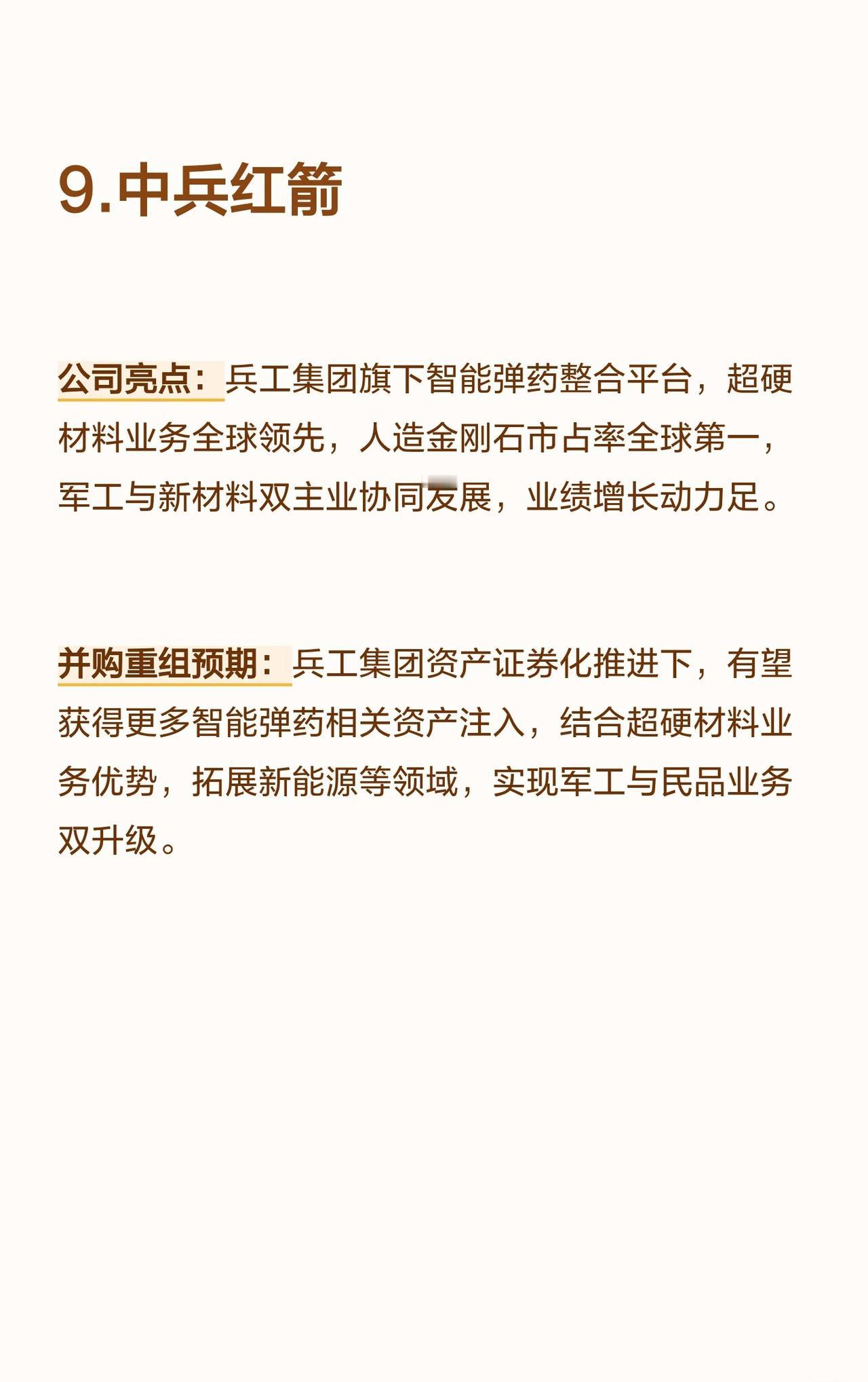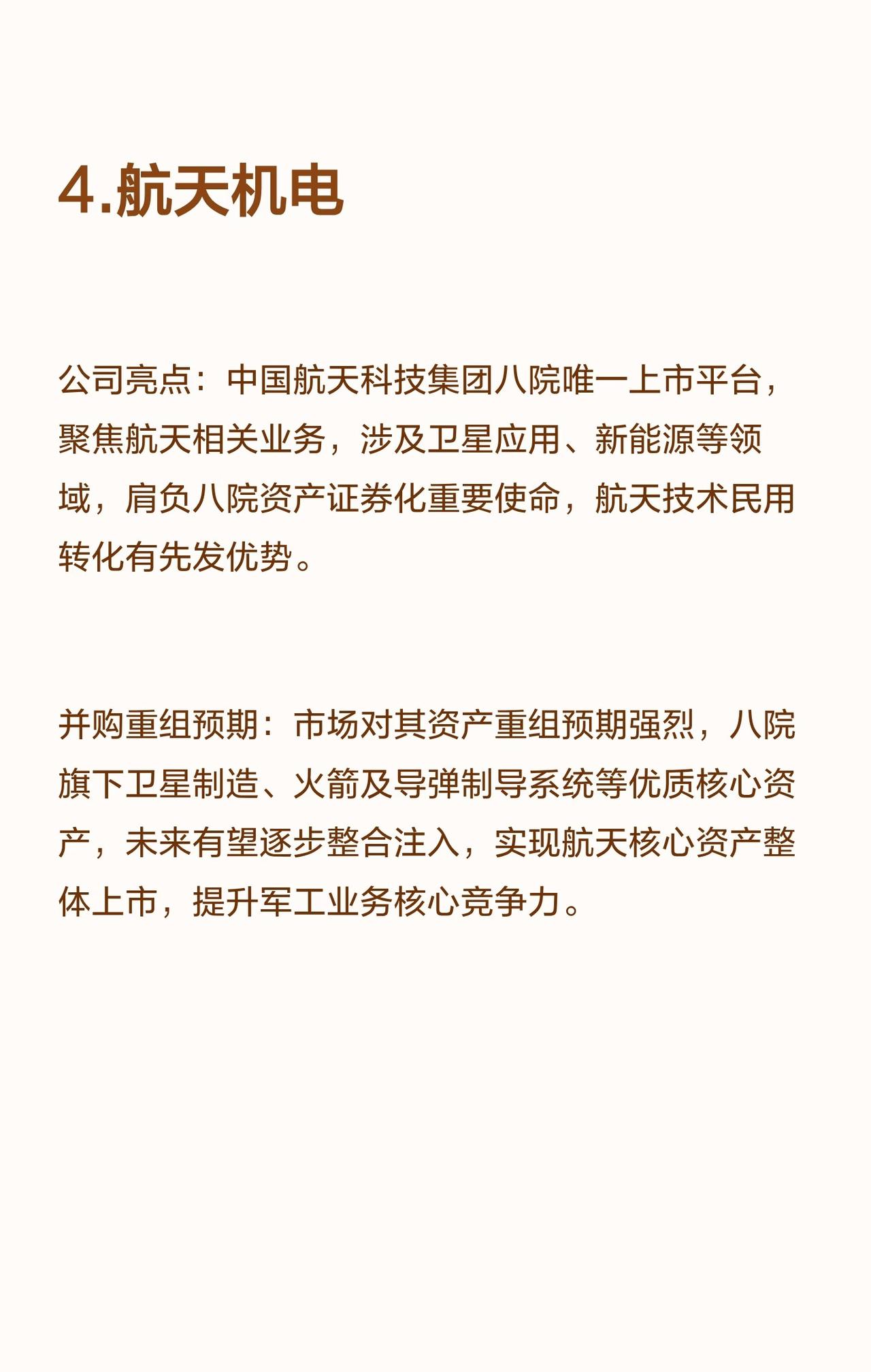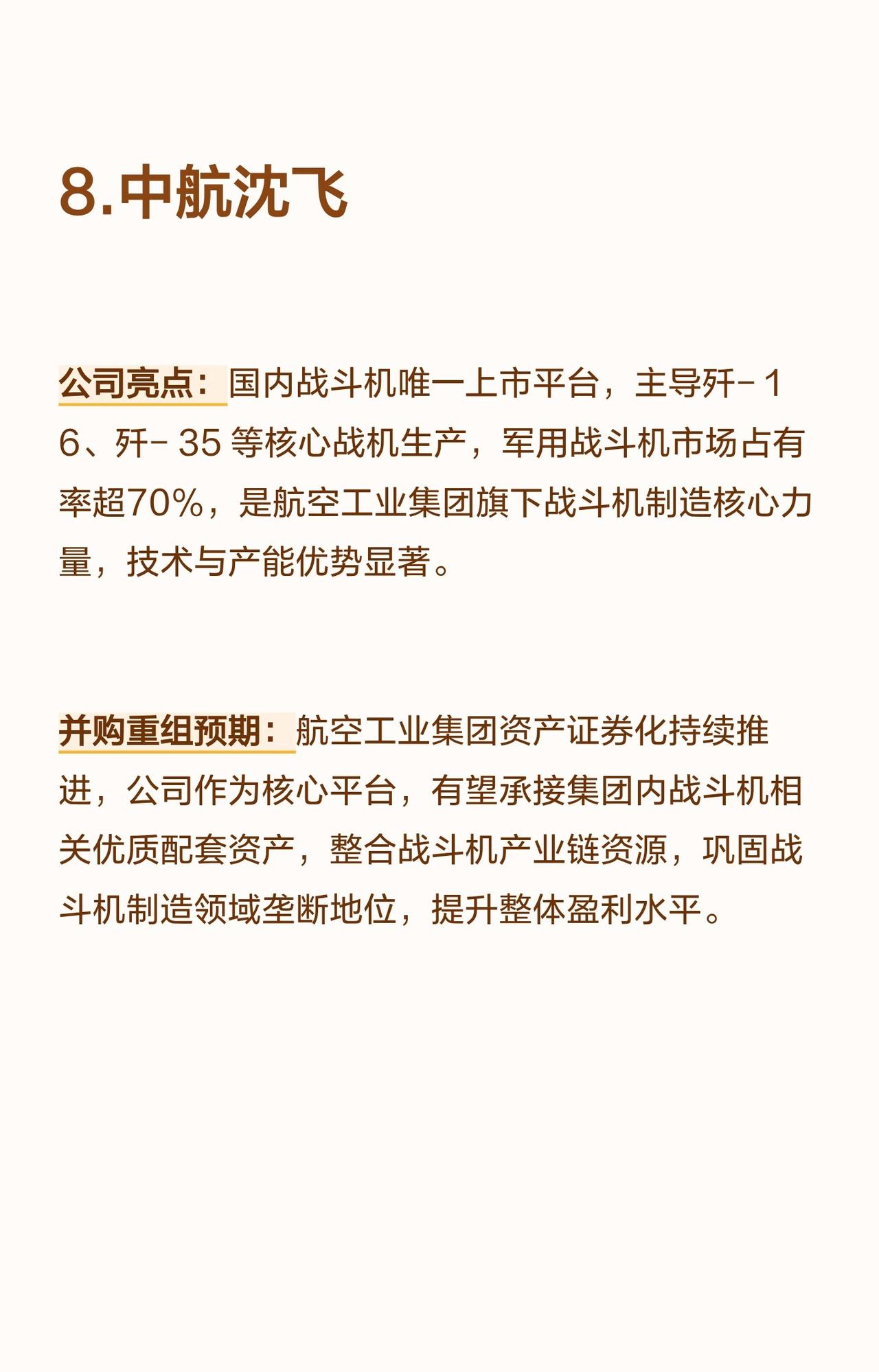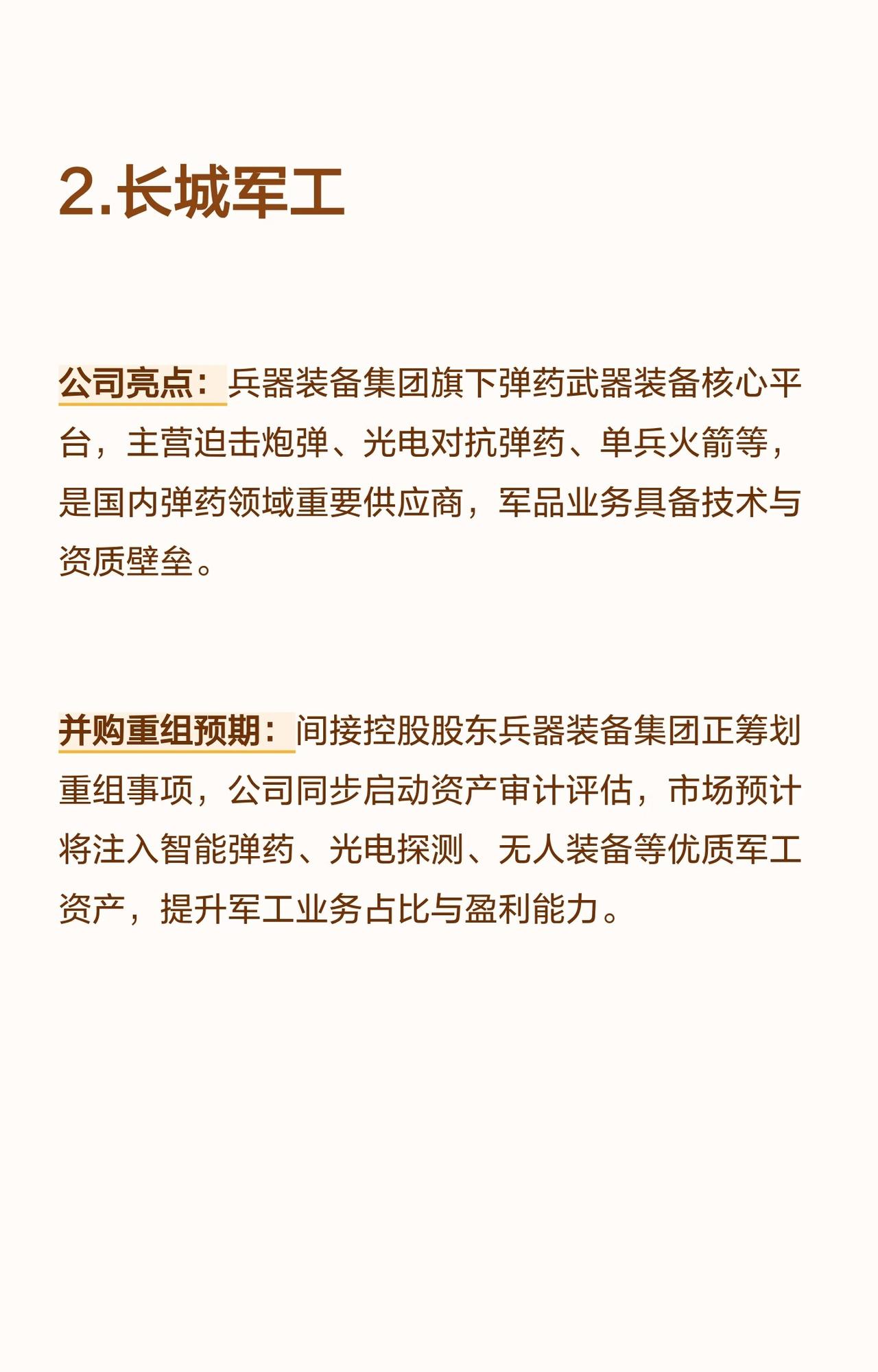 军工领域有并购重组预期的10家公司,具体公司及预期如下: 1. 雷科防务:军工电子与雷达核心企业(600+专利,KLJ-7A雷达领先),拟全资控股尧云科技,兵工集团或进一步整合; 2. 长城军工:兵装集团弹药核心平台,间接控股股东筹划重组,拟注入智能弹药等资产; 3. 建设工业:兵工集团轻武器核心上市平台,拟承接208所及无人作战系统资产; 4. 航天机电:航天科技八院唯一上市平台,市场预期八院卫星、火箭制导等资产注入; 5. 北方导航:兵工集团导航控制核心平台(参与高超音速导弹配套),拟注入无人机载荷资产; 6. 全信股份:军用光电传输核心供应商,拟通过并购补技术、扩谱系; 7. 中光学:兵装系光电防务隐形冠军,拟整合成都光明光电打造全产业链; 8. 中航沈飞:国内战斗机唯一上市平台(市占率超70%),有望承接集团战斗机配套资产。