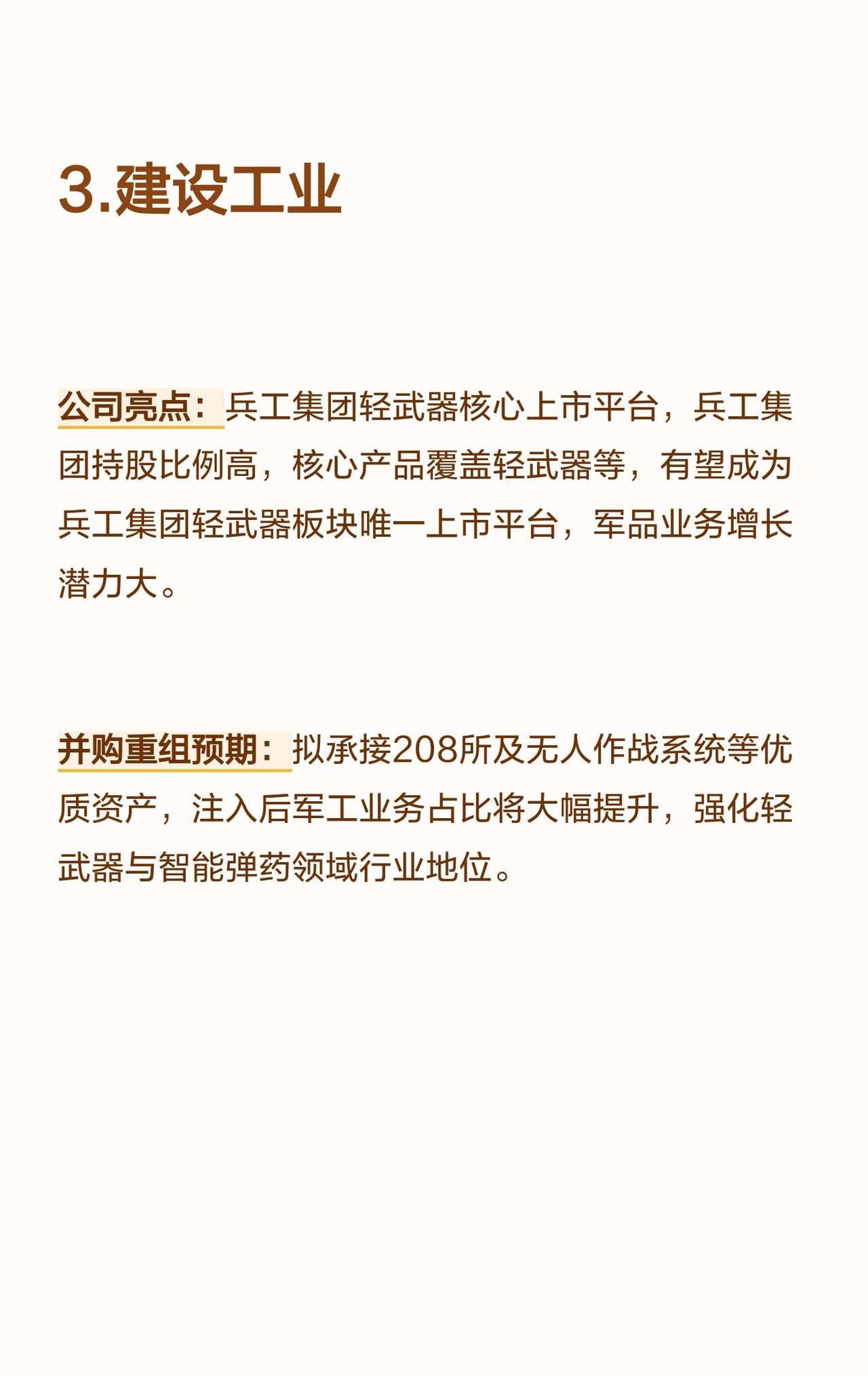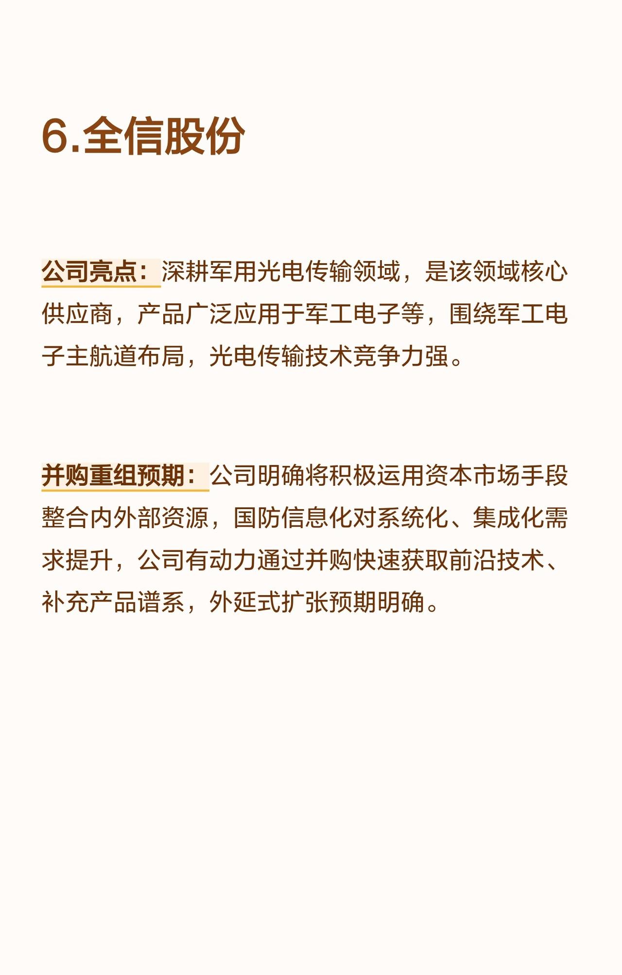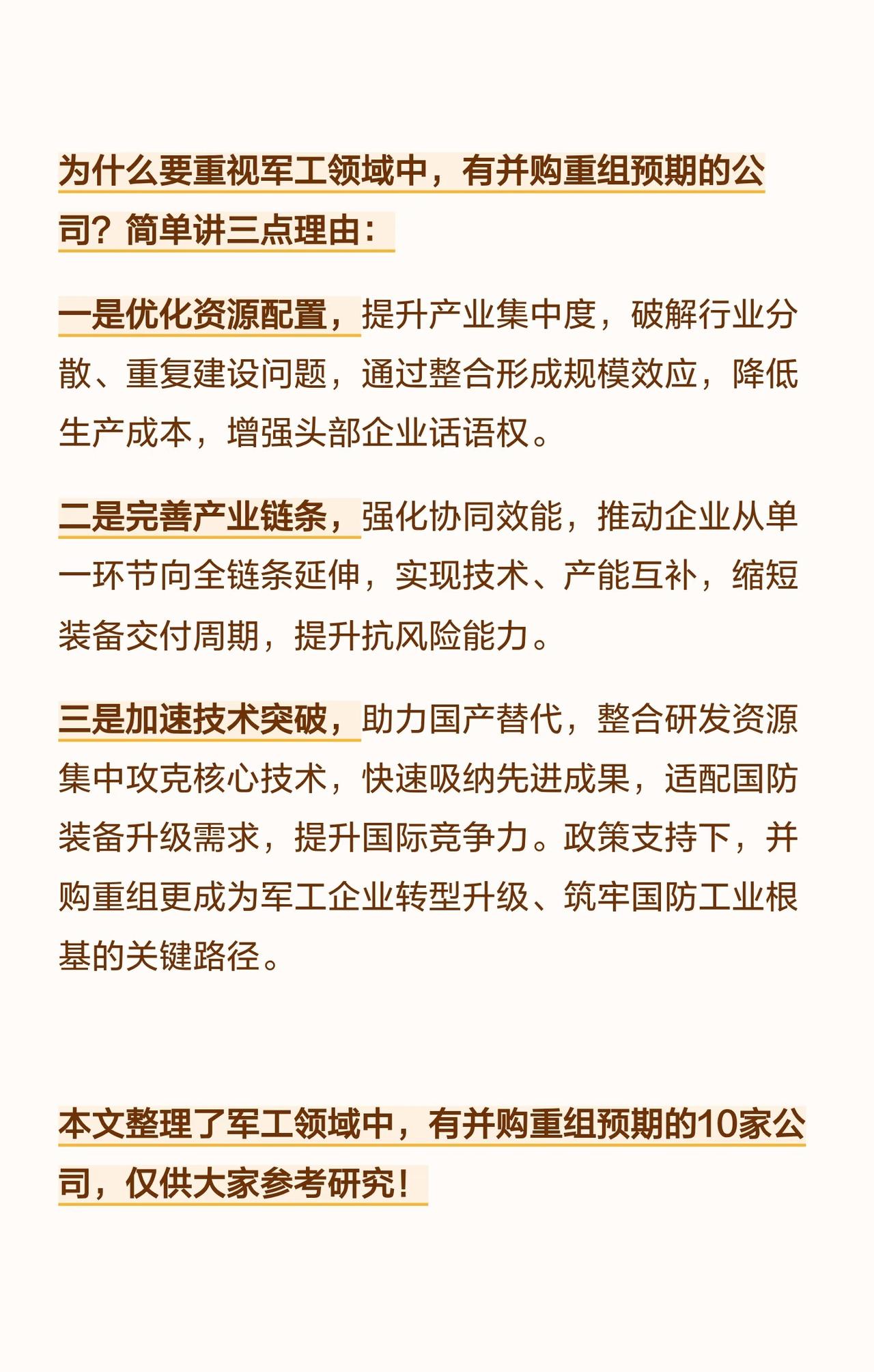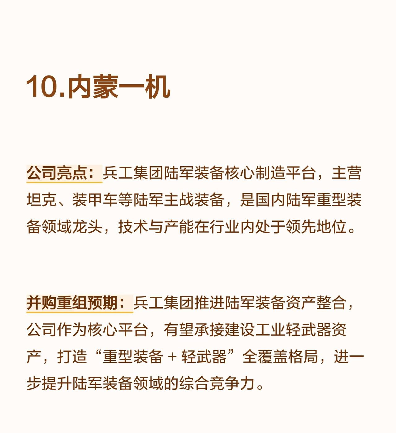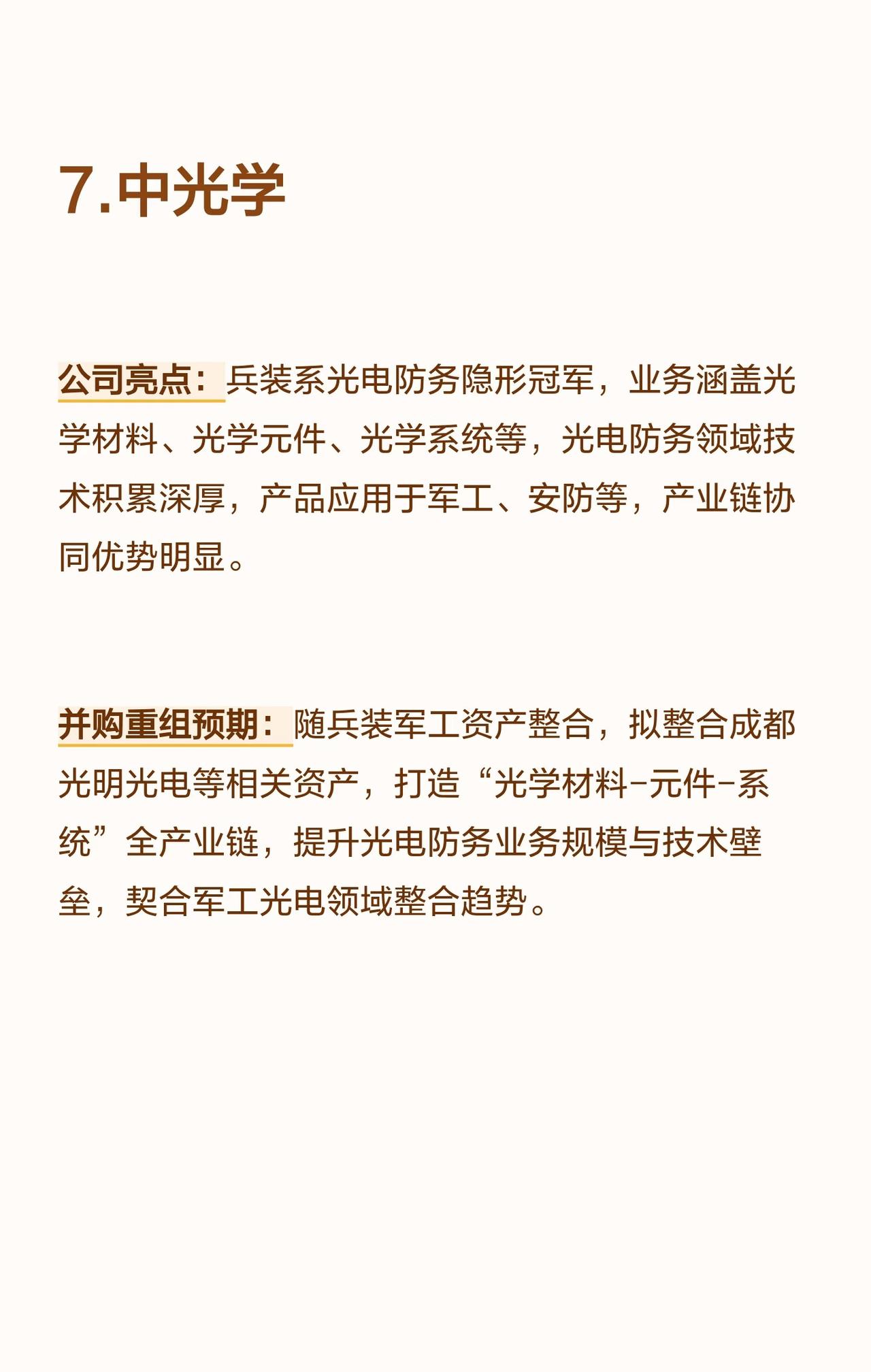 军工领域有并购重组预期的10家公司,具体公司及预期如下: 1. 雷科防务:军工电子与雷达核心企业(600+专利,KLJ-7A雷达领先),拟全资控股尧云科技,兵工集团或进一步整合; 2. 长城军工:兵装集团弹药核心平台,间接控股股东筹划重组,拟注入智能弹药等资产; 3. 建设工业:兵工集团轻武器核心上市平台,拟承接208所及无人作战系统资产; 4. 航天机电:航天科技八院唯一上市平台,市场预期八院卫星、火箭制导等资产注入; 5. 北方导航:兵工集团导航控制核心平台(参与高超音速导弹配套),拟注入无人机载荷资产; 6. 全信股份:军用光电传输核心供应商,拟通过并购补技术、扩谱系; 7. 中光学:兵装系光电防务隐形冠军,拟整合成都光明光电打造全产业链; 8. 中航沈飞:国内战斗机唯一上市平台(市占率超70%),有望承接集团战斗机配套资产。