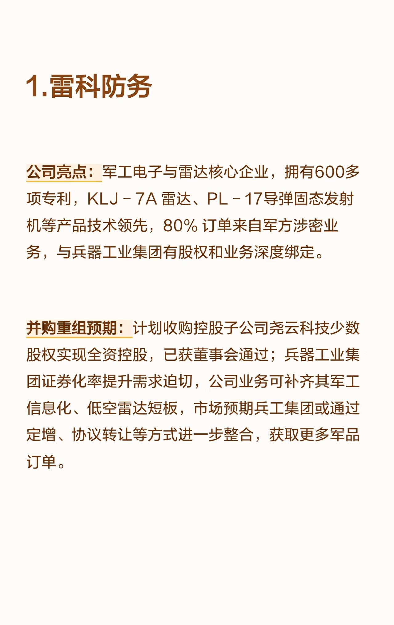 军工领域有并购重组预期的10家公司,具体公司及预期如下: 1.雷科防务:军工