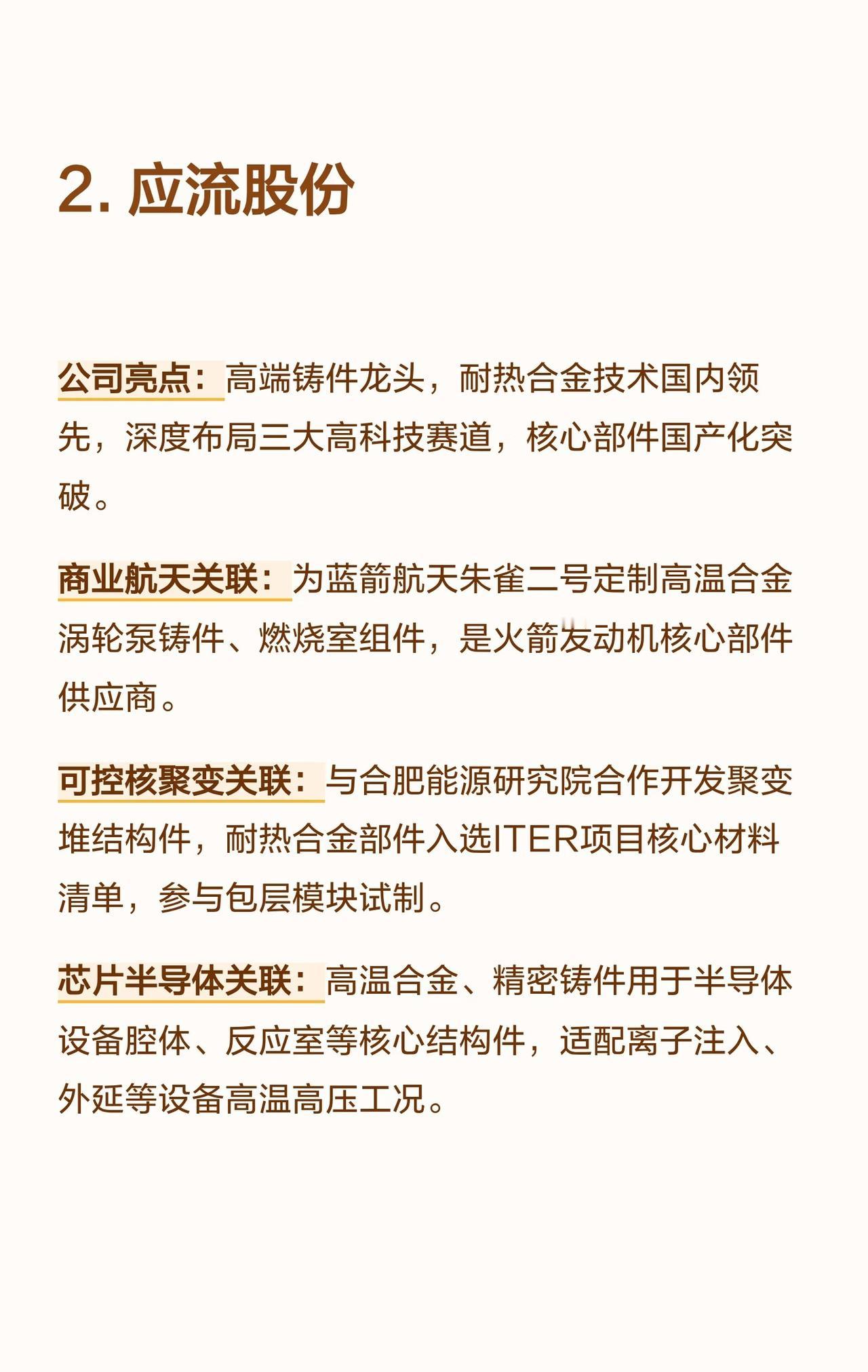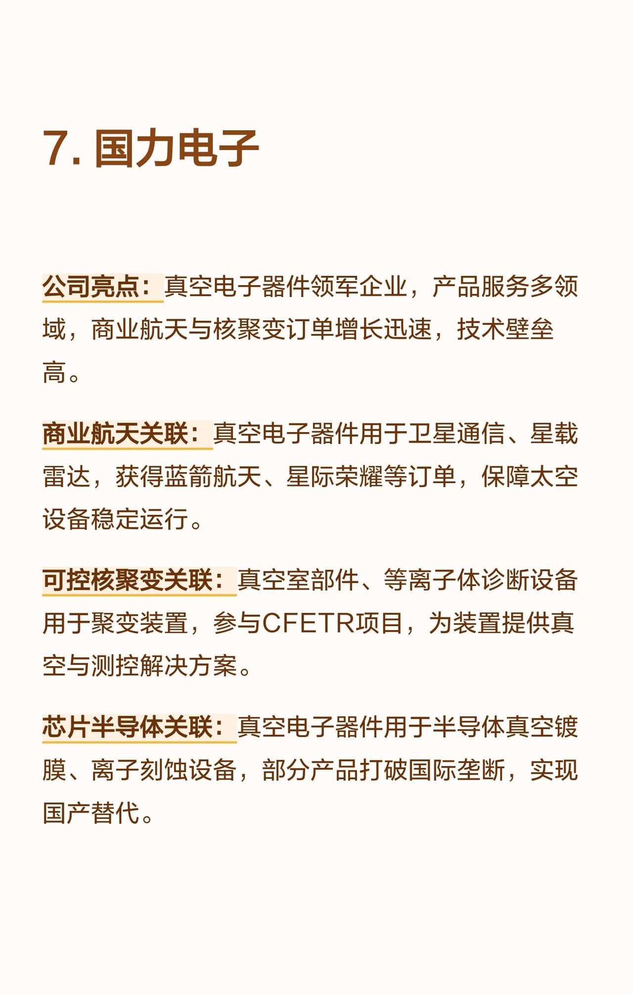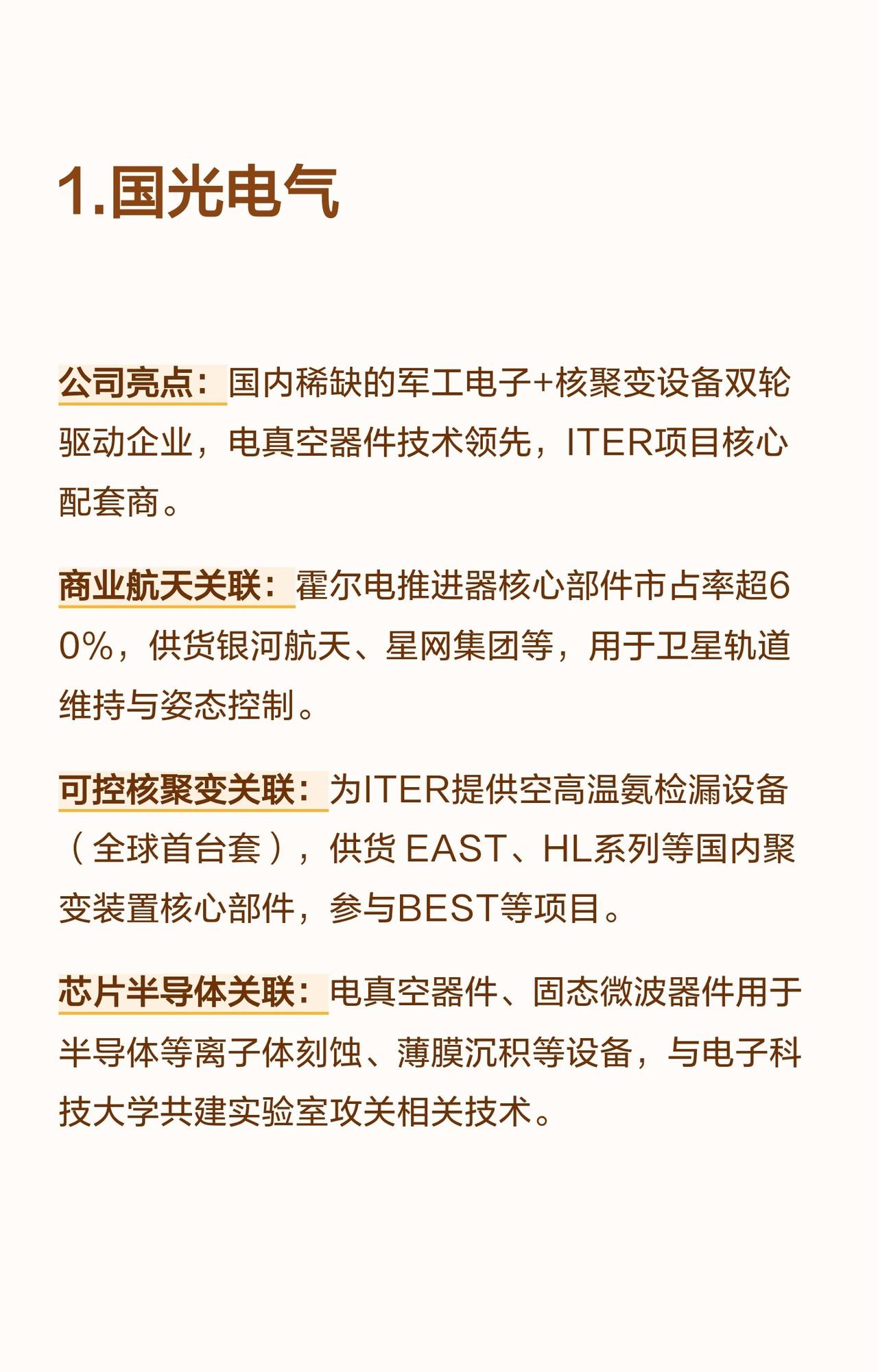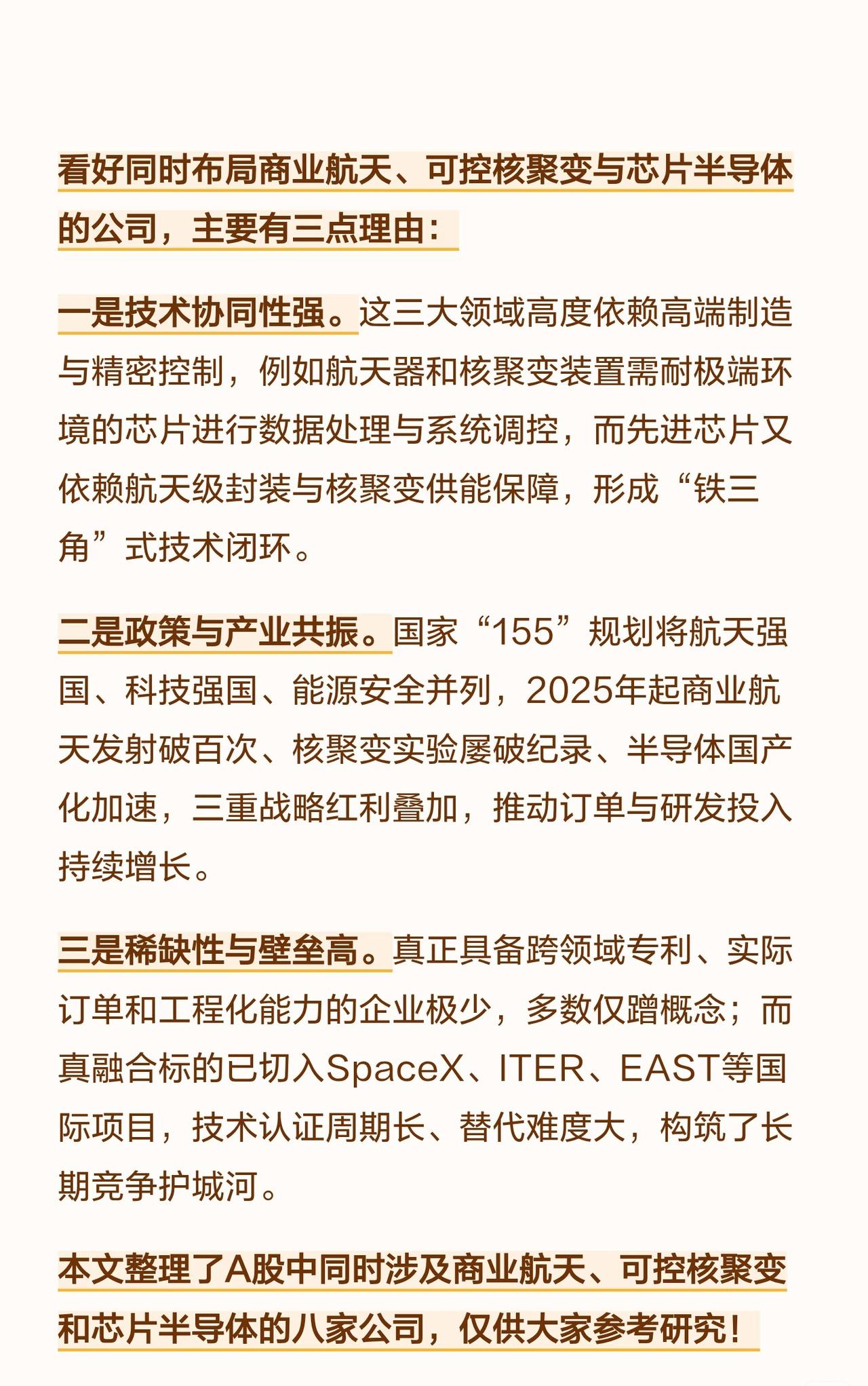 聚焦商业航天、可控核聚变、芯片半导体三大技术协同领域,分析看好相关公司的三点理由(技术闭环、政策红利、稀缺壁垒),并整理A股八家核心公司名单及各自在三大领域的布局: 1. 国光电气:军工电子+核聚变双驱动,霍尔电推进器部件市占率超60%,供货银河航天等,为ITER提供核心设备; 2. 应流股份:高端铸件龙头,为蓝箭航天定制火箭核心部件,参与ITER结构件试制,产品用于半导体设备腔体; 3. 长光华芯:高功率激光芯片龙头,芯片用于卫星激光通信,为激光核聚变开发高脉冲芯片,部分半导体制造用芯片进口替代; 4. 永鼎股份:超导+线缆双轮驱动,耐超低温电缆获航天认证,超导带材用于聚变磁体,光模块用于芯片数据传输; 5. 上大股份:特种合金龙头,为蓝箭等供火箭热端材料,向BEST堆交付合金,适配半导体高端设备; 6. 联创光电:央企合作,参股电磁发射公司(获实单),超导磁体用于聚变装置,技术赋能芯片磁控溅射设备; 7. 国力电子:真空电子领军,器件用于卫星通信/雷达(获蓝箭订单),参与CFETR项目,产品用于半导体刻蚀设备(打破垄断); 8. 斯瑞新材:3D打印+铜合金优势,全球独家供朱雀火箭推力室内壁,供货聚变堆第一壁,铜合金用于芯片散热。
