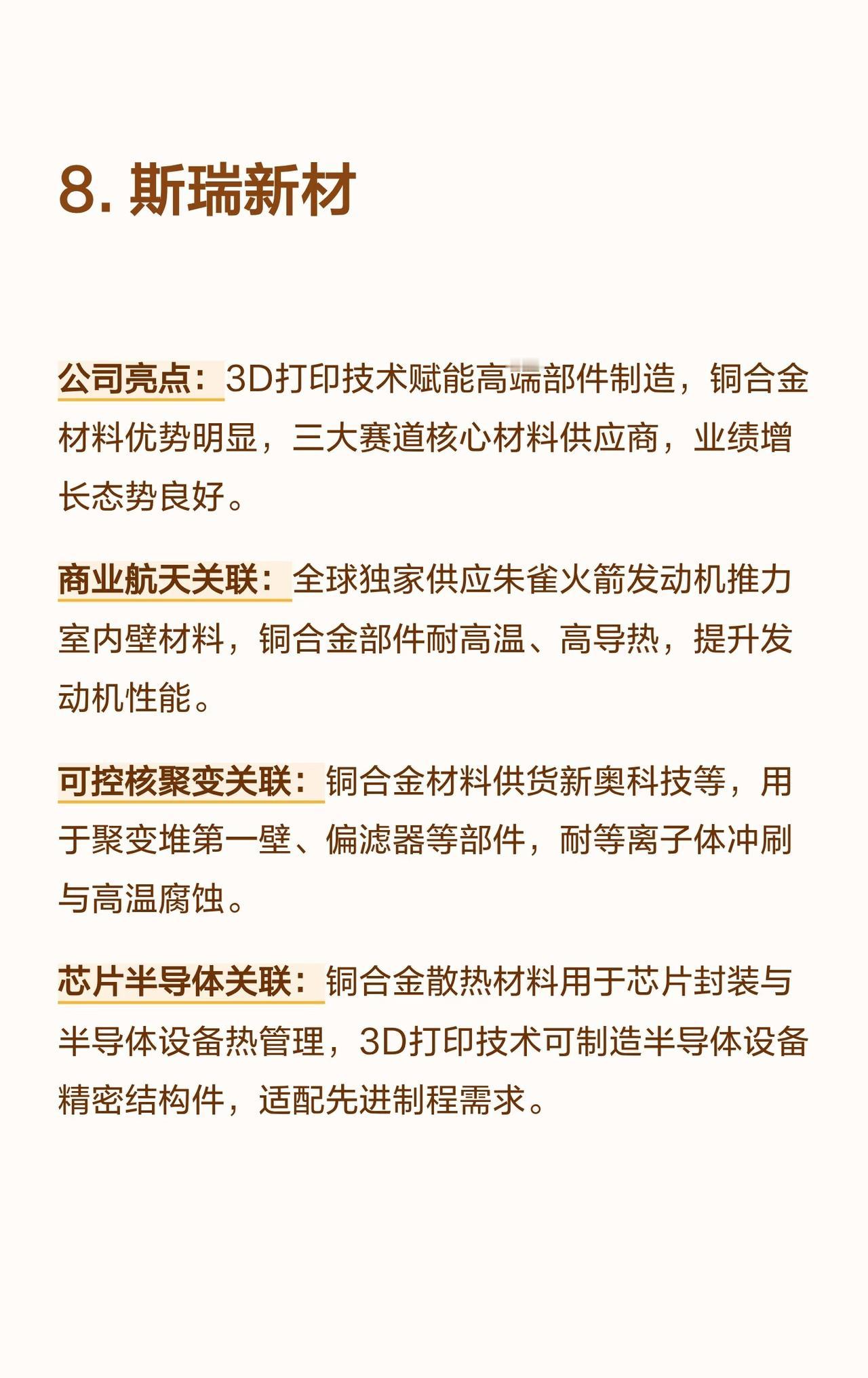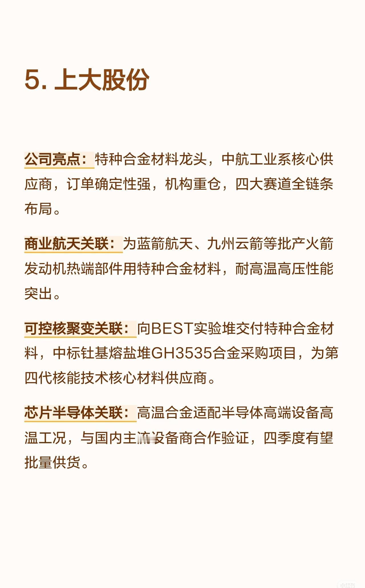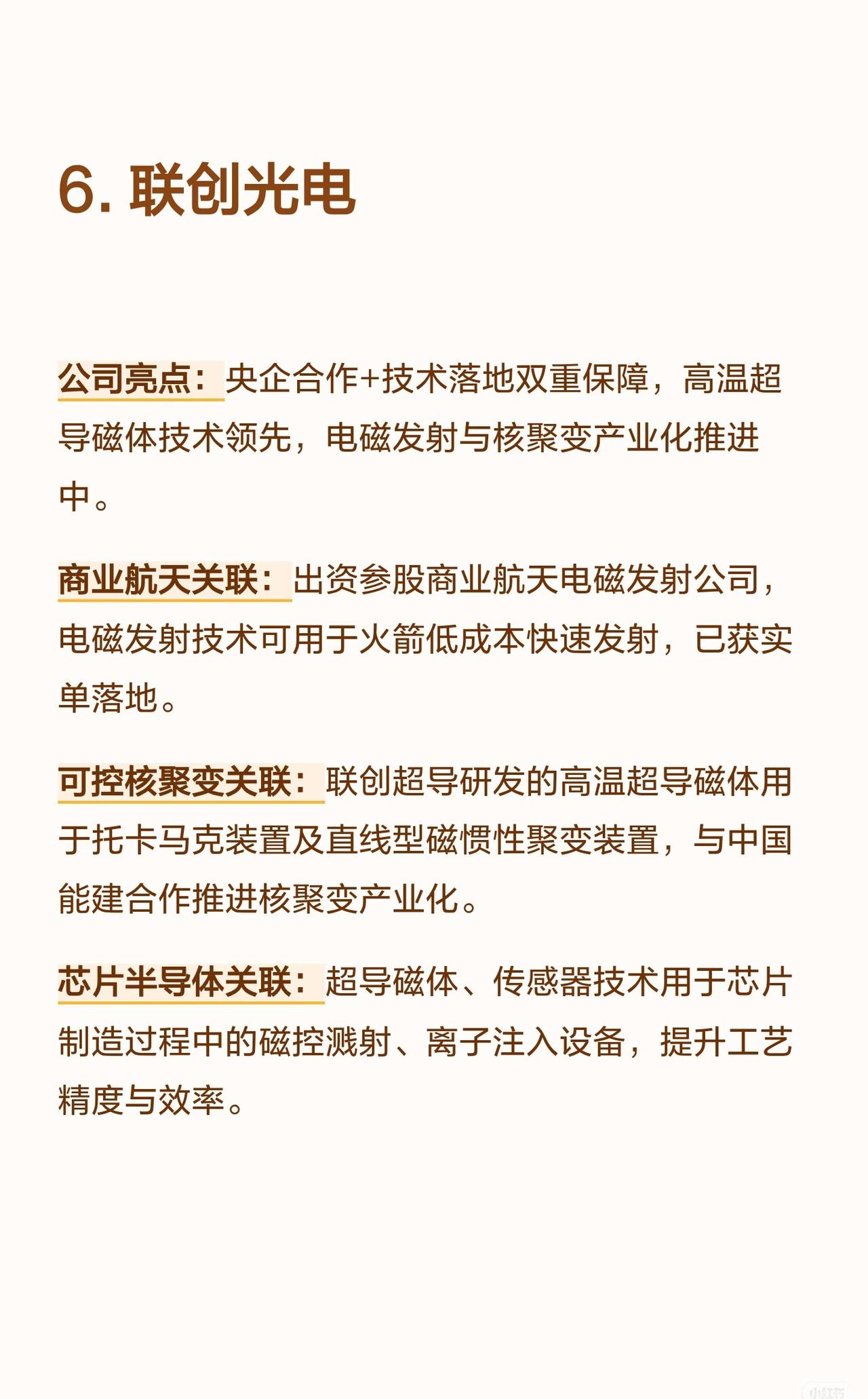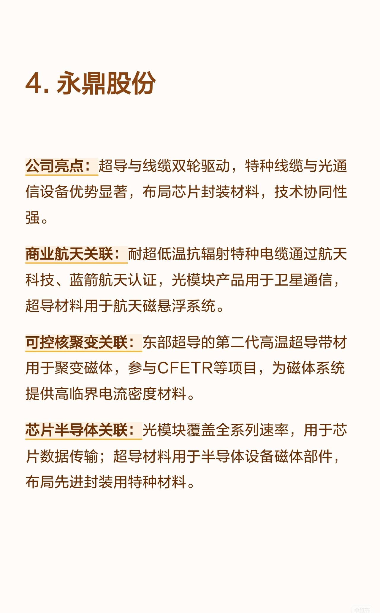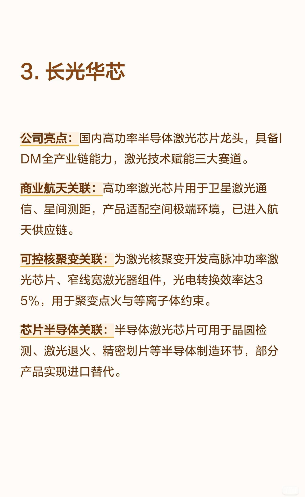聚焦商业航天、可控核聚变、芯片半导体三大技术协同领域,分析看好相关公司的三点理由(技术闭环、政策红利、稀缺壁垒),并整理A股八家核心公司名单及各自在三大领域的布局: 1. 国光电气:军工电子+核聚变双驱动,霍尔电推进器部件市占率超60%,供货银河航天等,为ITER提供核心设备; 2. 应流股份:高端铸件龙头,为蓝箭航天定制火箭核心部件,参与ITER结构件试制,产品用于半导体设备腔体; 3. 长光华芯:高功率激光芯片龙头,芯片用于卫星激光通信,为激光核聚变开发高脉冲芯片,部分半导体制造用芯片进口替代; 4. 永鼎股份:超导+线缆双轮驱动,耐超低温电缆获航天认证,超导带材用于聚变磁体,光模块用于芯片数据传输; 5. 上大股份:特种合金龙头,为蓝箭等供火箭热端材料,向BEST堆交付合金,适配半导体高端设备; 6. 联创光电:央企合作,参股电磁发射公司(获实单),超导磁体用于聚变装置,技术赋能芯片磁控溅射设备; 7. 国力电子:真空电子领军,器件用于卫星通信/雷达(获蓝箭订单),参与CFETR项目,产品用于半导体刻蚀设备(打破垄断); 8. 斯瑞新材:3D打印+铜合金优势,全球独家供朱雀火箭推力室内壁,供货聚变堆第一壁,铜合金用于芯片散热。